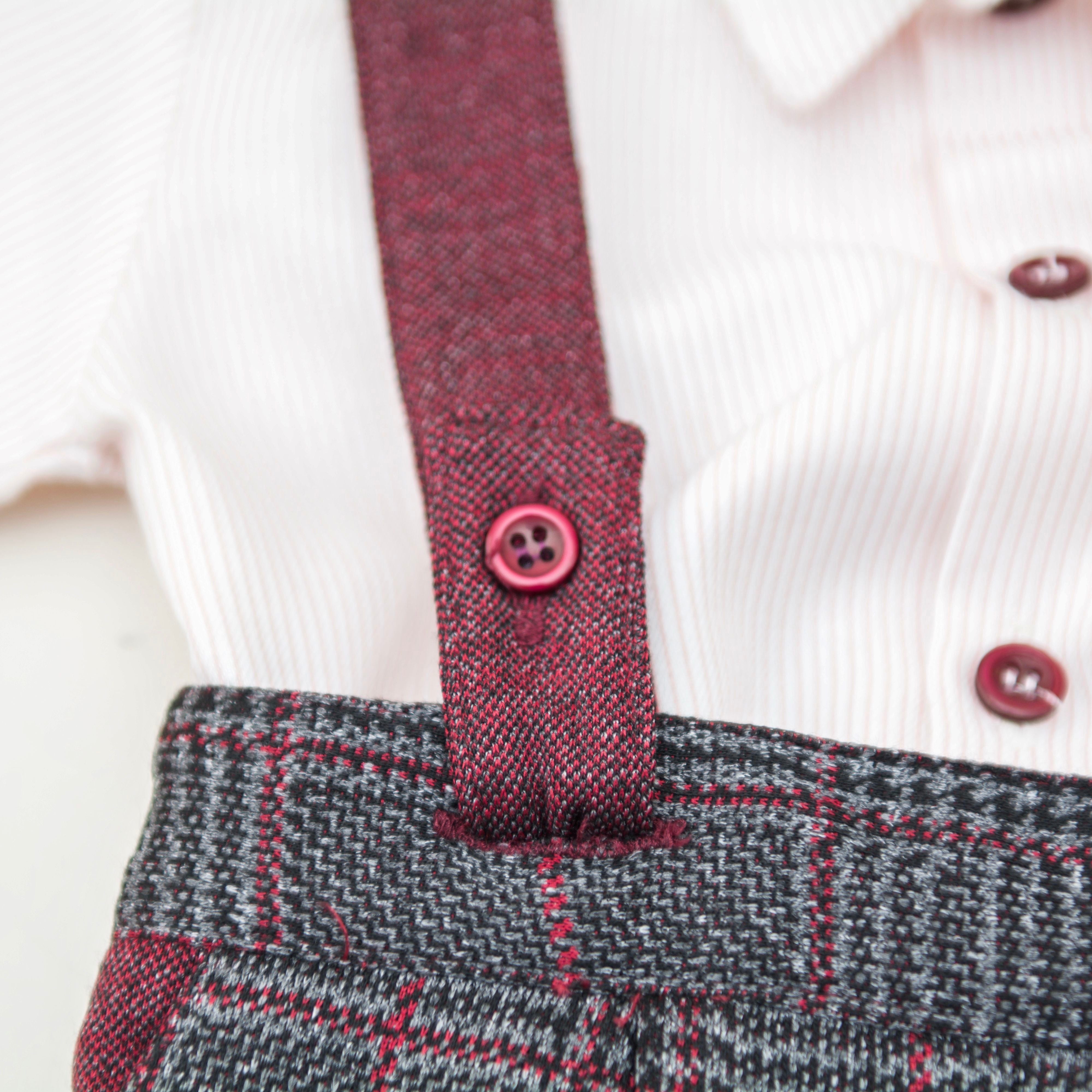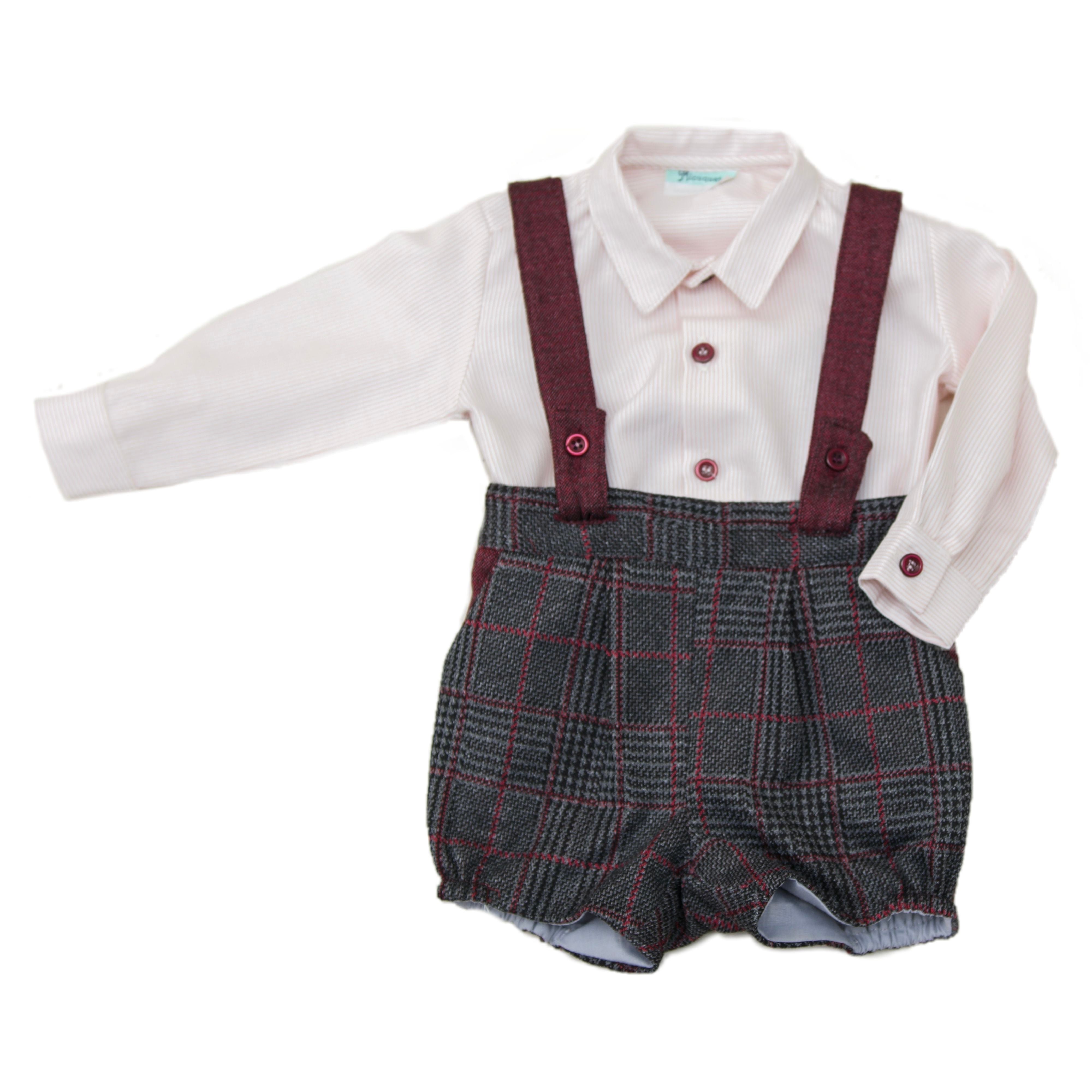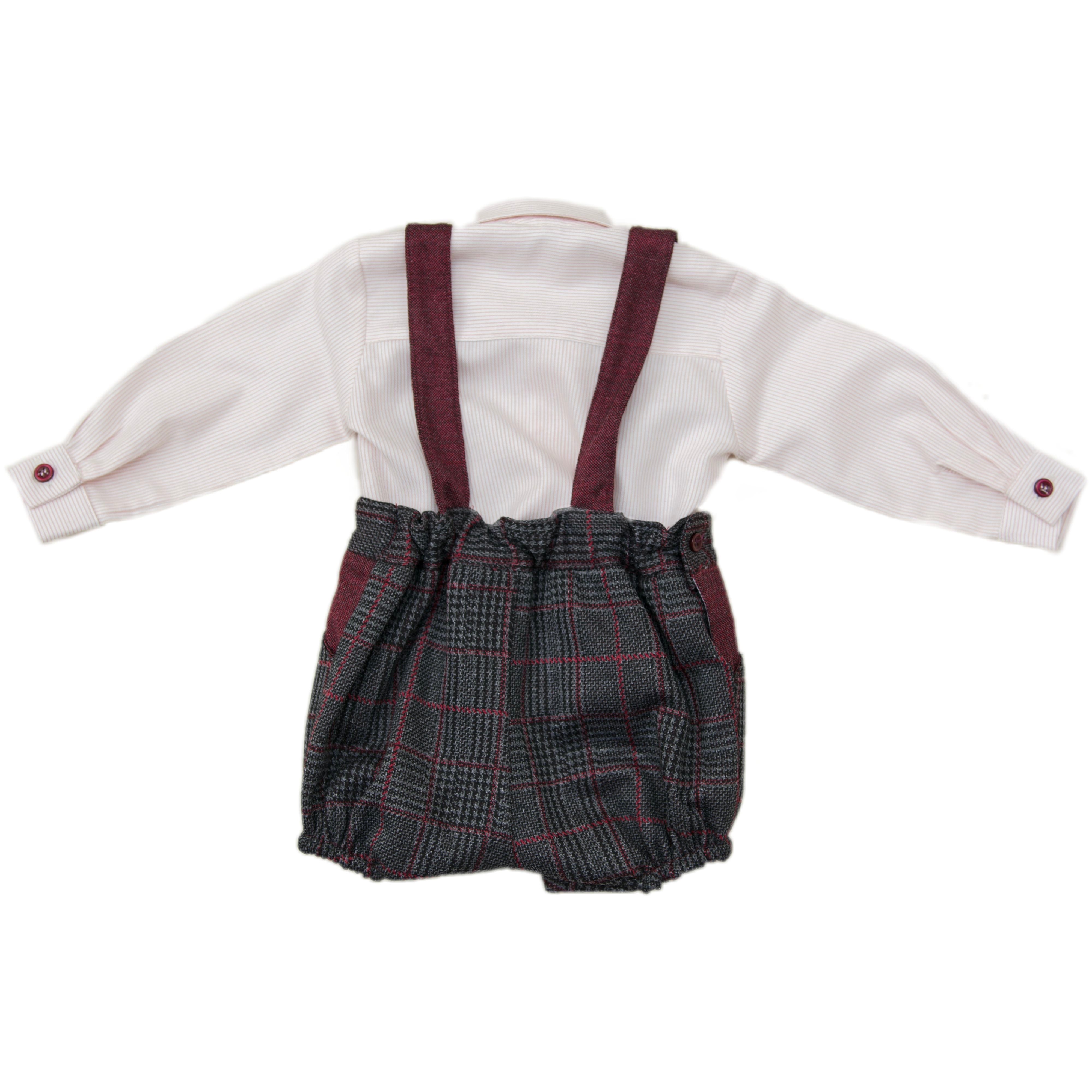 Bombacho en tela de poliester forrado y camisa de algodón de rayas español, manga larga con botones en color vino. También disponible versión para niña.