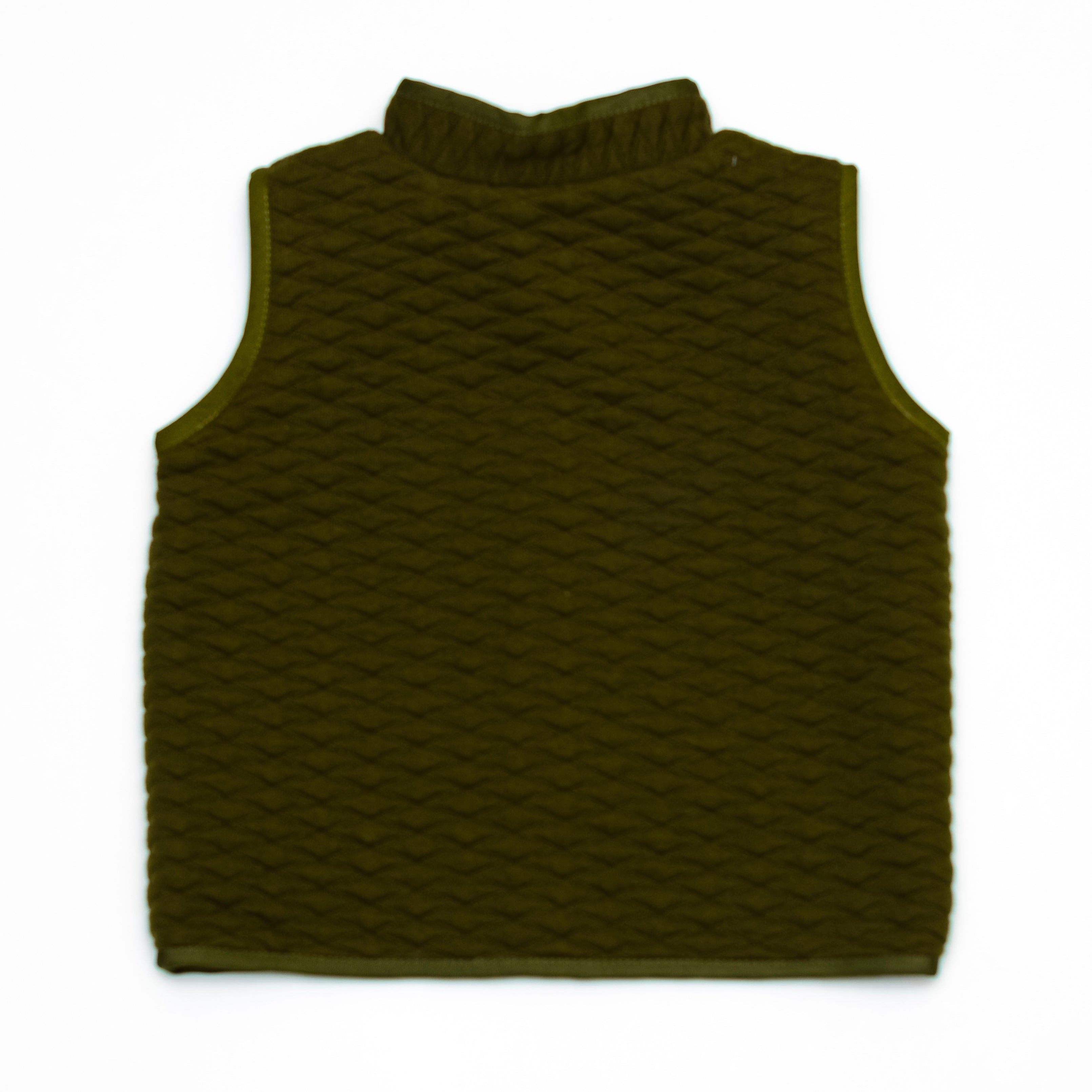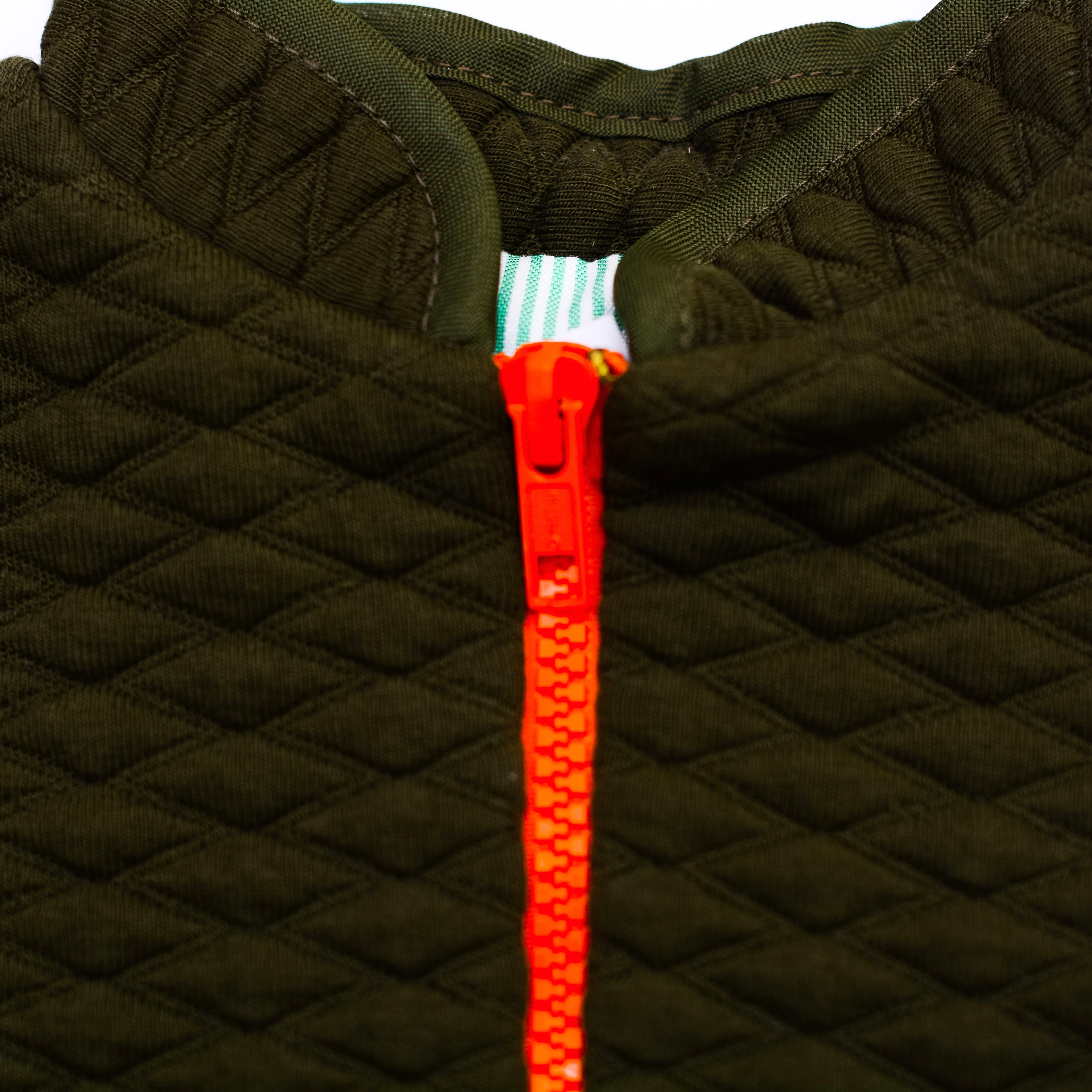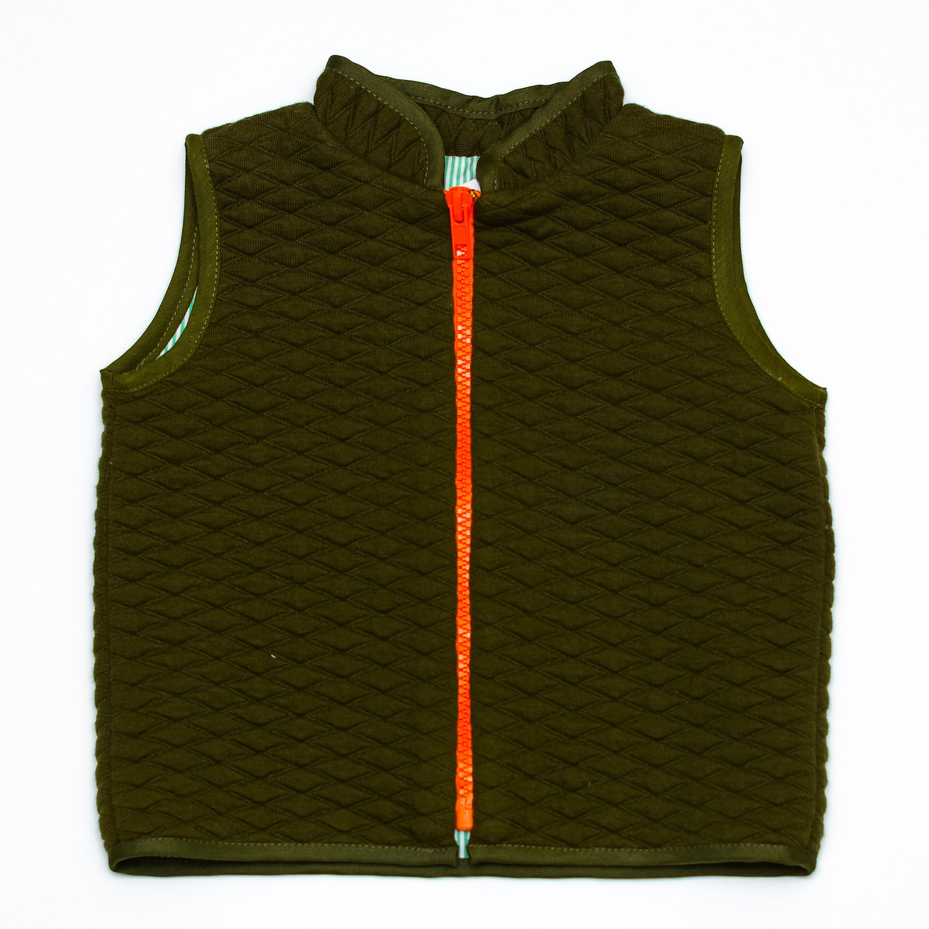 Chaleco en algodón capitonado con forro en algodón rayado, cierre en color naranja y vivos en color verde.