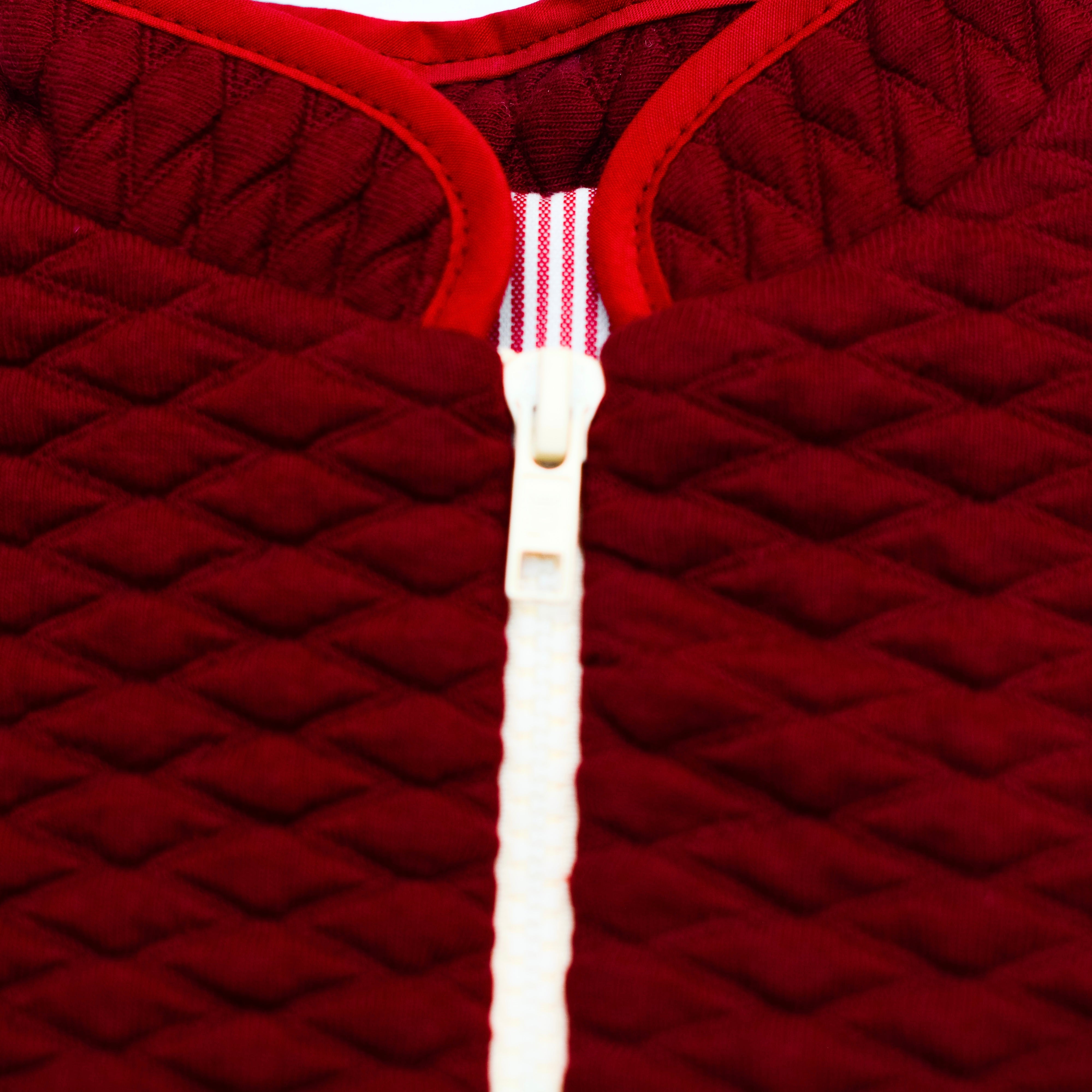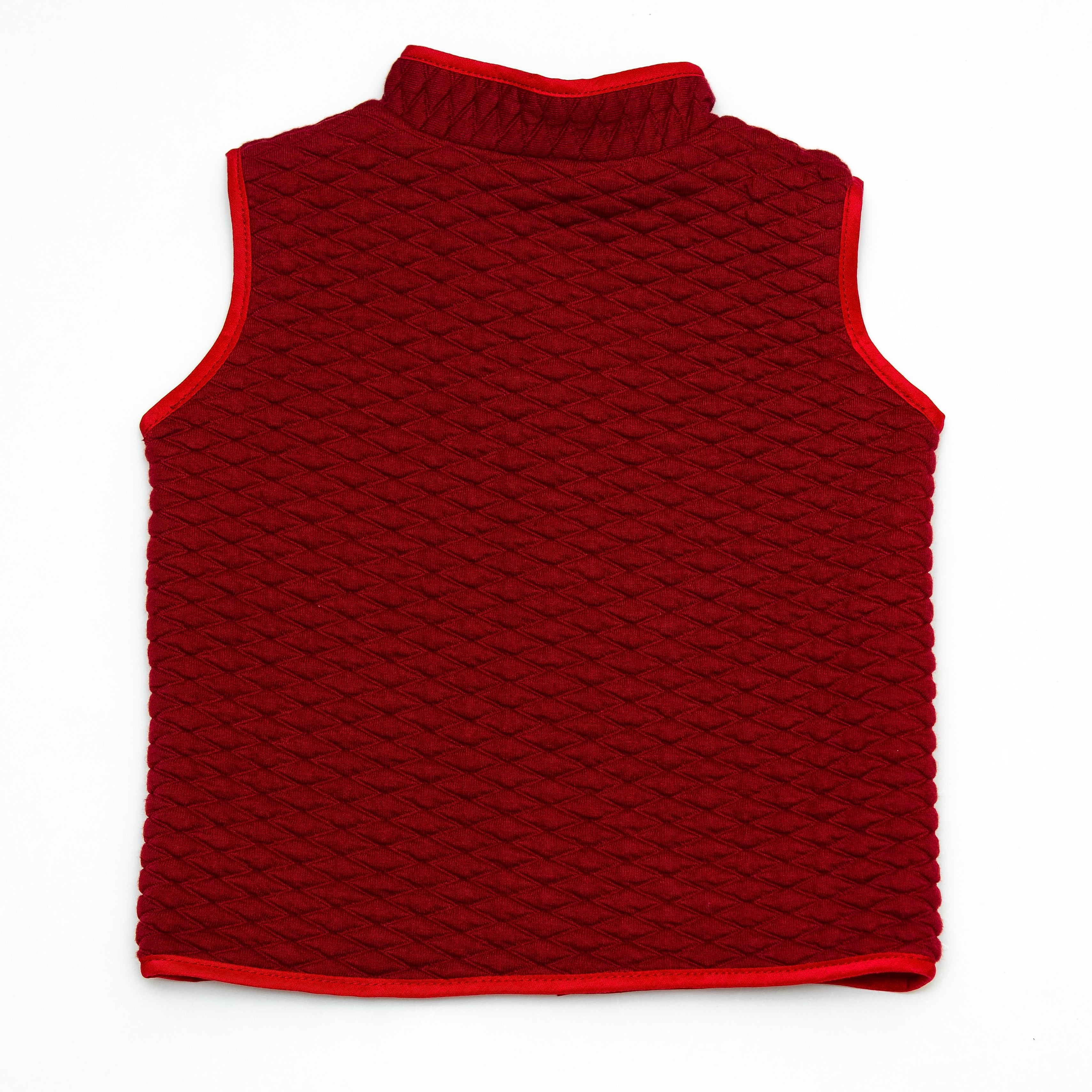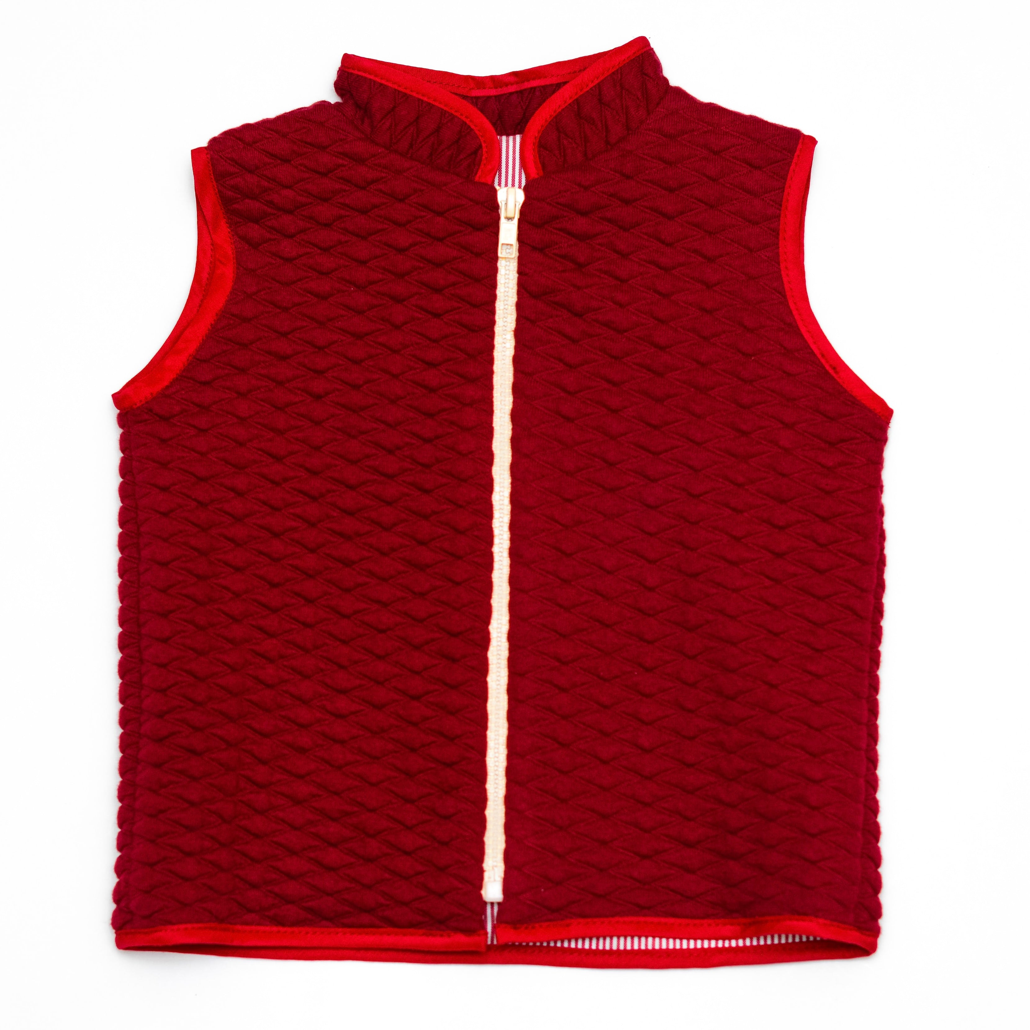 Chaleco en algodón capitonado con forro en algodón de rayas y cierre en color crudo, vivos en color vino.