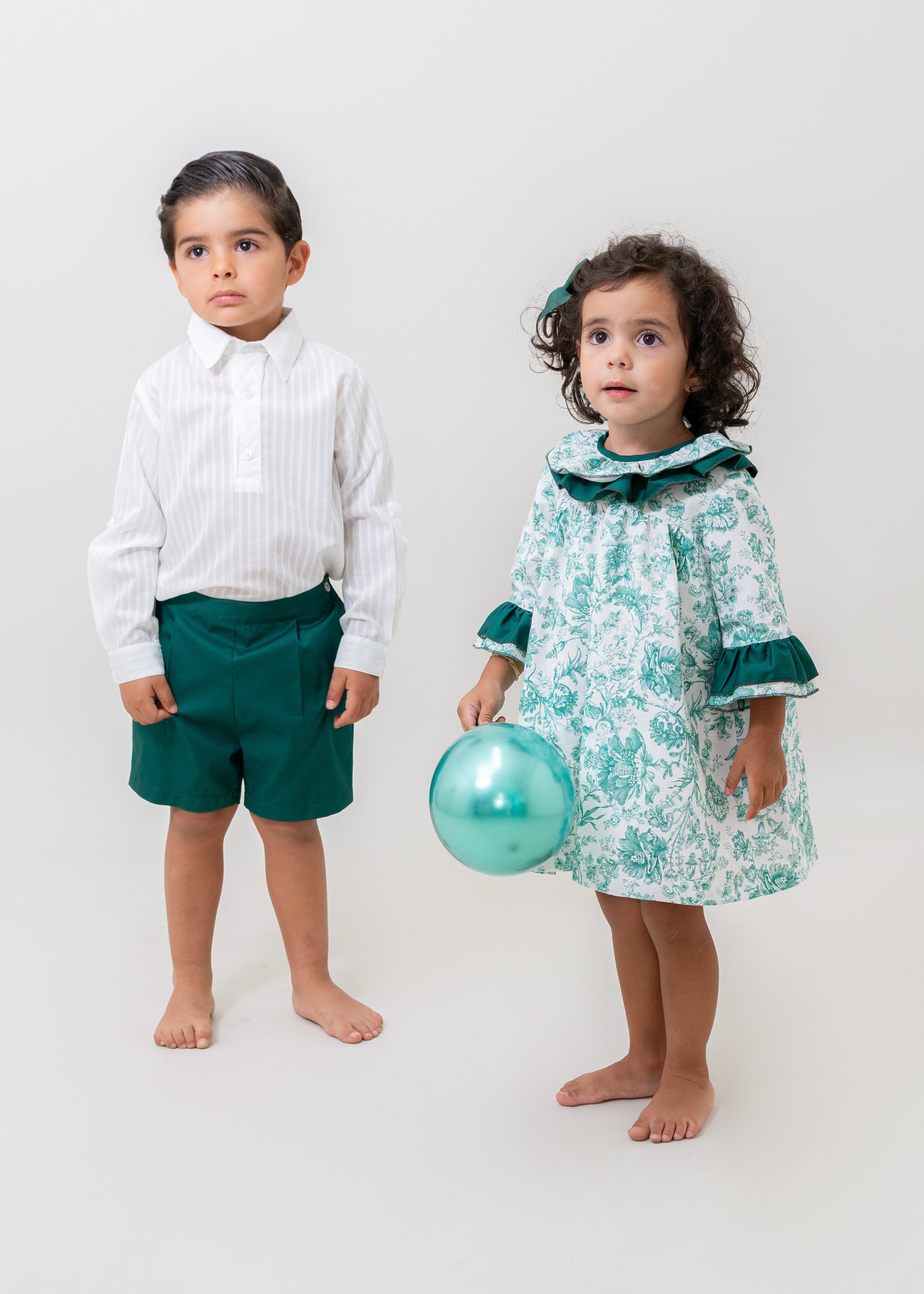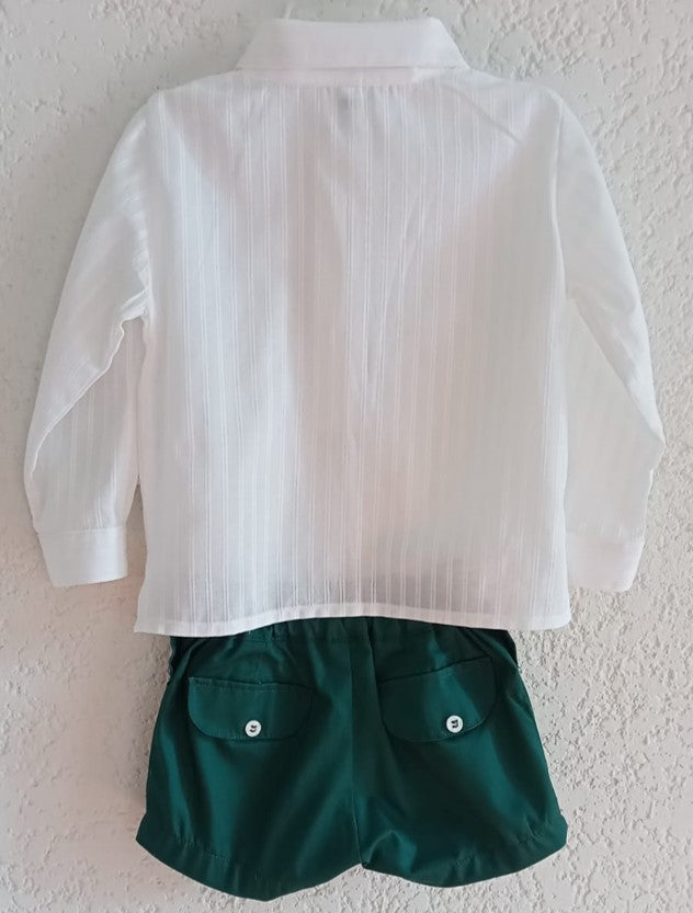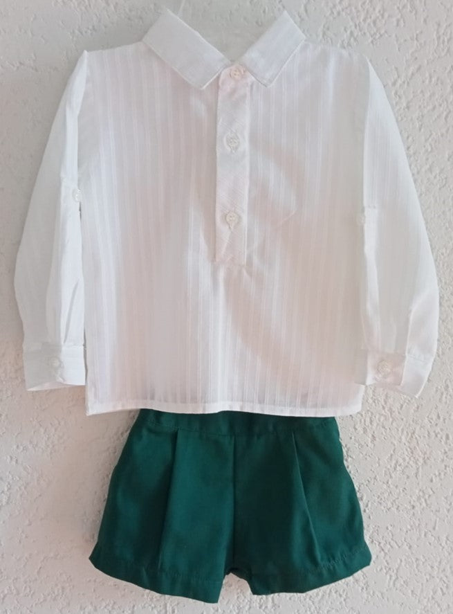 Camisa de algodón de rayas blanco, manga larga con remango, cuello sport. Bermuda de gabardina verde con forro y elástico para ajustar en cintura.