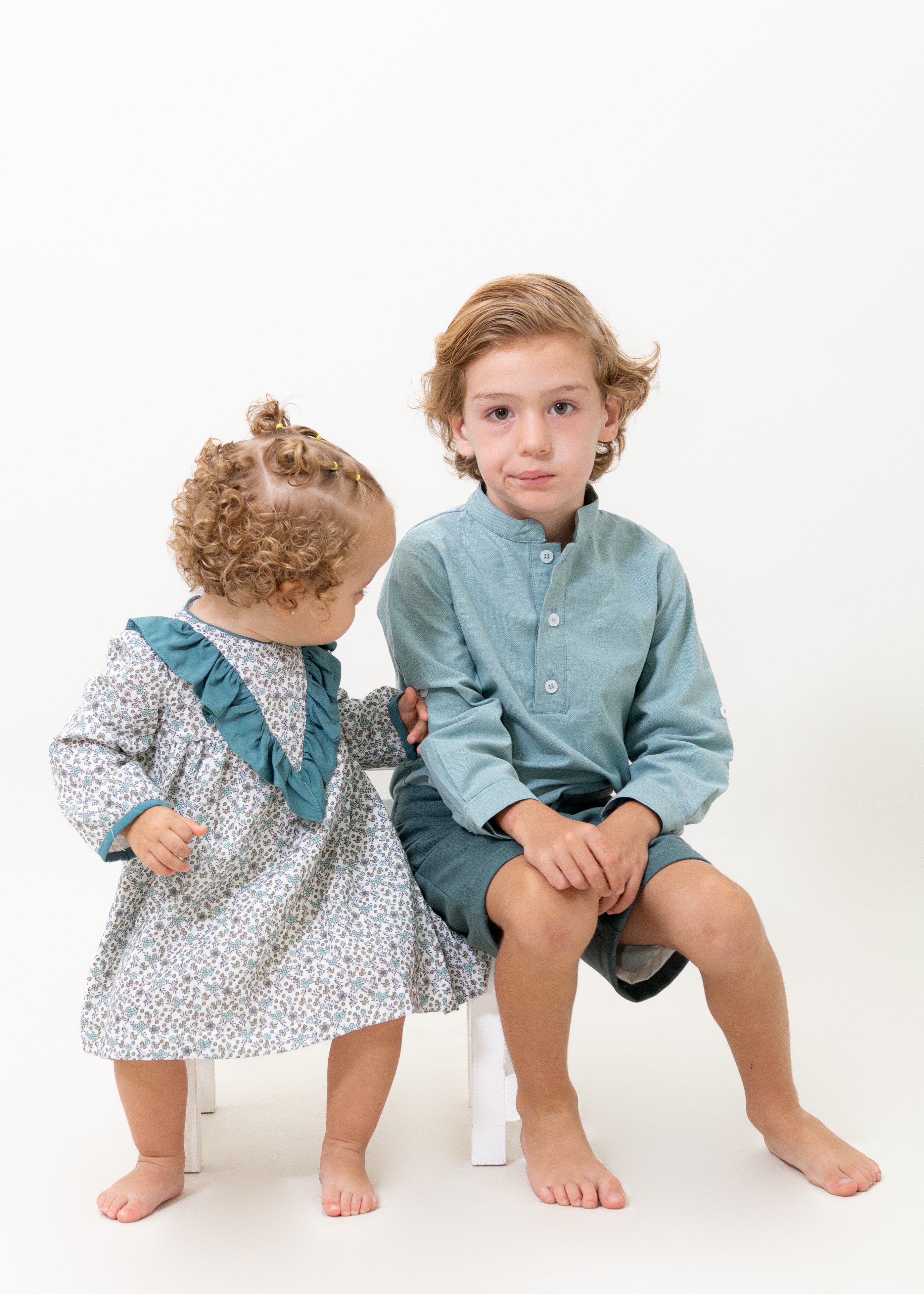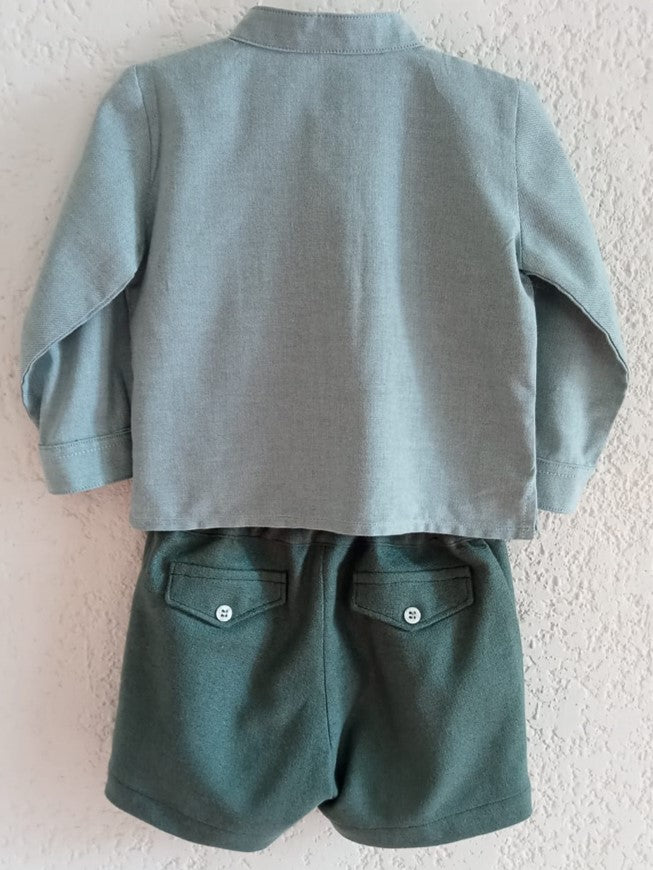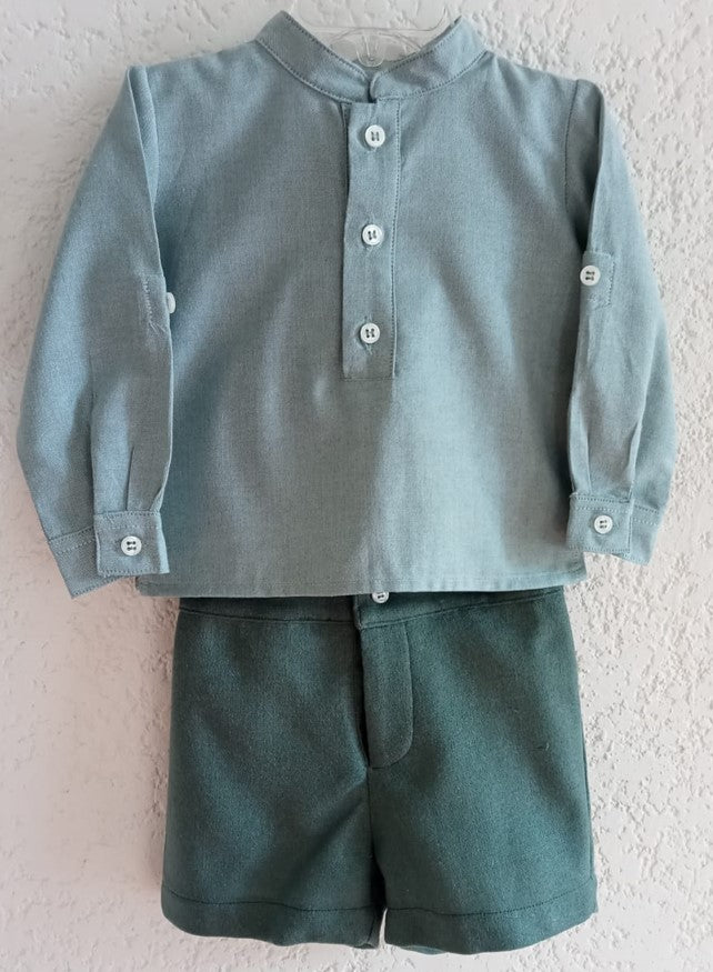 Camisa de algodón verde manga larga con remango, cuello mao, Bermuda de lana verde con forro y elástico para ajustar en cintura.