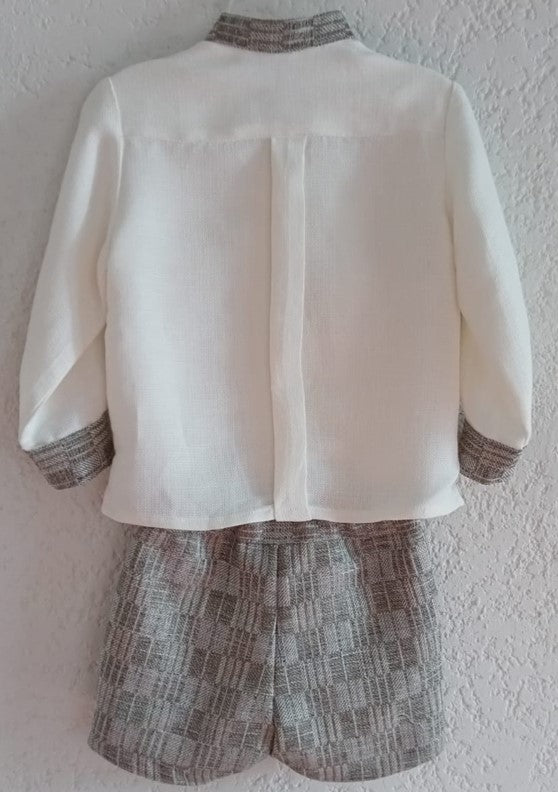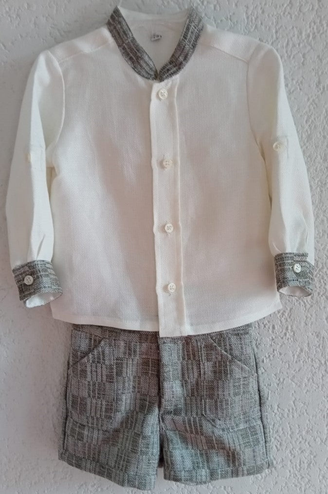 Camisa de algodón crudo, manga larga con remango, cuello mao con vista de lino. Bermuda de lino de cuadros verde seco con forro y elástico para ajustar en cintura.
