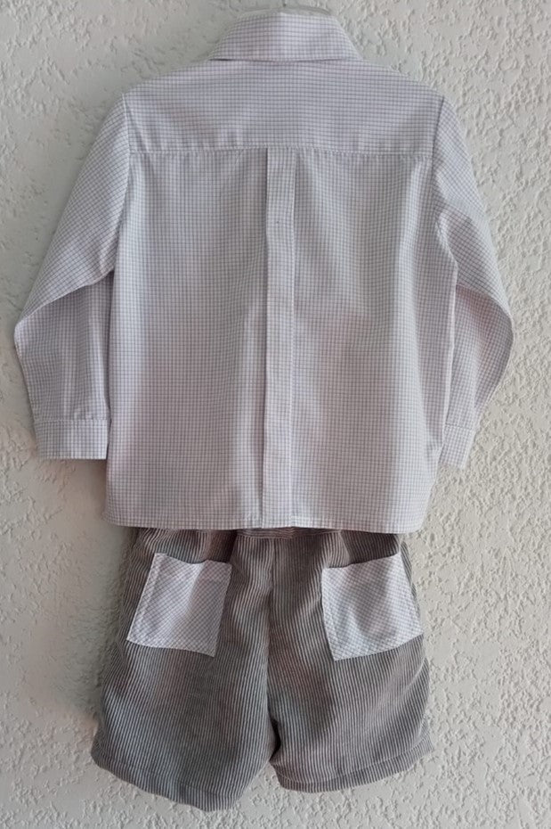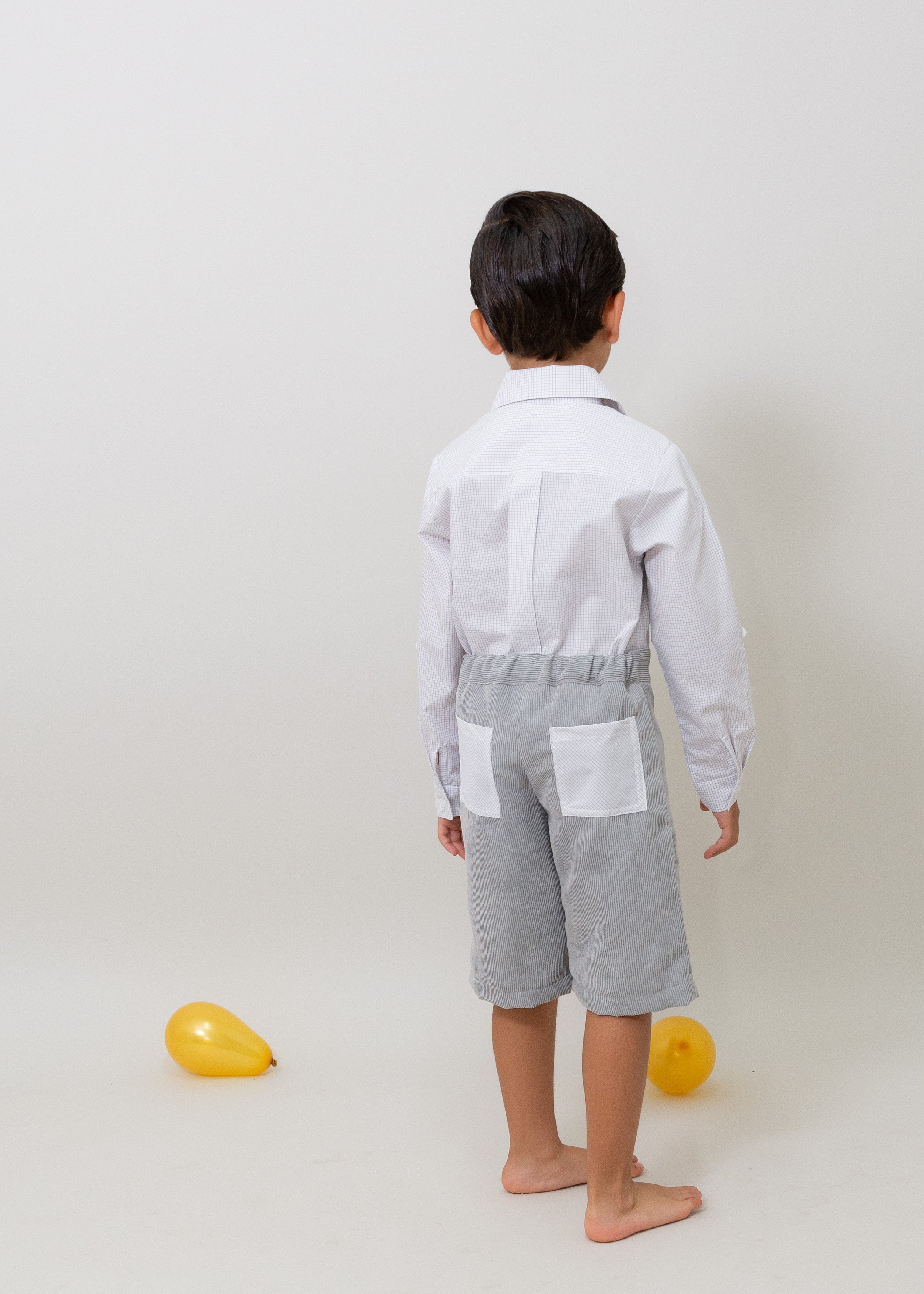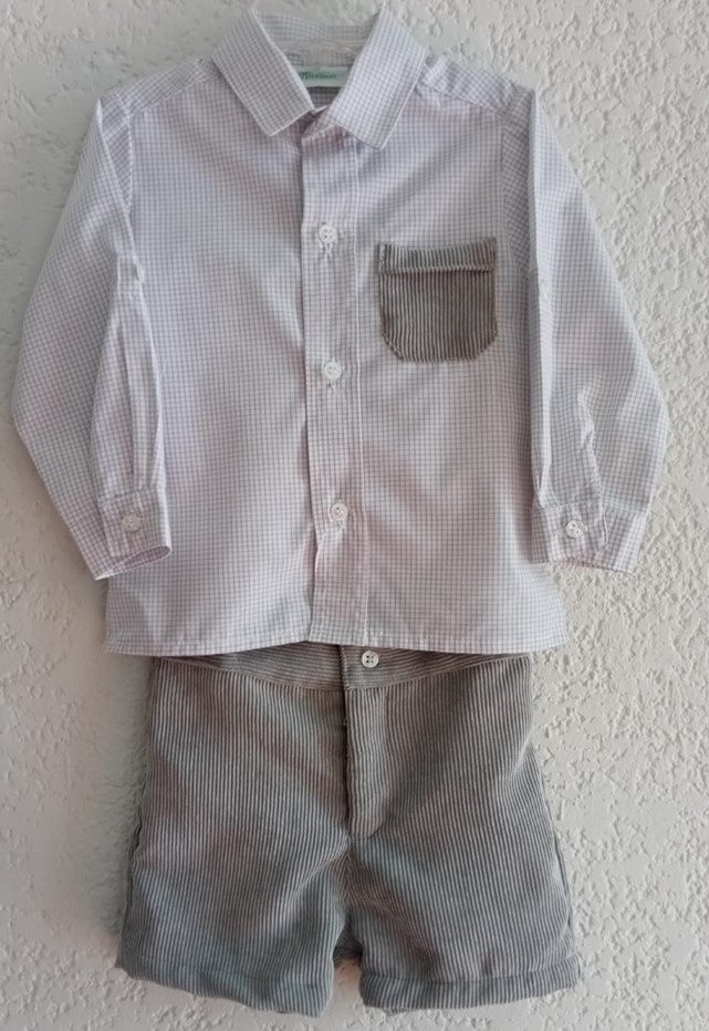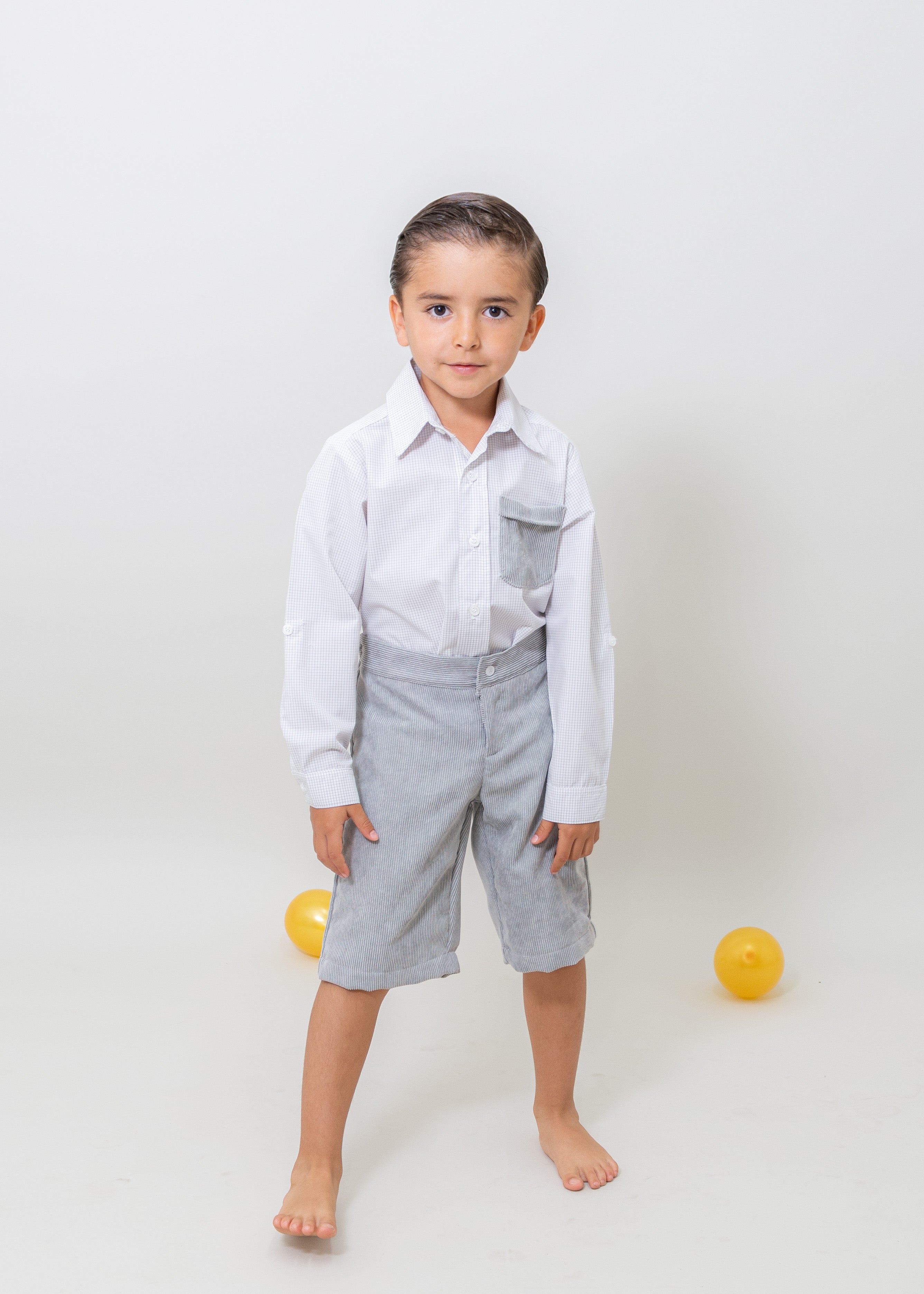 Camisa de algodón de cuadros gris manga larga con remango, bolsa de pana a un lado, cuello sport. Bermuda de pana gris con forro y elástico para ajustar en cintura.