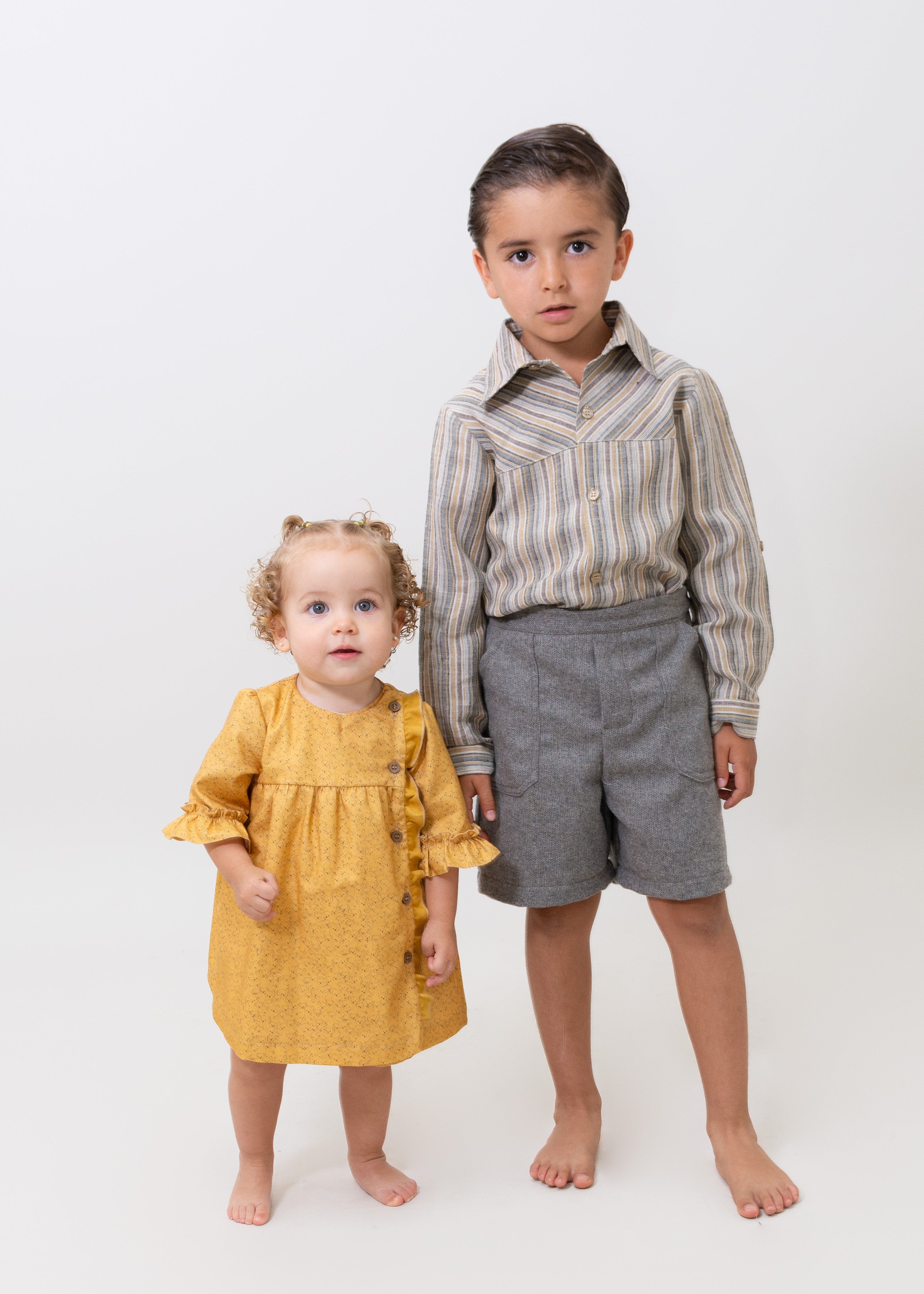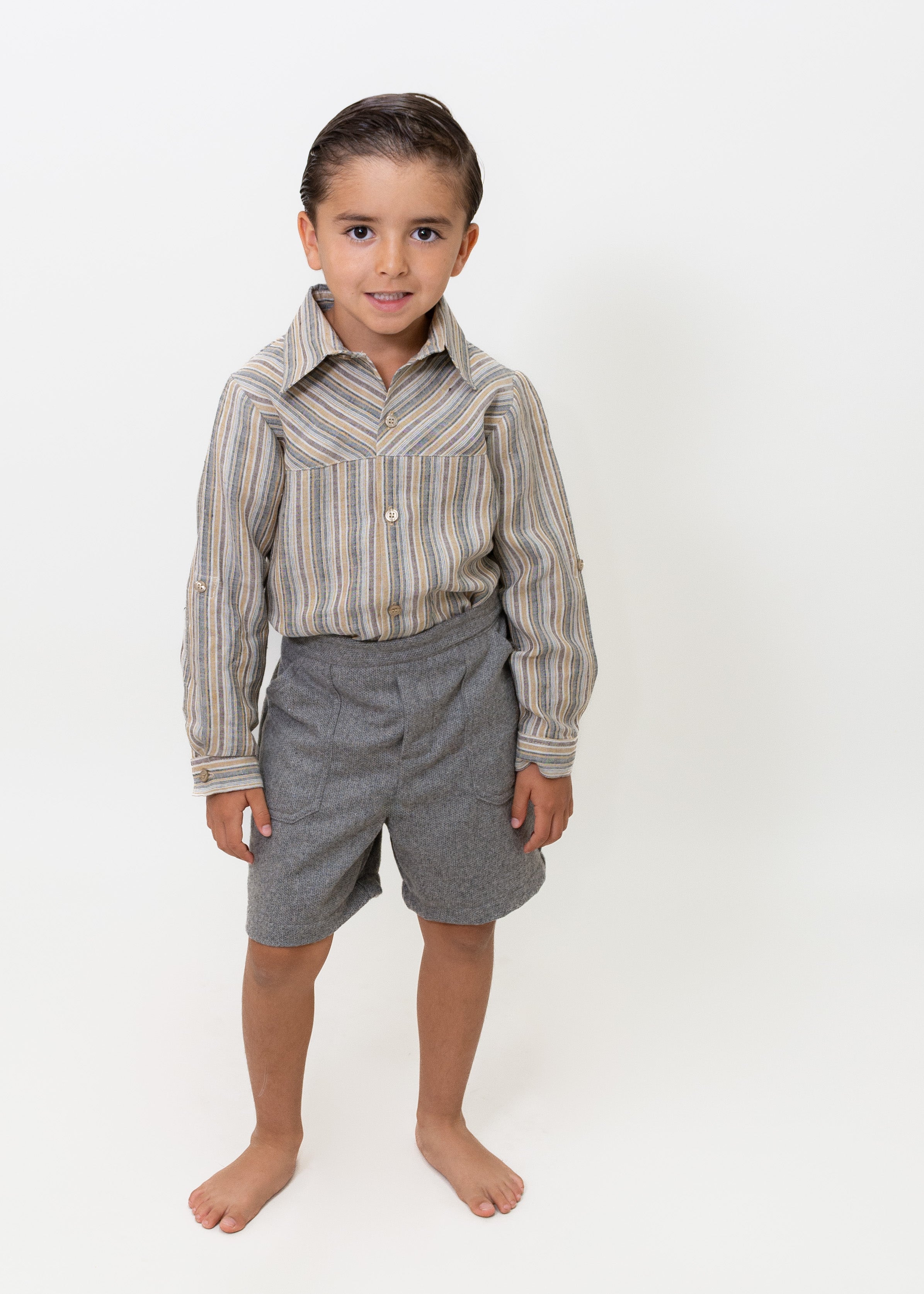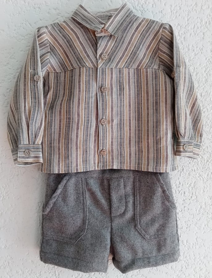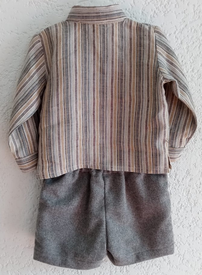 Camisa de lino de rayas gris, beige y café manga larga con remango, cuello sport, Bermuda de lana gris con forro y elástico para ajustar en cintura.