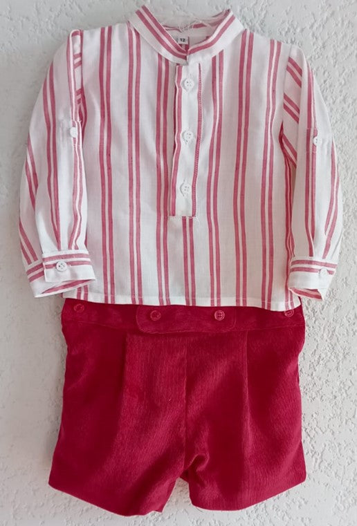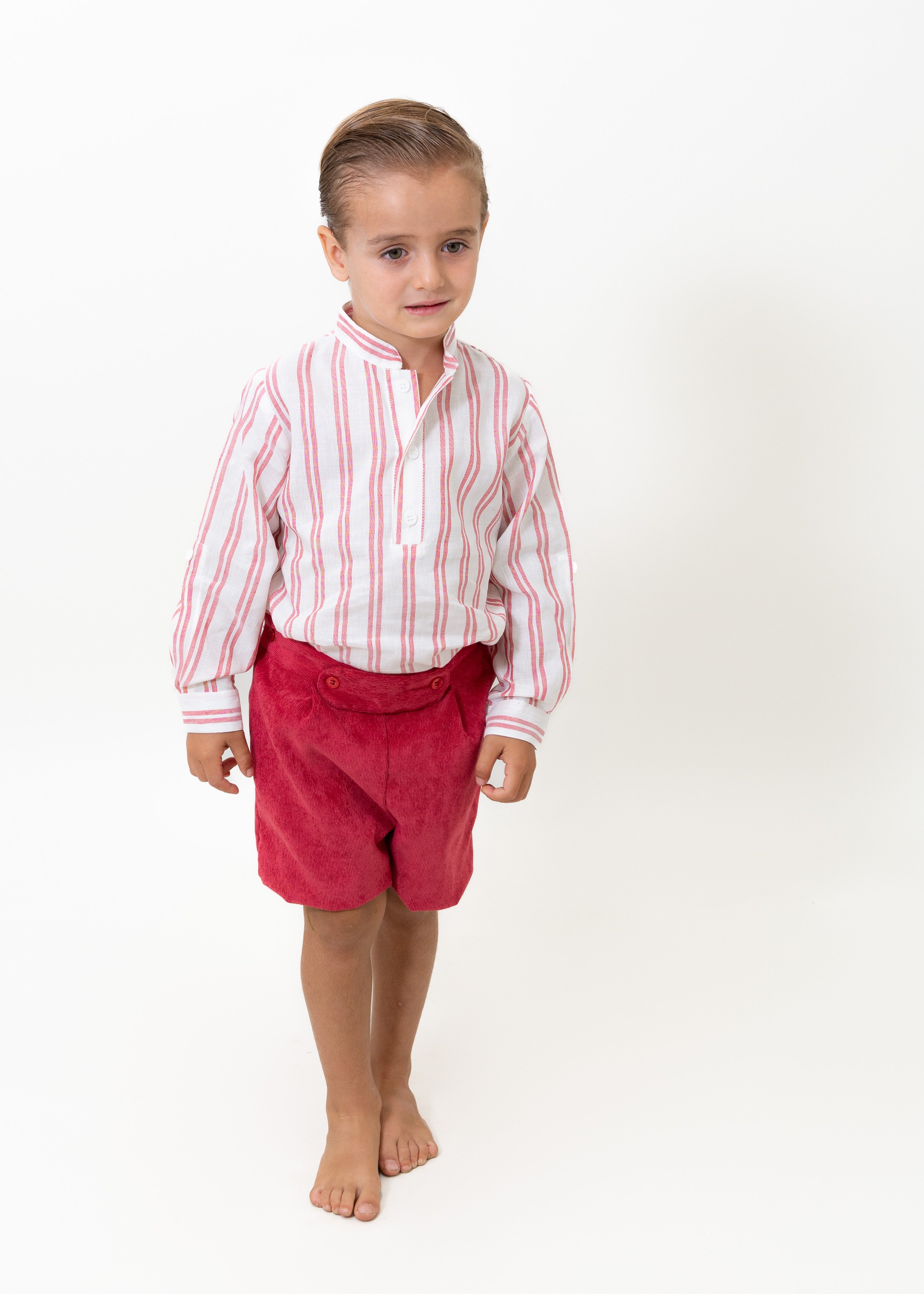 Camisa de lino viscosa de rayas rojas, manga larga con remango, cuello mao, Bermuda de pana roja con forro y elástico para ajustar en cintura.