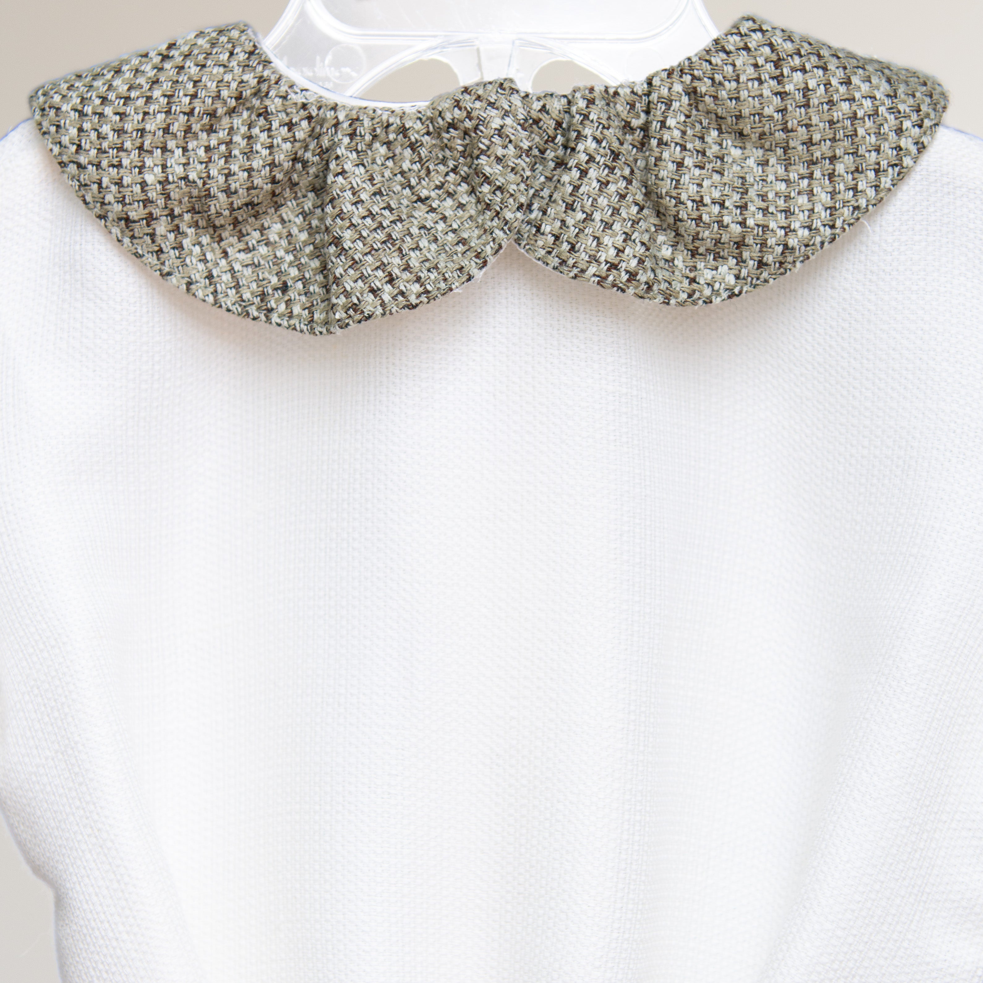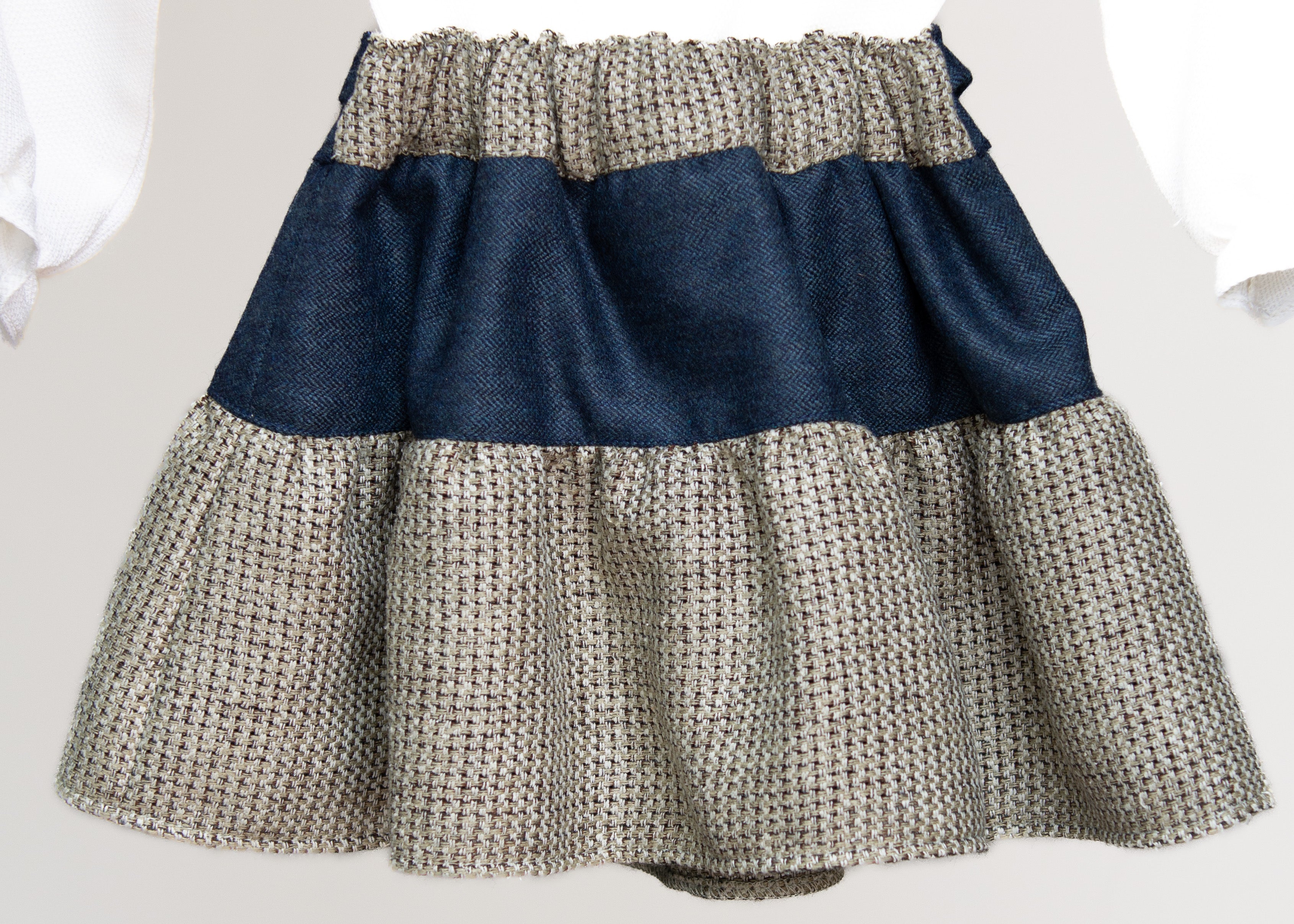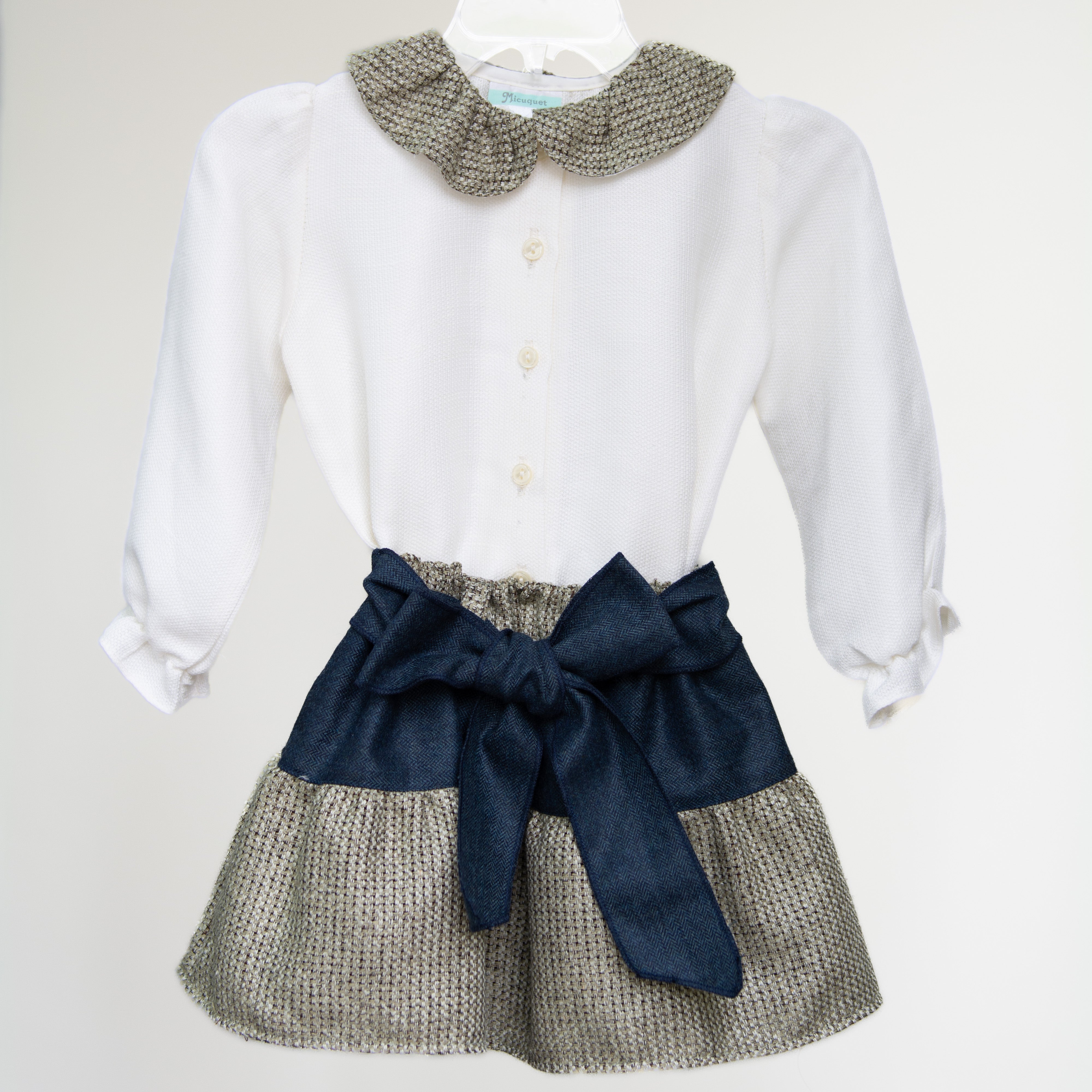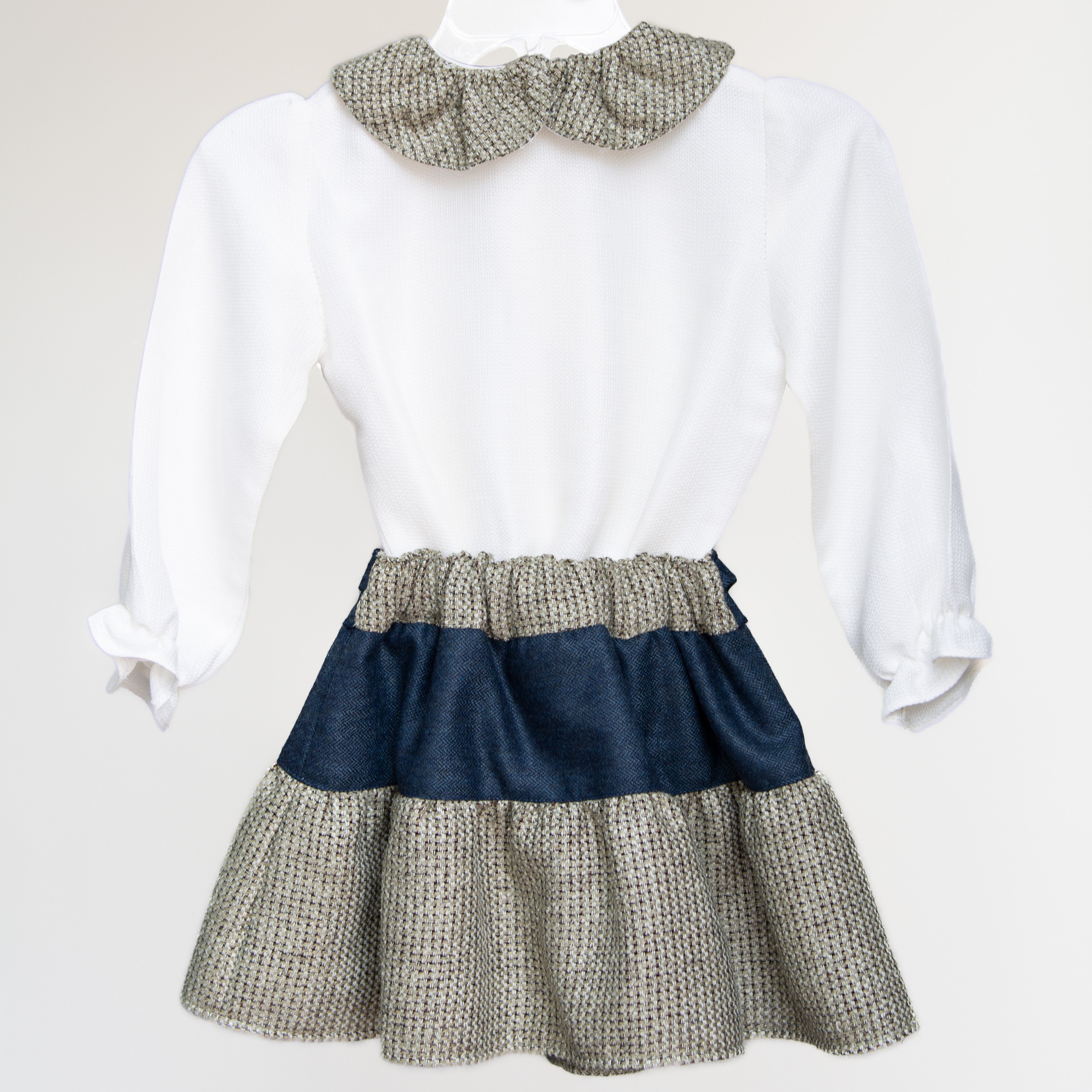 Conjunto niña, falda de lana verde y marino con blusa de piqué crudo manga larga con abertura al frente.