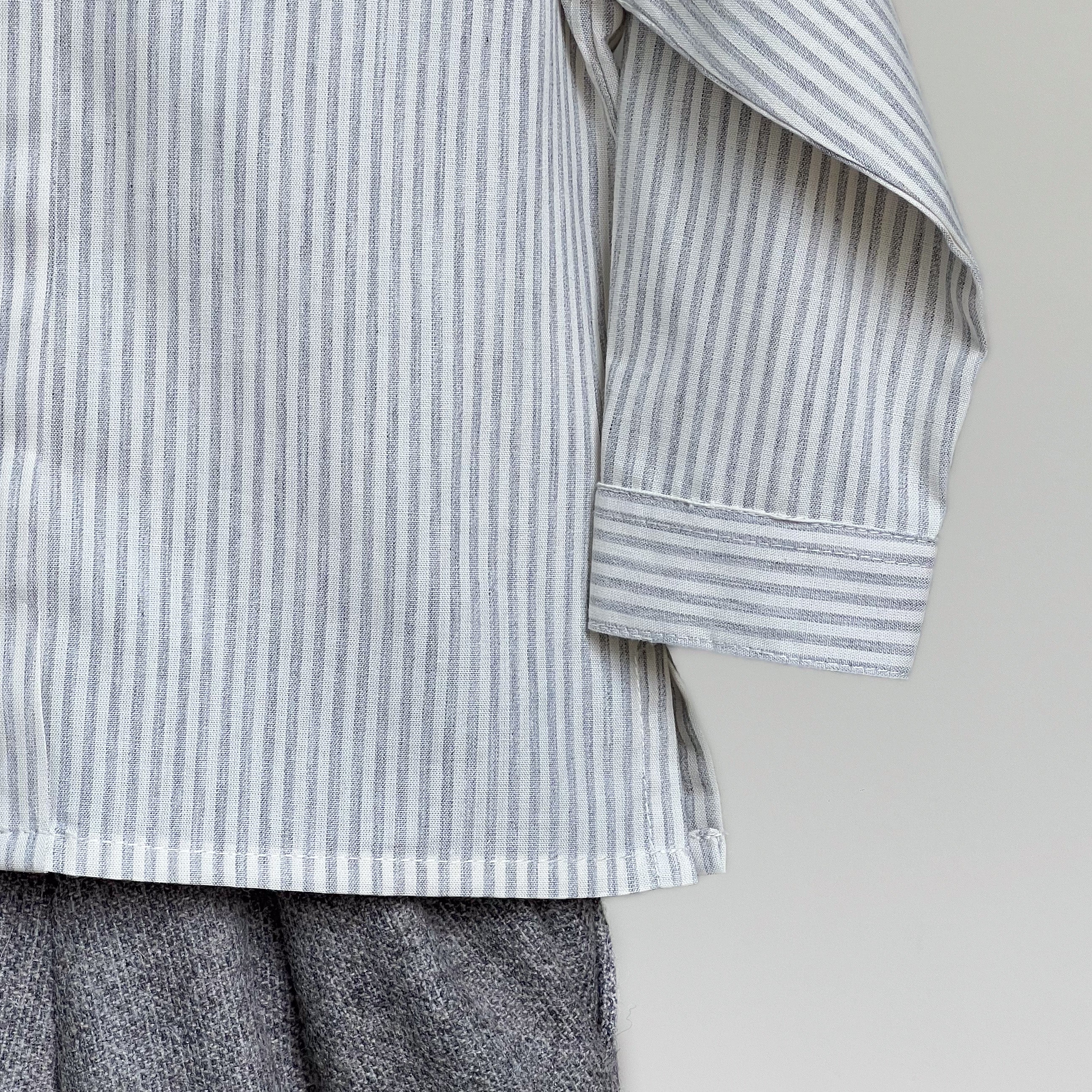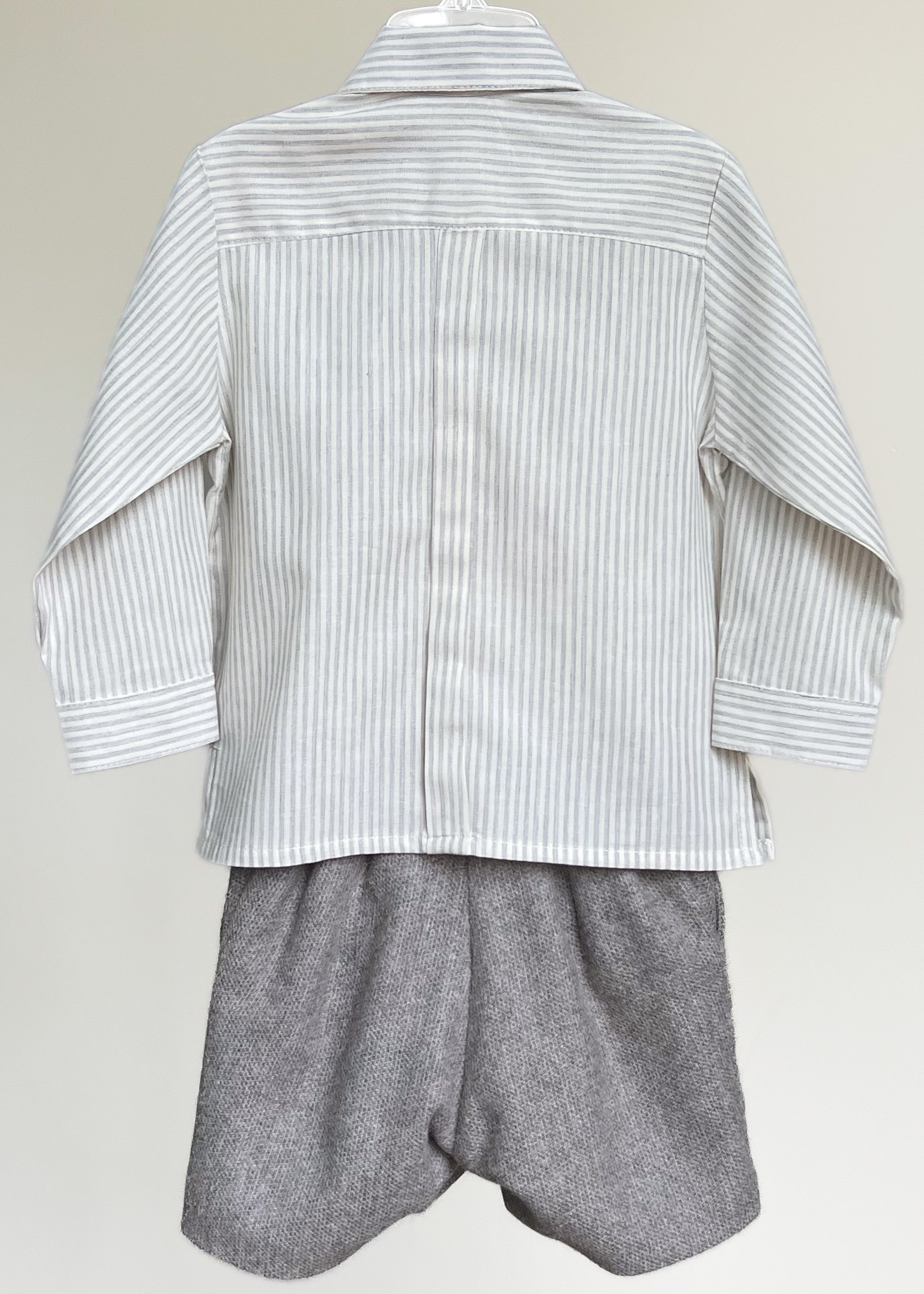Conjunto niño camisa de algodón de rayas gris, manga larga con recogedor, y bermuda de lana gris, con elástico en cintura para ajustar.