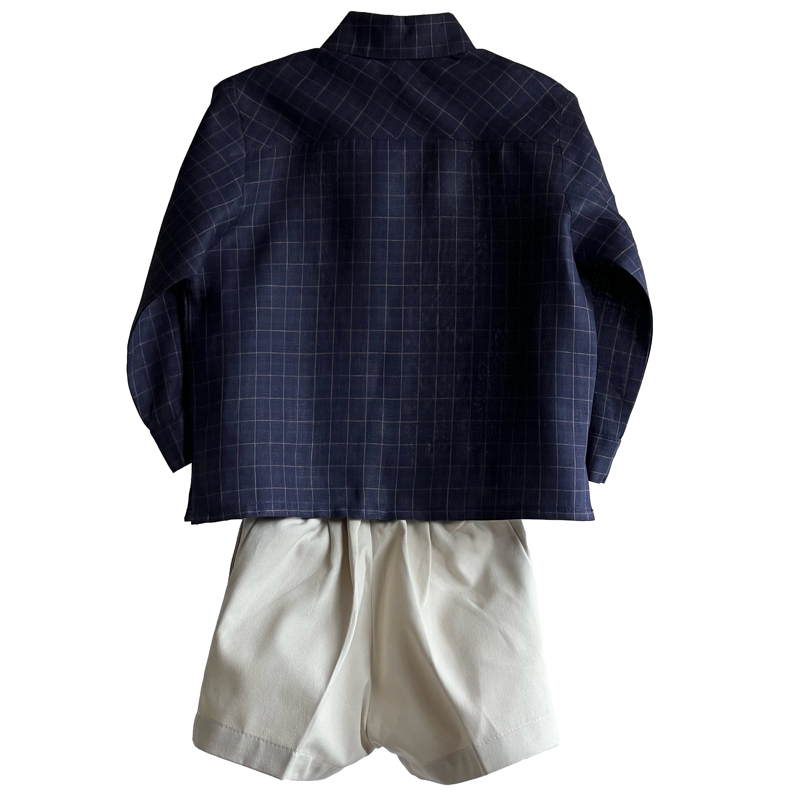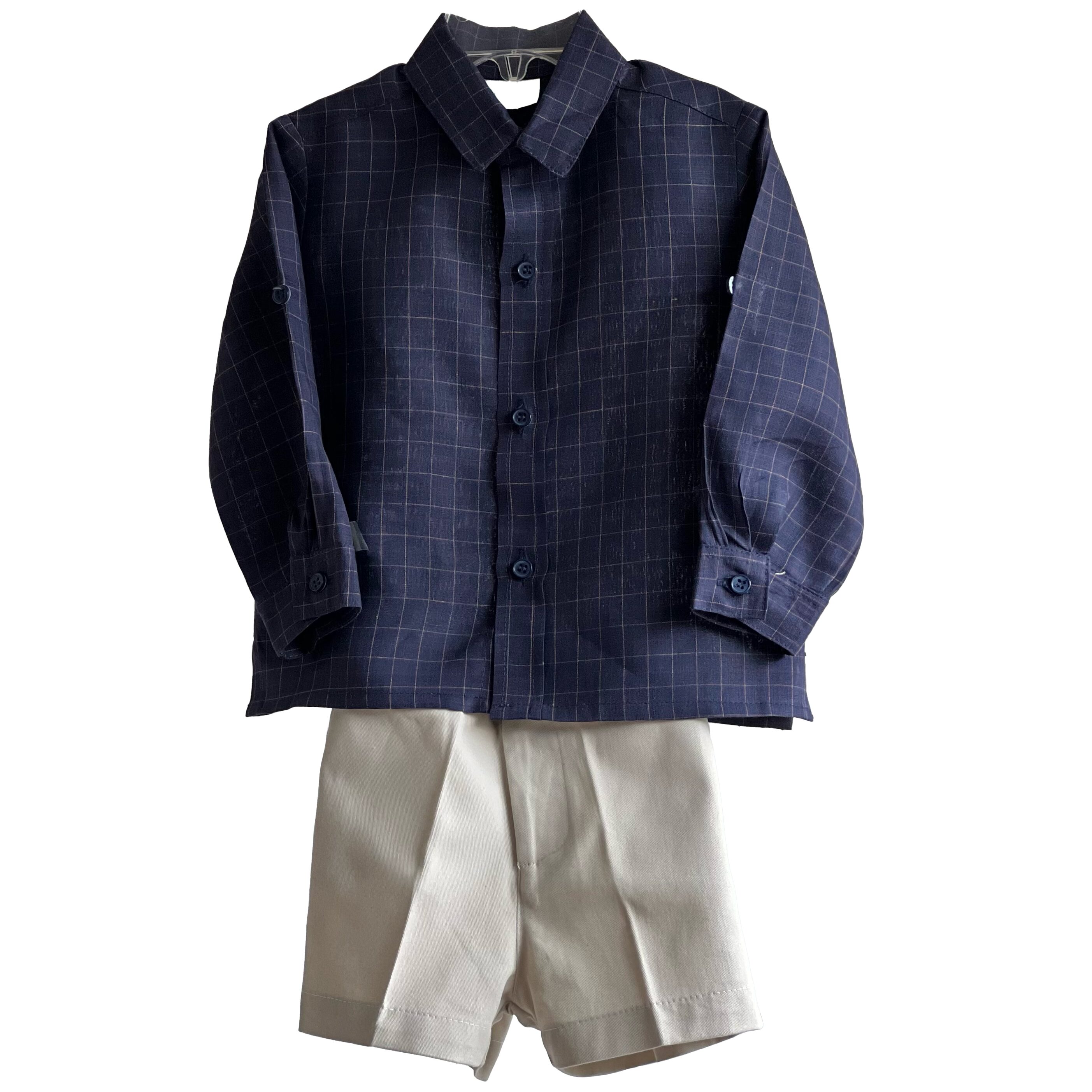 Conjunto de niño, camisa de lino con cuadros azul marino manga larga con recogedores, bermuda de gabardina beige con elástico en cintura para ajustar.