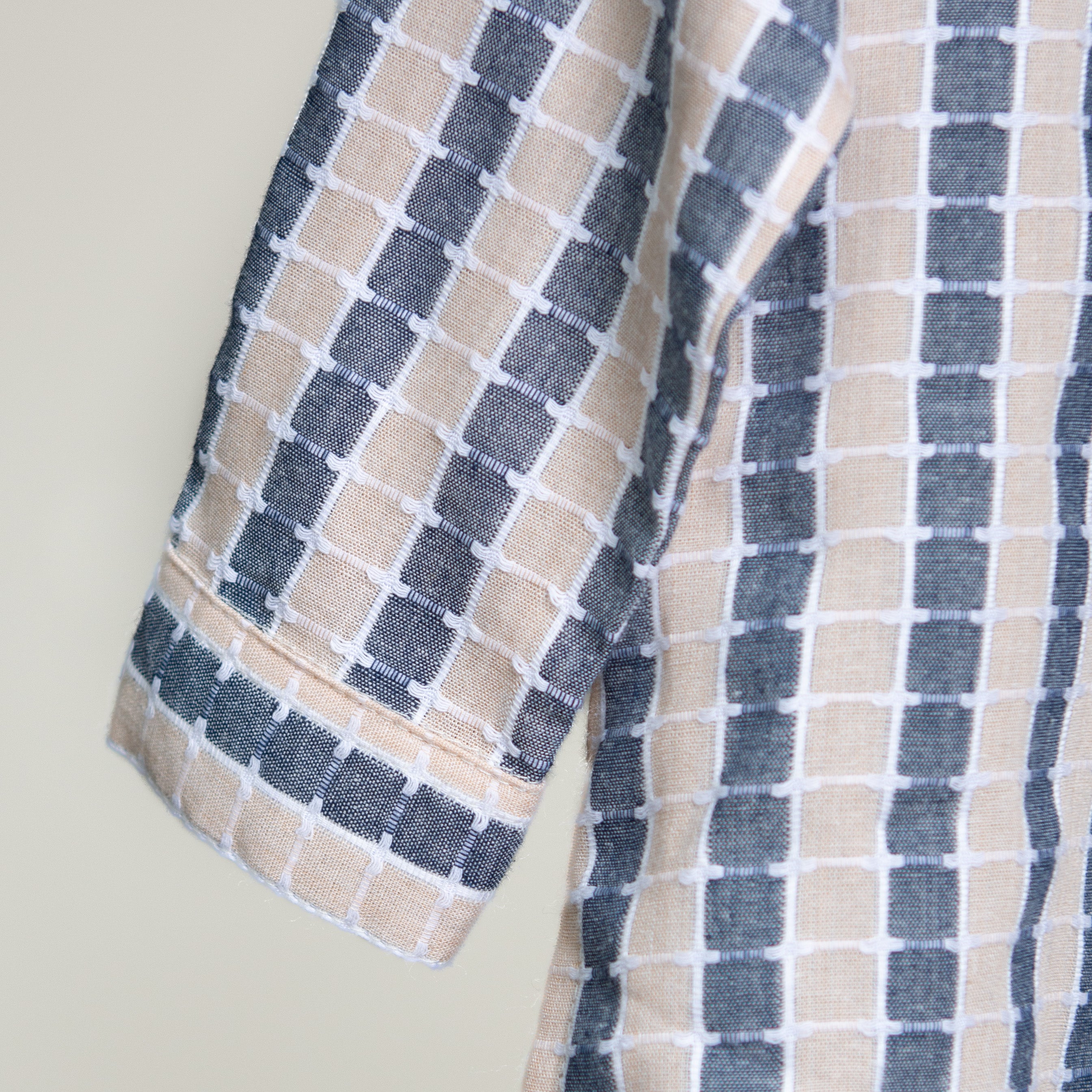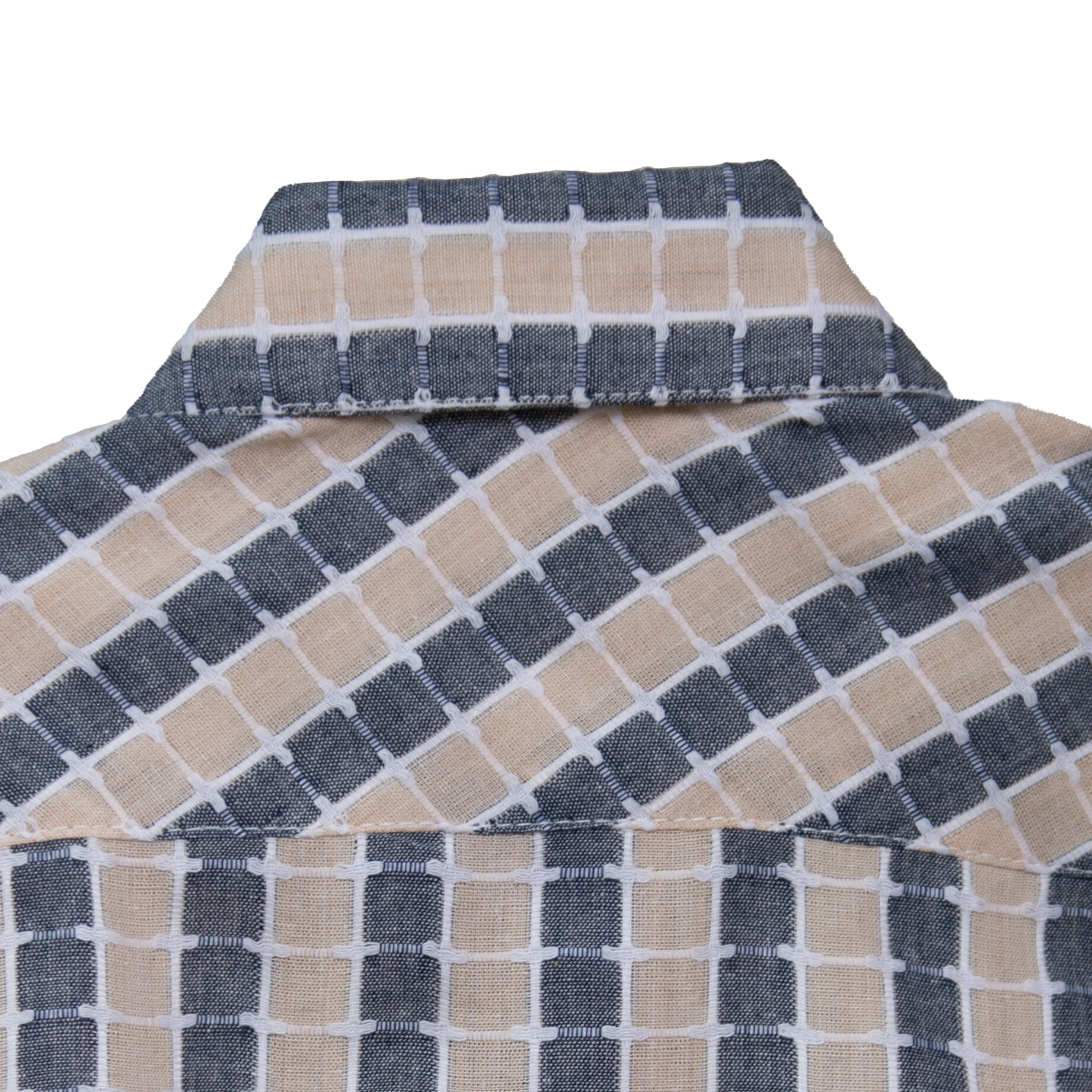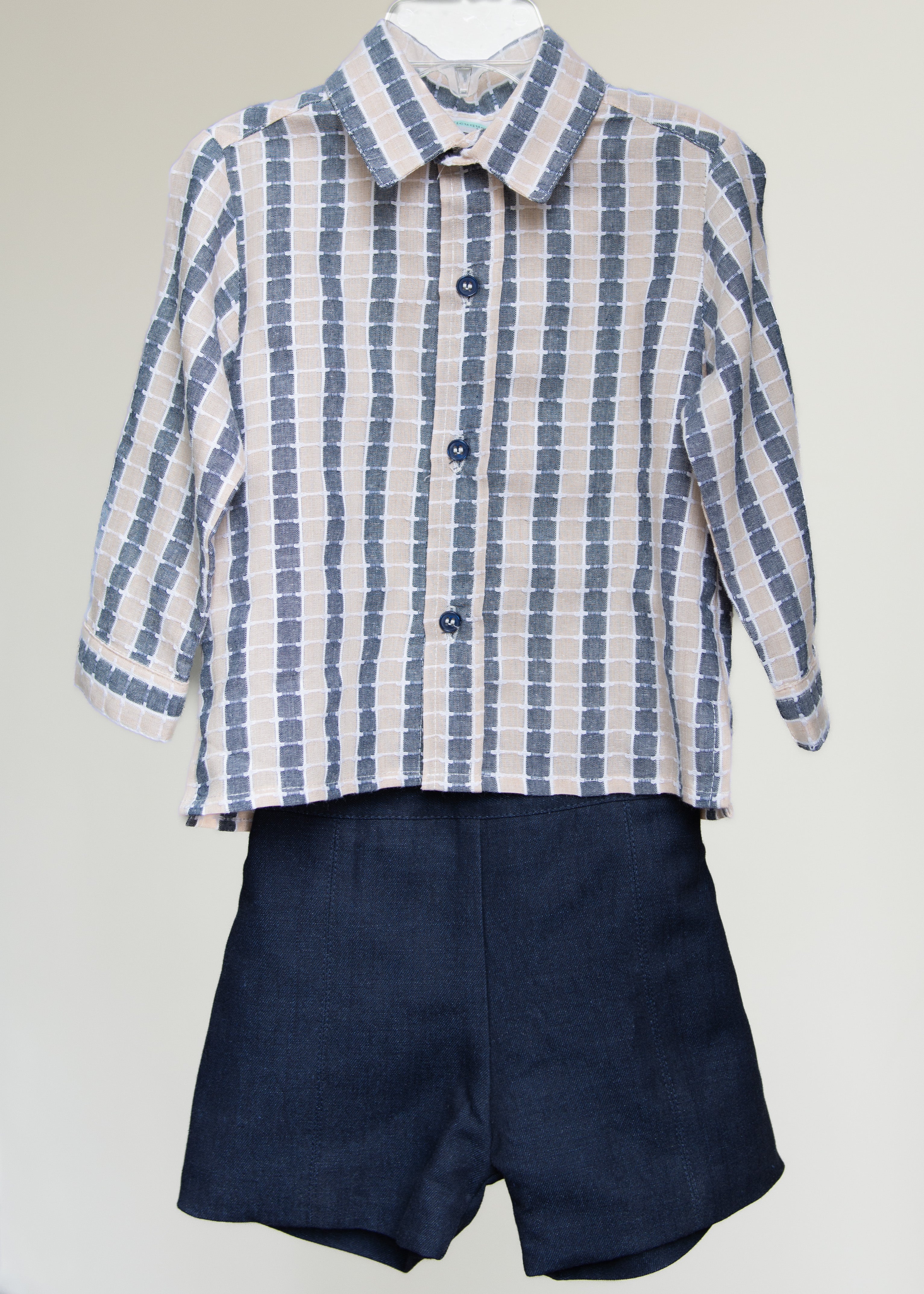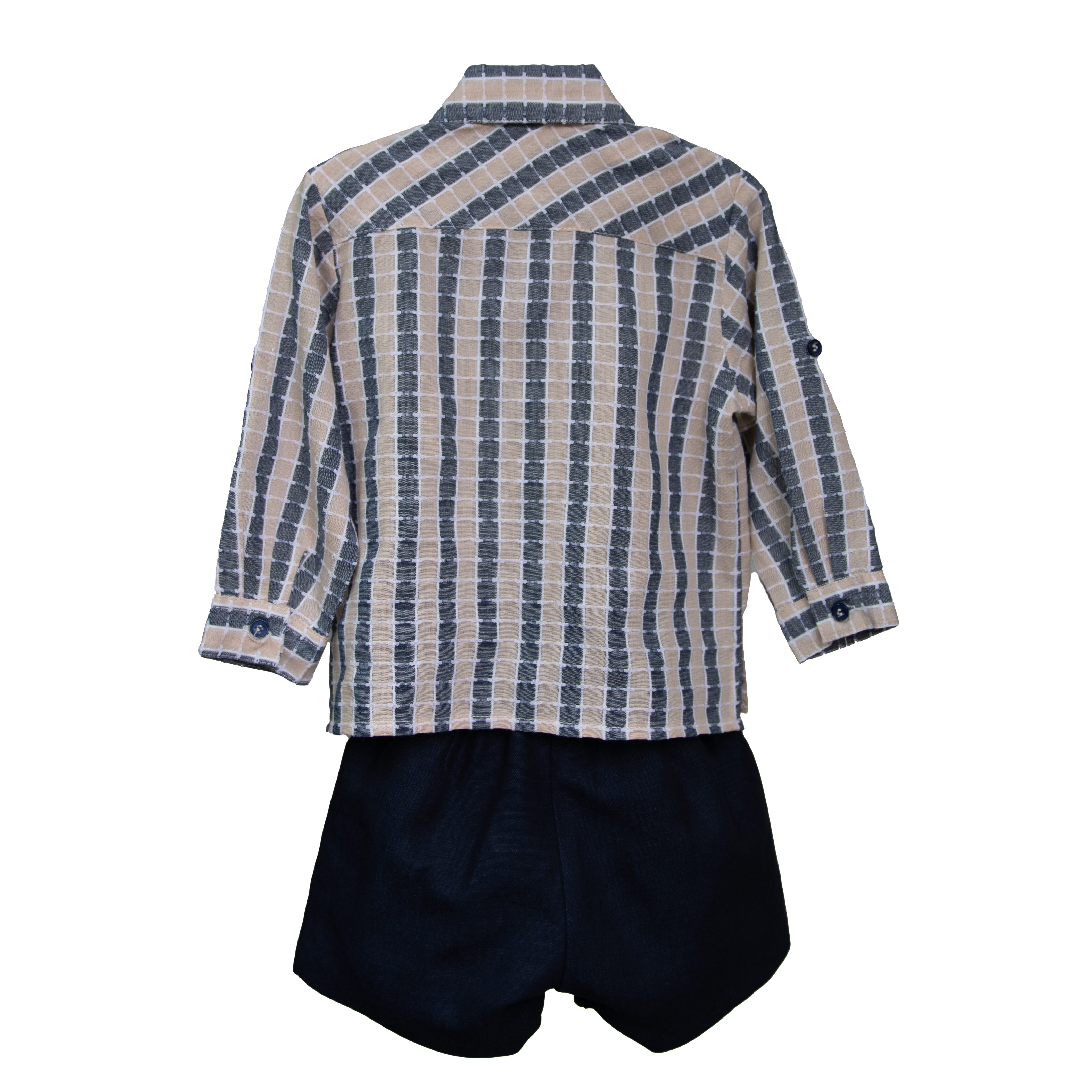Conjunto niño, camisa de algodón de cuadros beige y azul, manga larga con recogedores, bermuda de algodón azul con elástico en cintura para ajustar.