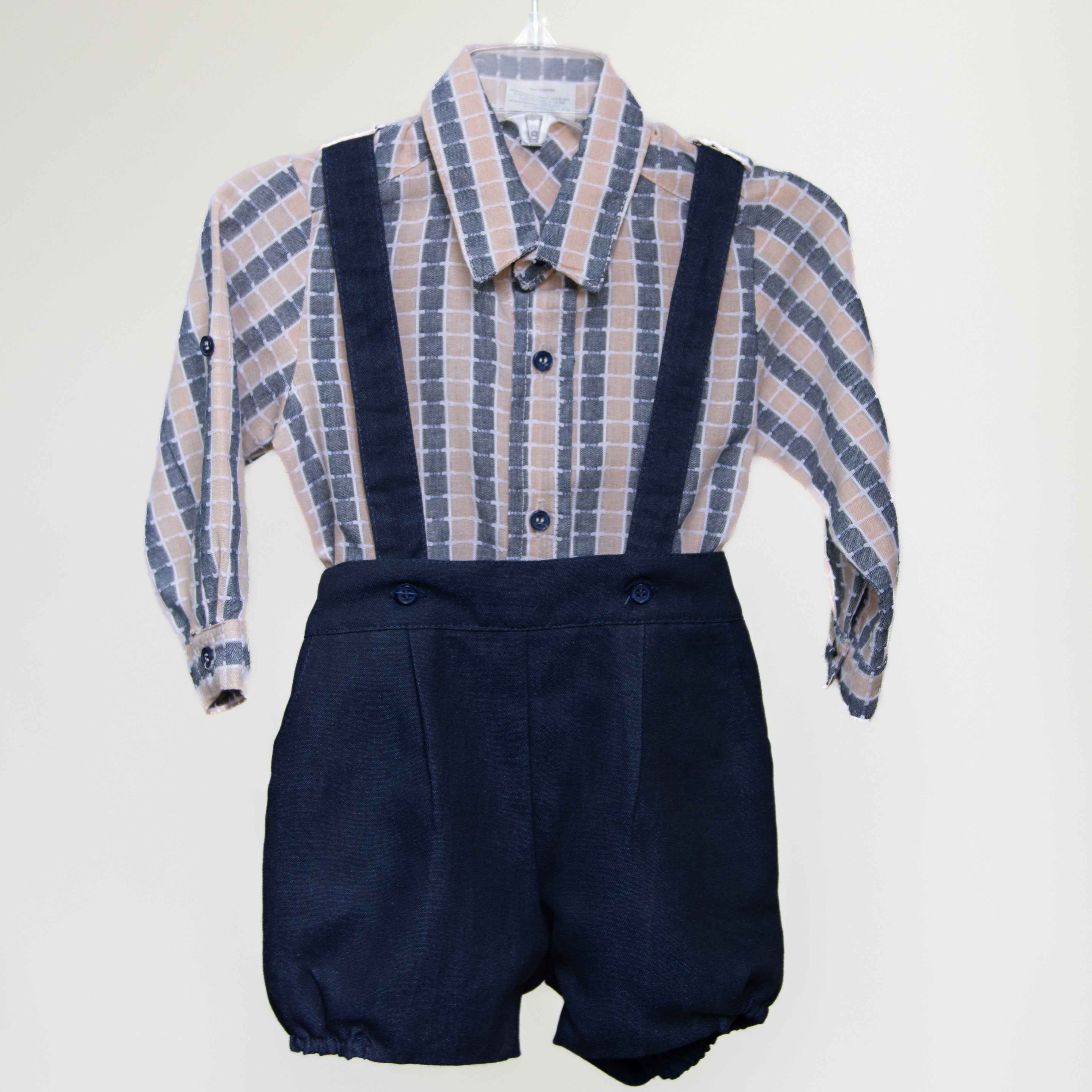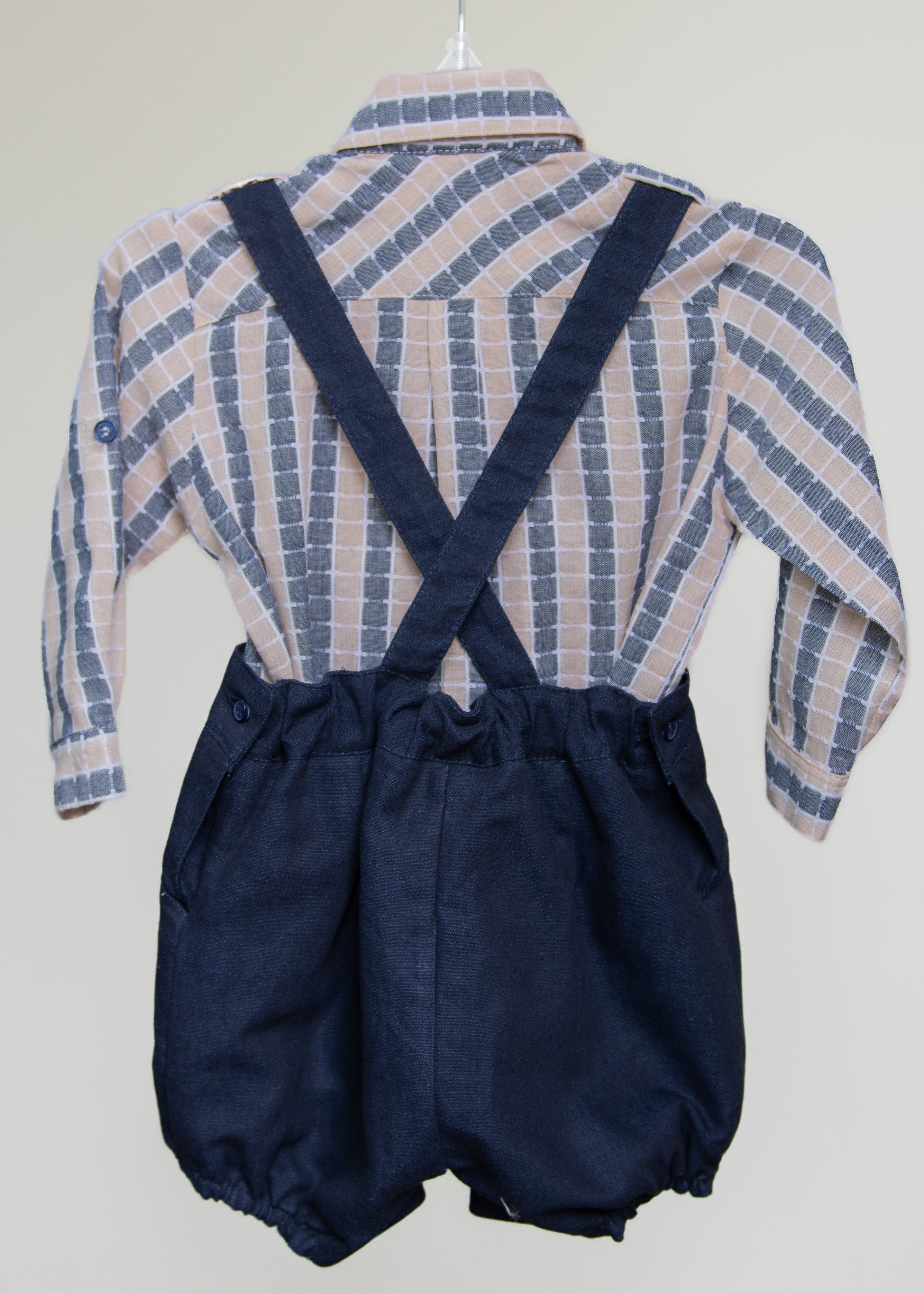 Pañalero de niño algodón azul, con camisa de algodón de cuadros azul y beige.