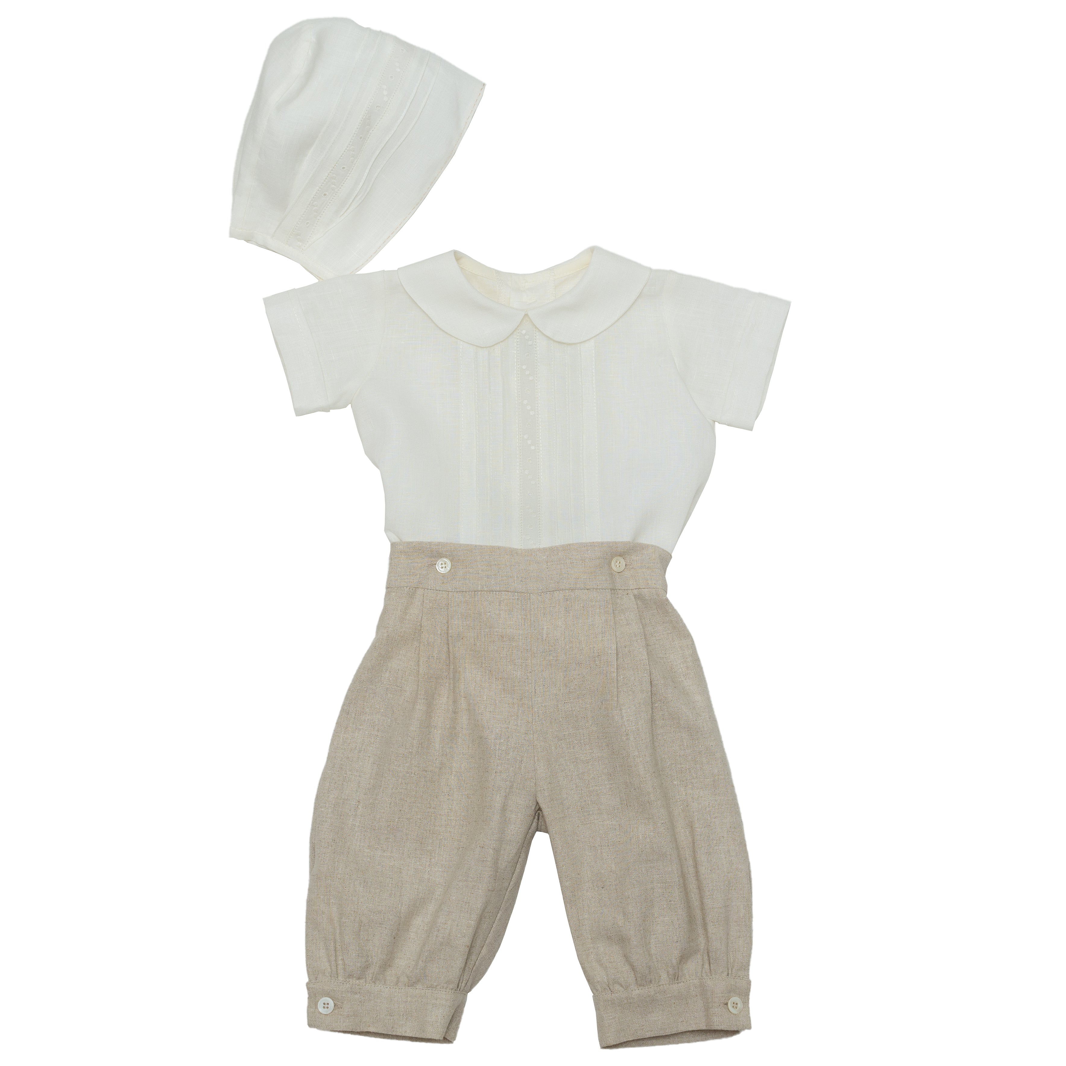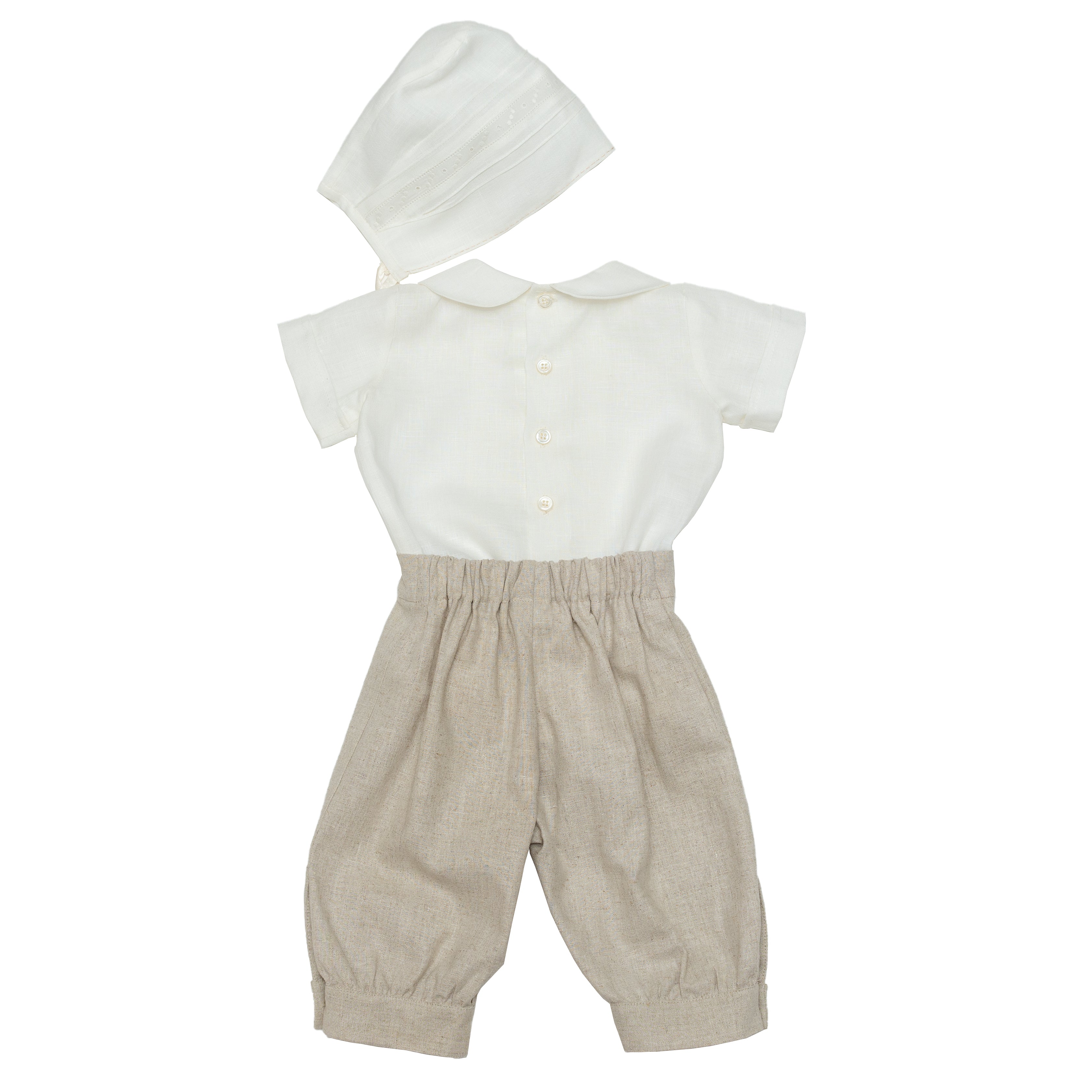 Ropón en 100% lino italiano, camisa con cuatro alforzas de cada lado y entredos español al centro, cuello baby y manga corta. Abotonadura al frente para ajustar. Pantalón bombacho con dos pinzas de cada lado. Ojales en pretina para ajustar a la camisa. Gorro con alforzas y entredos.