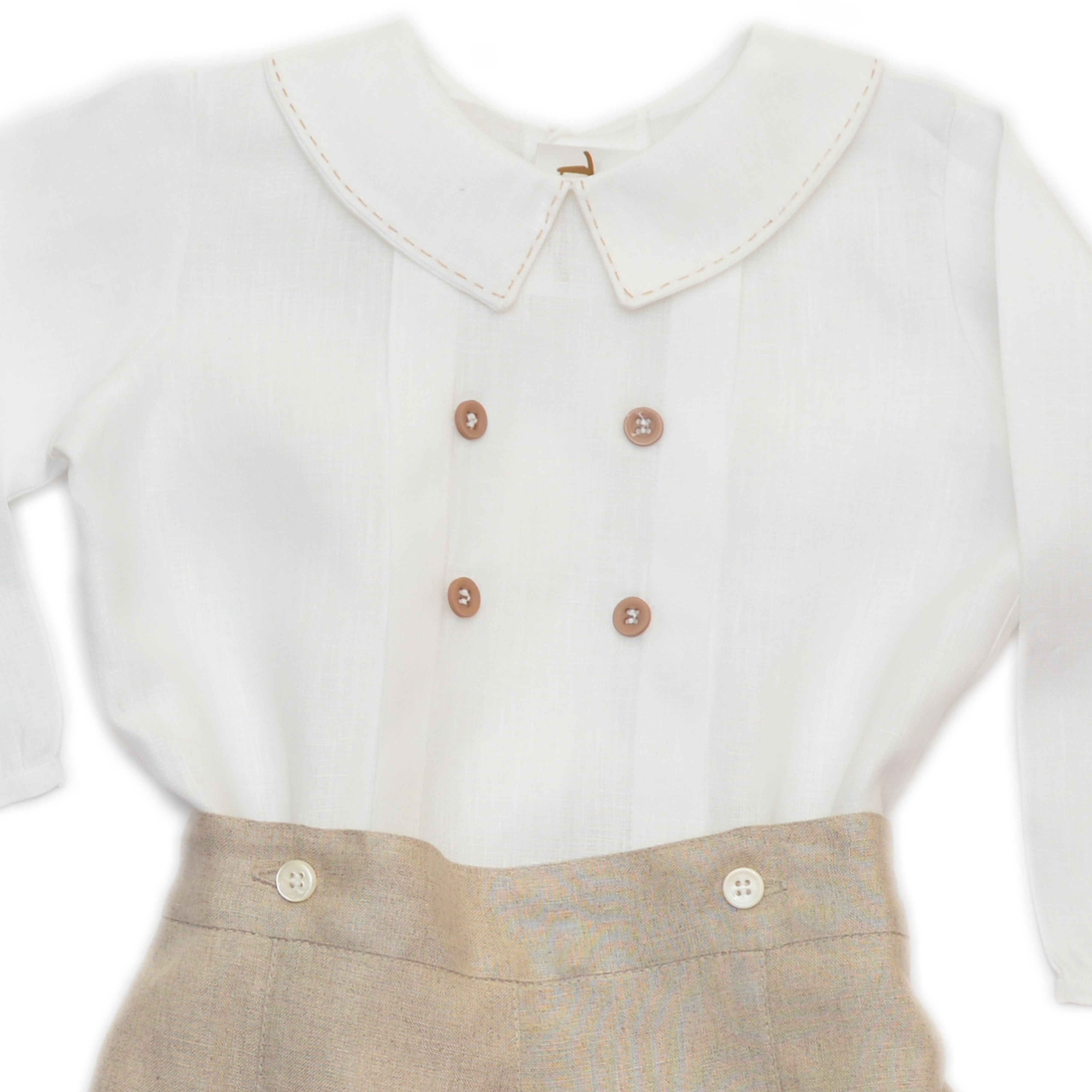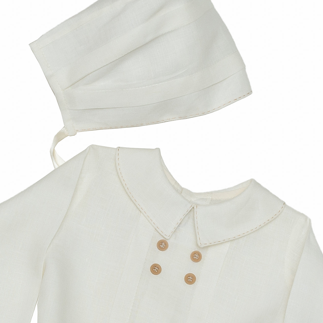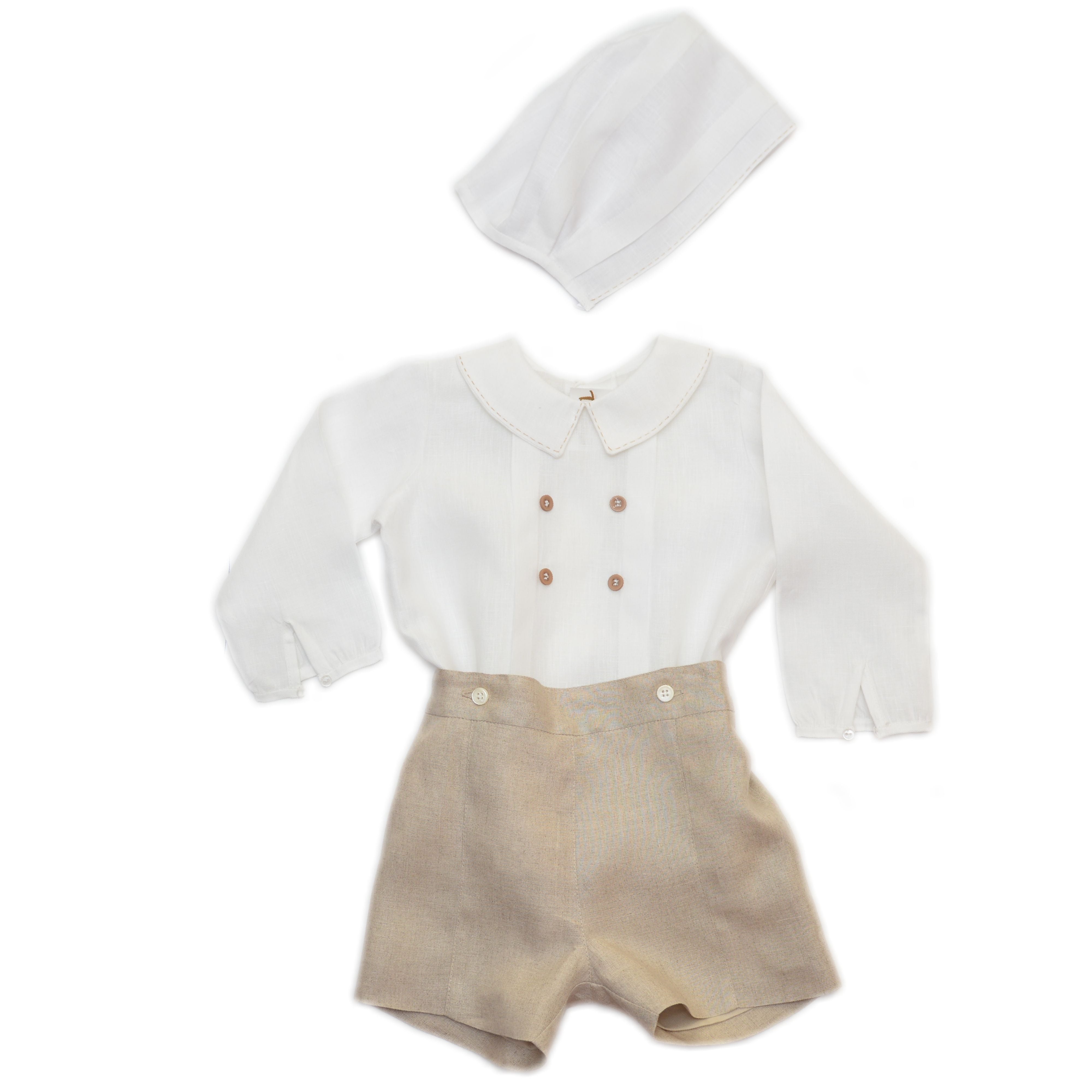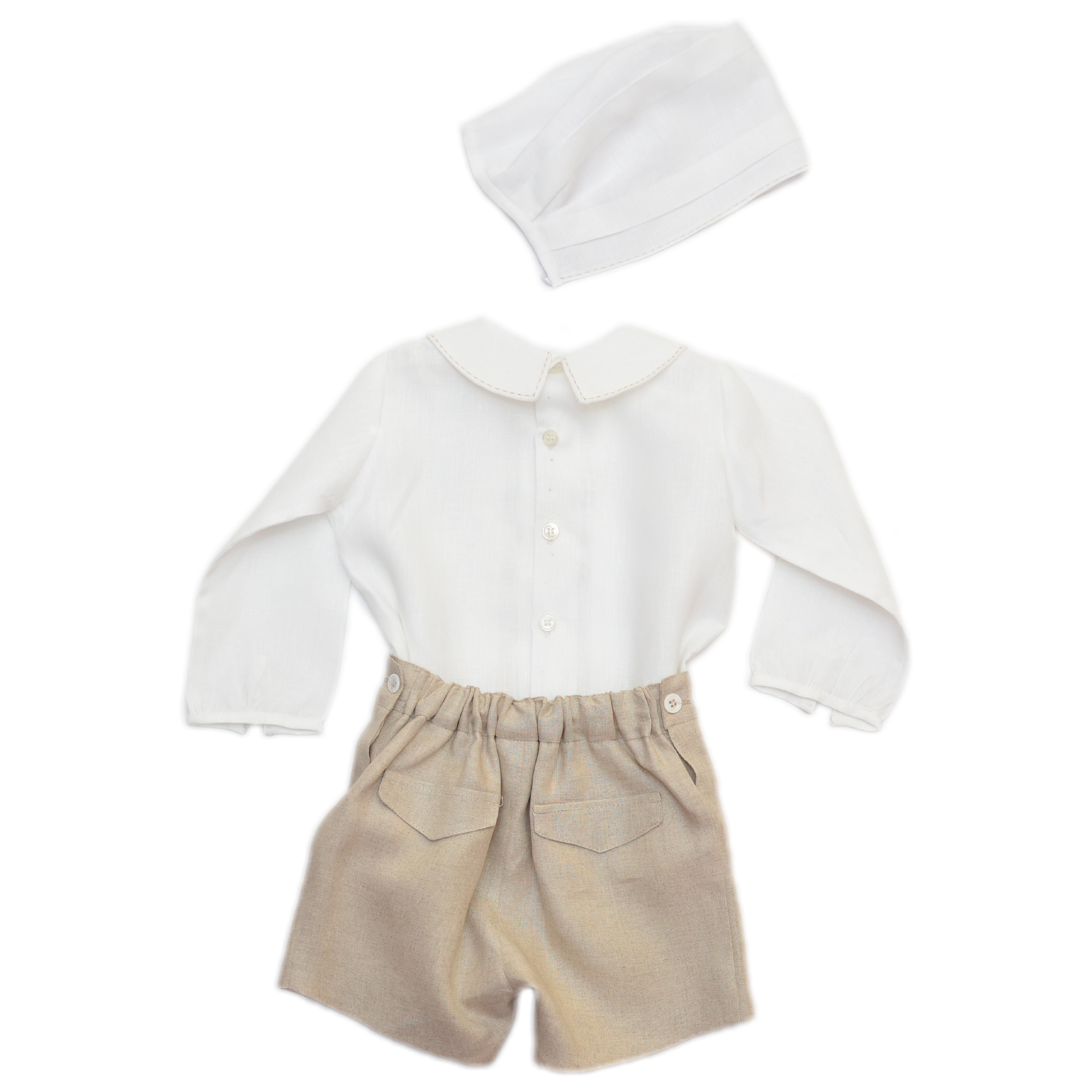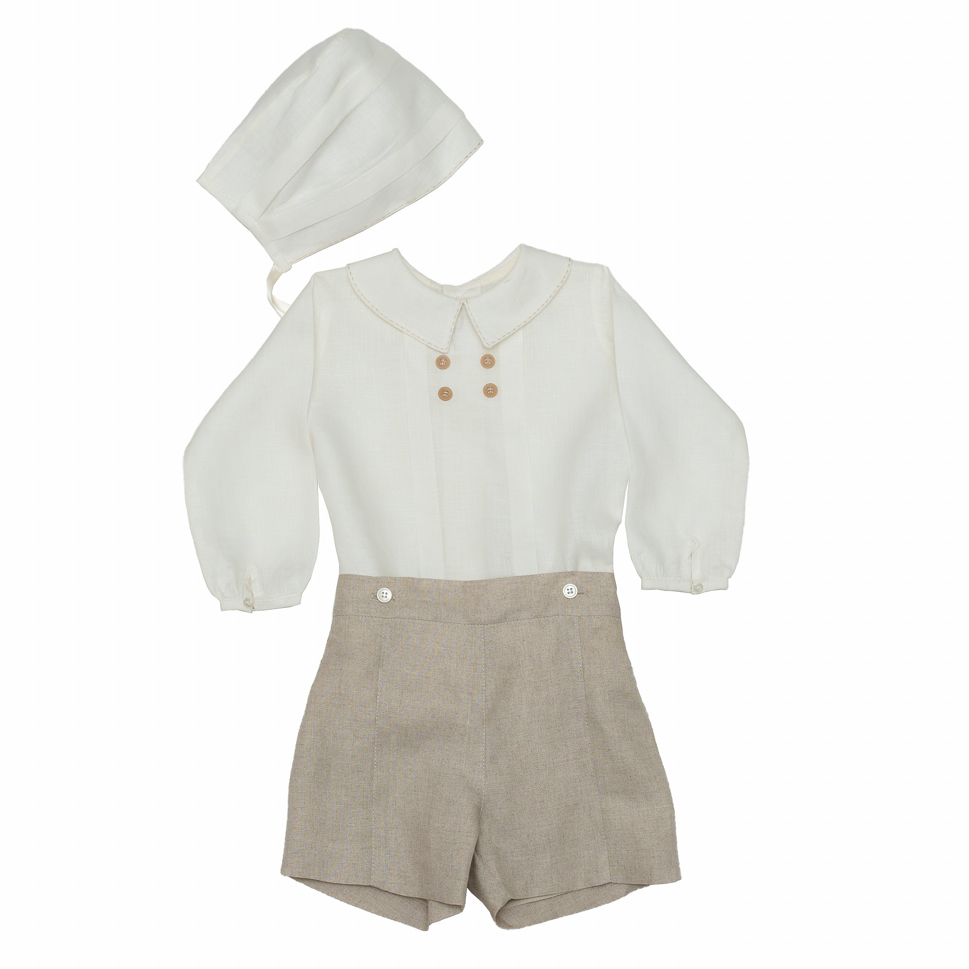 Ropon en lino 100% italiano, camisa manga larga con botón en puño. Una alforza ancha en cada lado con cuatro botones al centro. Cuello baby terminado en pico y con pespunte hecho a mano. Bermuda fraccionada con pespunte al centro, botones para ajustar a la camisa y elástico de ojal en cintura. Gorro con alforzas anchas y pespunte al frente.