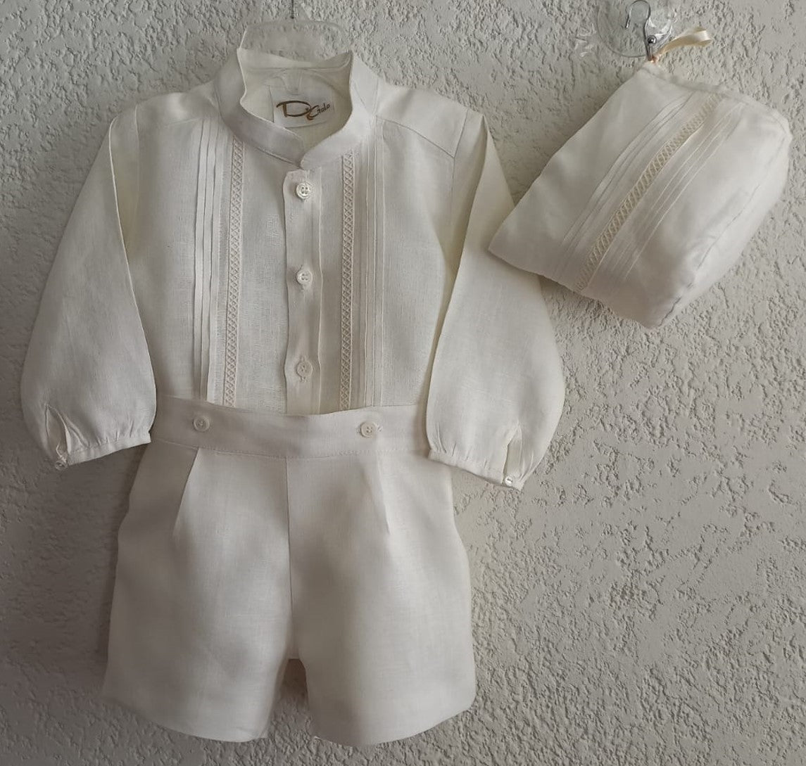 Ropón de niño conjunto de dos piezas, camisa de lino manga larga con entredós de tira bordada cruzada, cuello mao, con botones al frente para ajustar a bermuda. Bermuda de lino con forro.