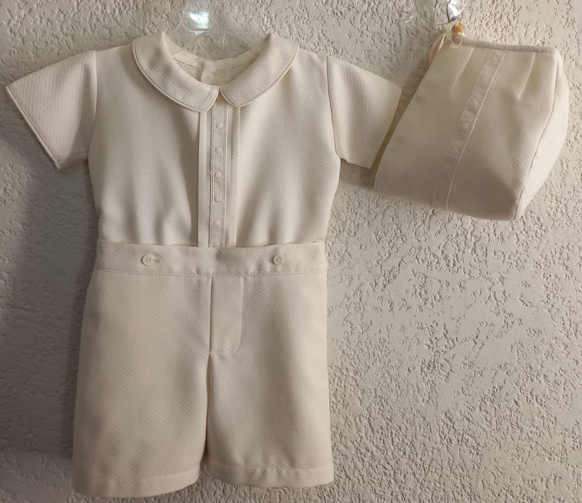 Ropón de niño conjunto de dos piezas, camisa de piqué crudo manga corta cuello baby con entredós de bodoques bordado al frente, y botones al frente para ajustar la camisa. Bermuda lisa con elástico en cintura y cierre simulado, con gorro.