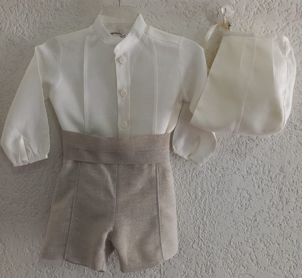 Ropón de niño de cuatro piezas, camisa de lino con alforzas delgadas. manga larga y botones al frente para ajustar la bermuda. Bermuda fraccionada con bies en jaspe y fajilla color jaspe, con gorro.