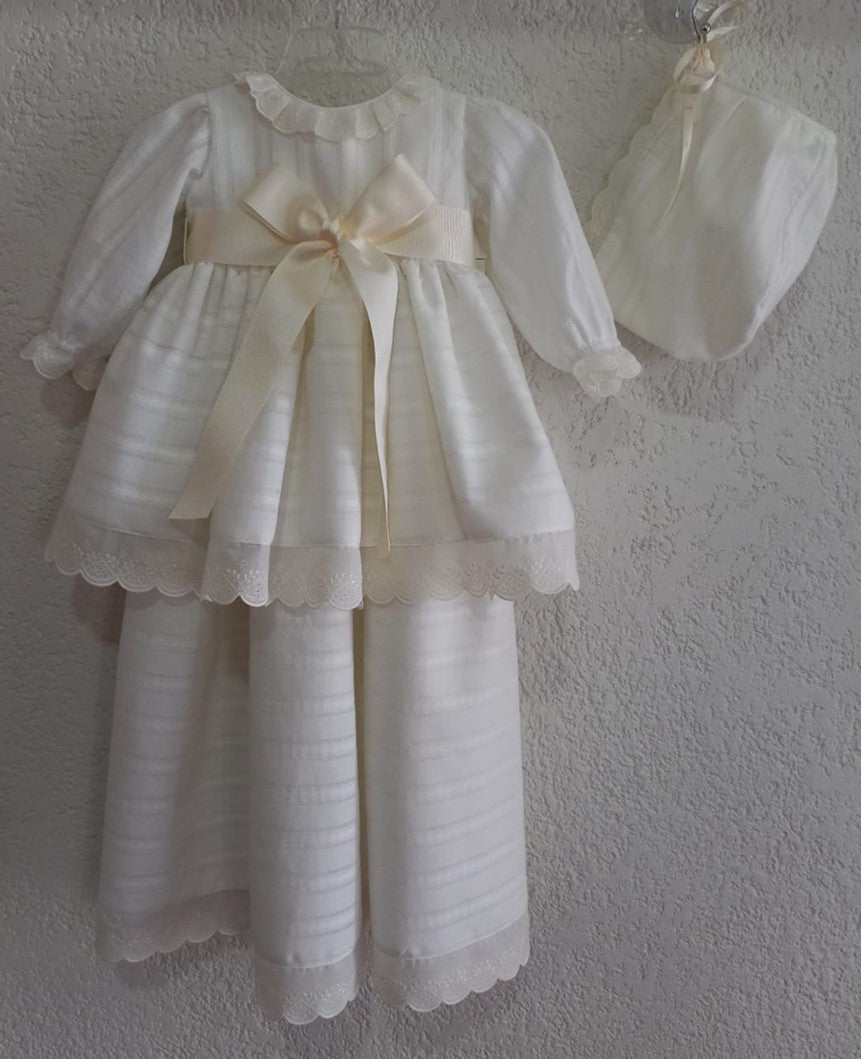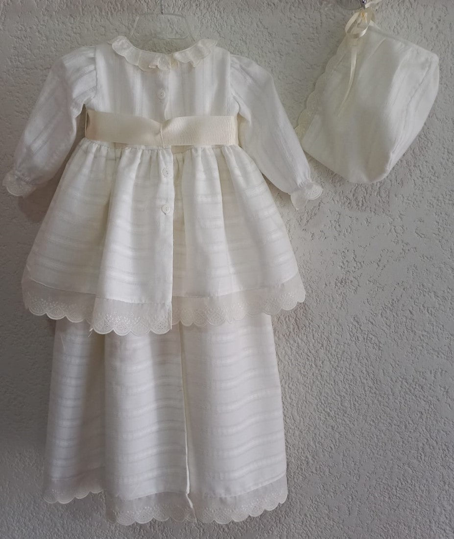 Ropón desmontable de algodón rayado y con puntos, cuello y manga larga con punta de algodón bordado de flores, con banda de listón formando moño en la parte del frente, con gorro.