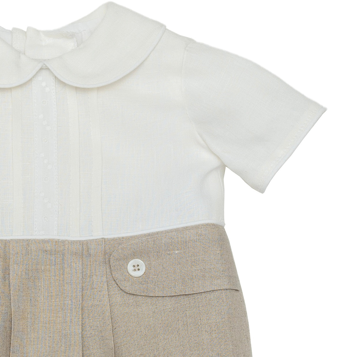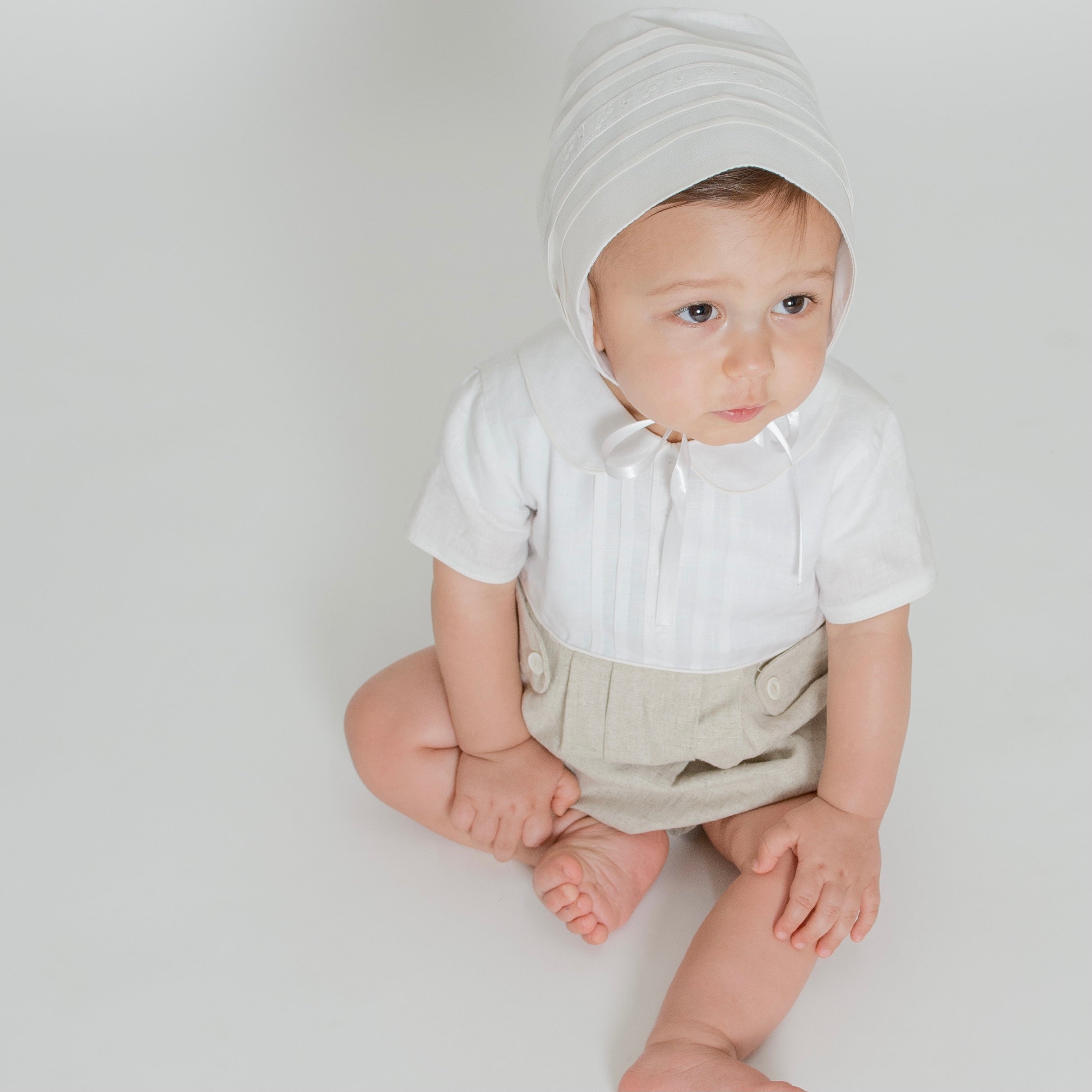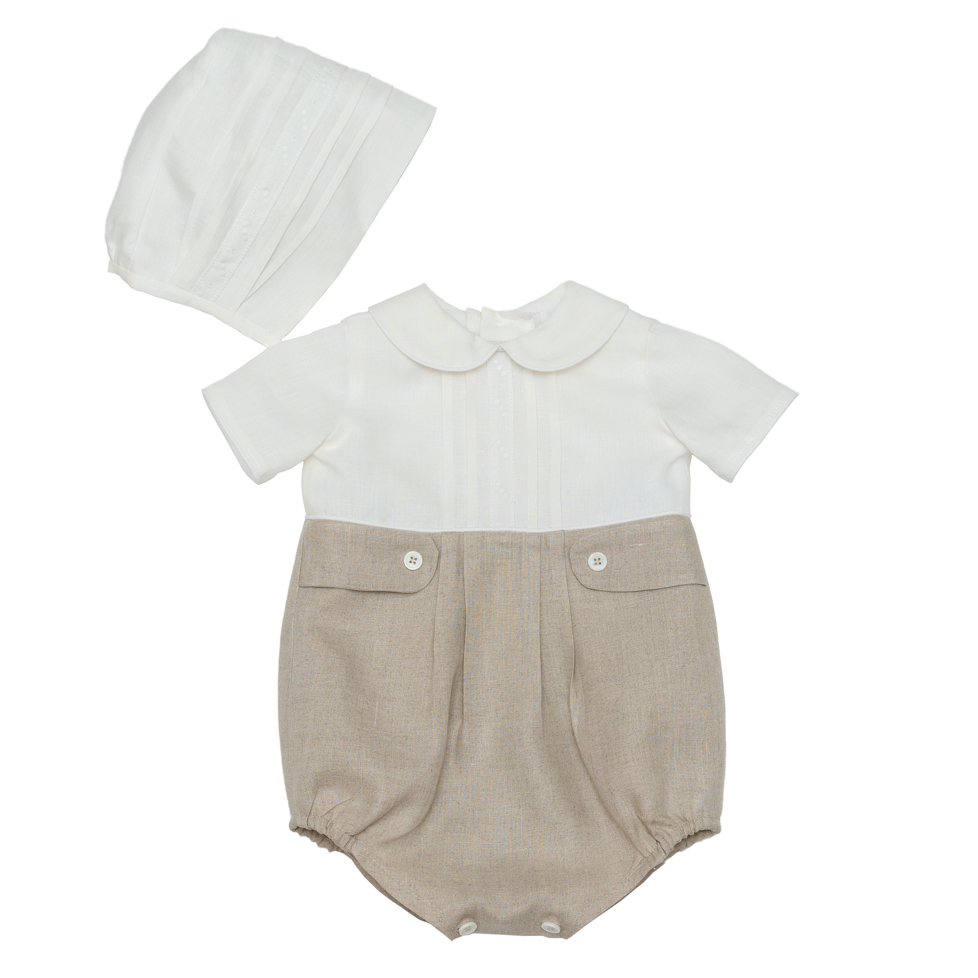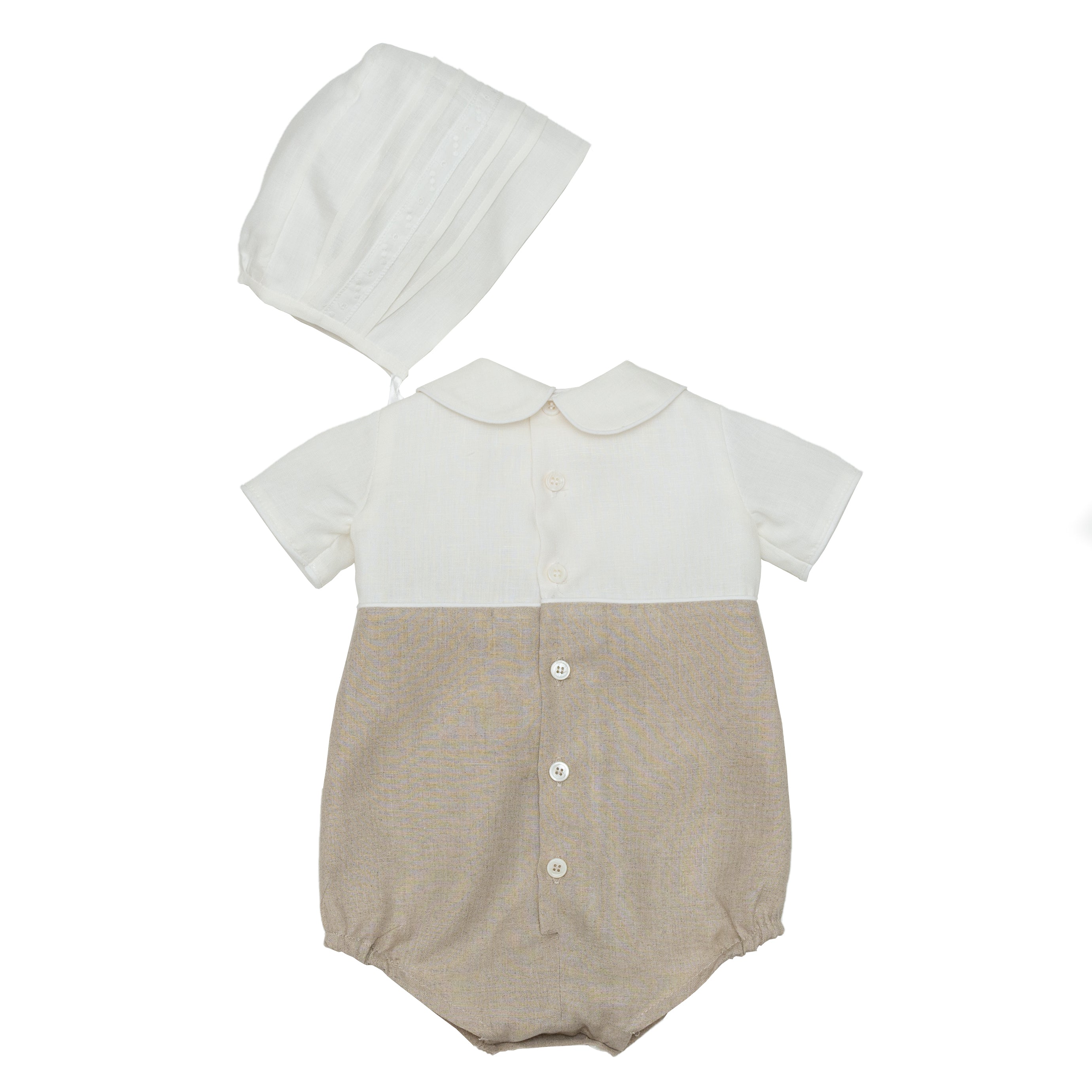 Ropon pañalero en 100% lino italiano combinando dos tonos, dos alforzas y entredos español en el centro, cuello baby y manga corta terminados con bies perfilado. Cuerpo con pinzas, resorte en piernas y abotonadura en entrepierna. Gorro con alforzas y entredos español.