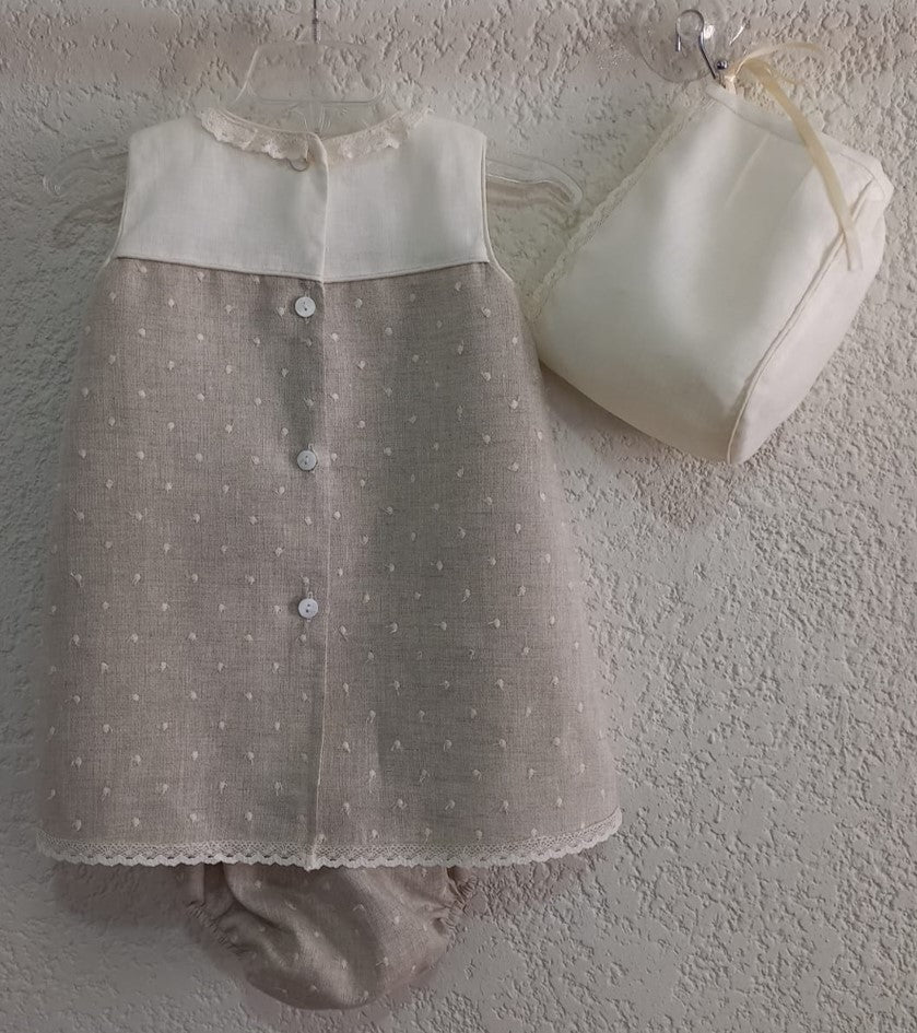 Ropón vestido corto de lino jaspe bordado de puntos crudo con talle combinado de lino color crudo, con punta de bolillo color crudo en cuello y falda, moño de listón en talle, con calzón y gorro.