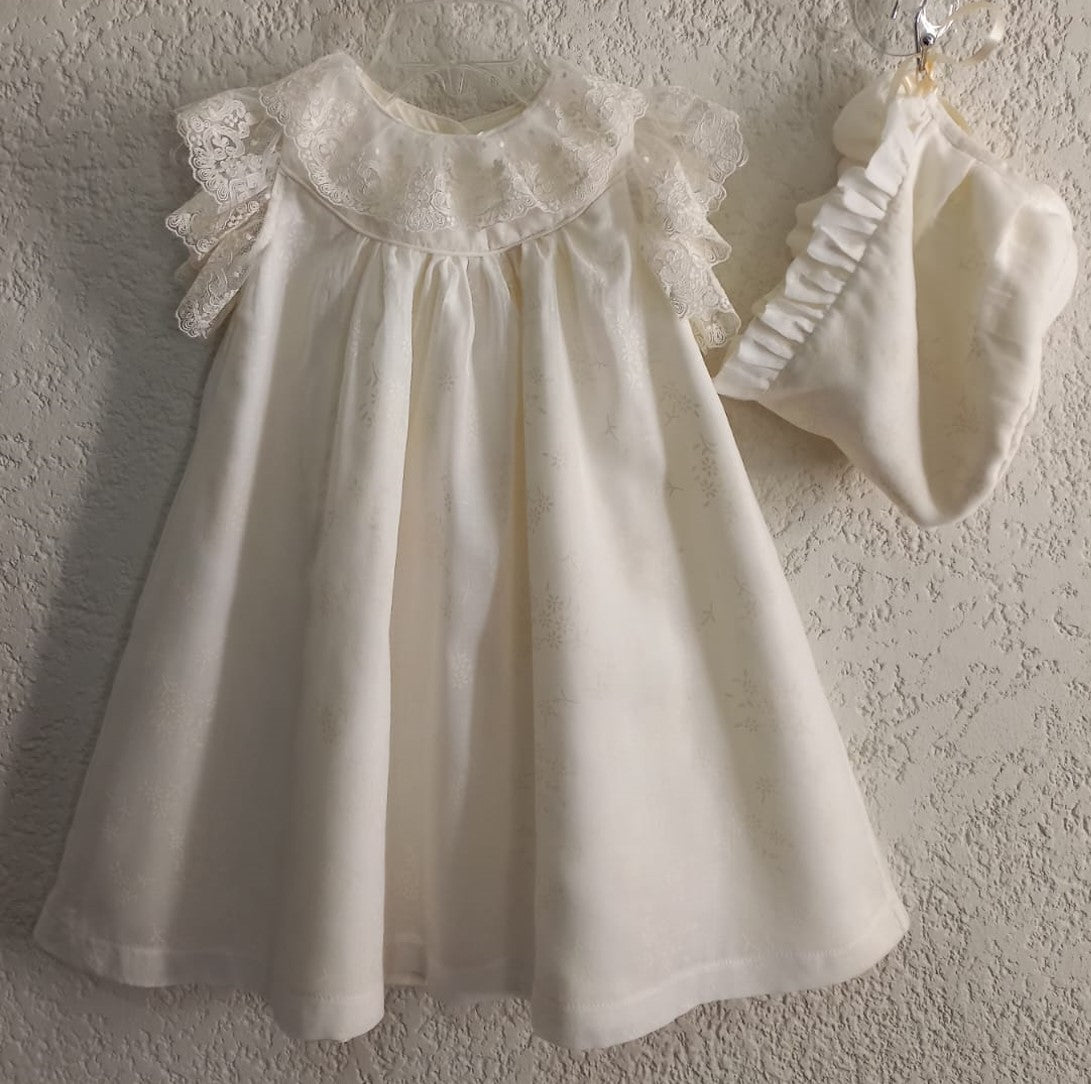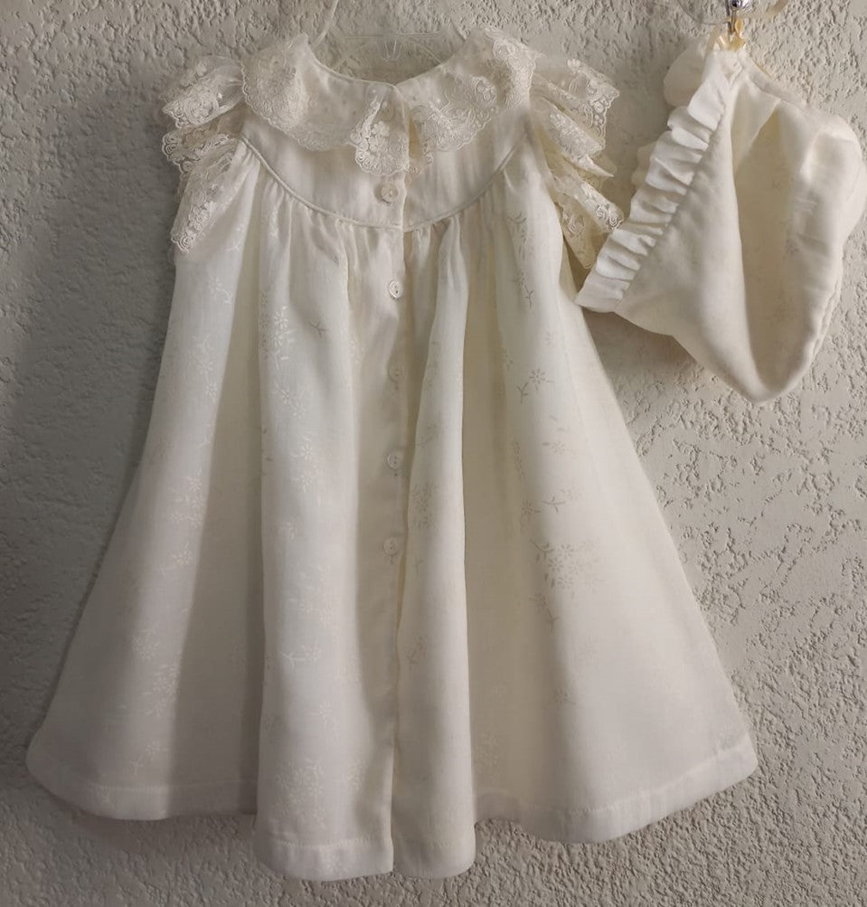 Ropón vestido largo de algodón color crudo y estampado de flores, con punta de tul bordado de flores en cuello y mangas, con gorro.