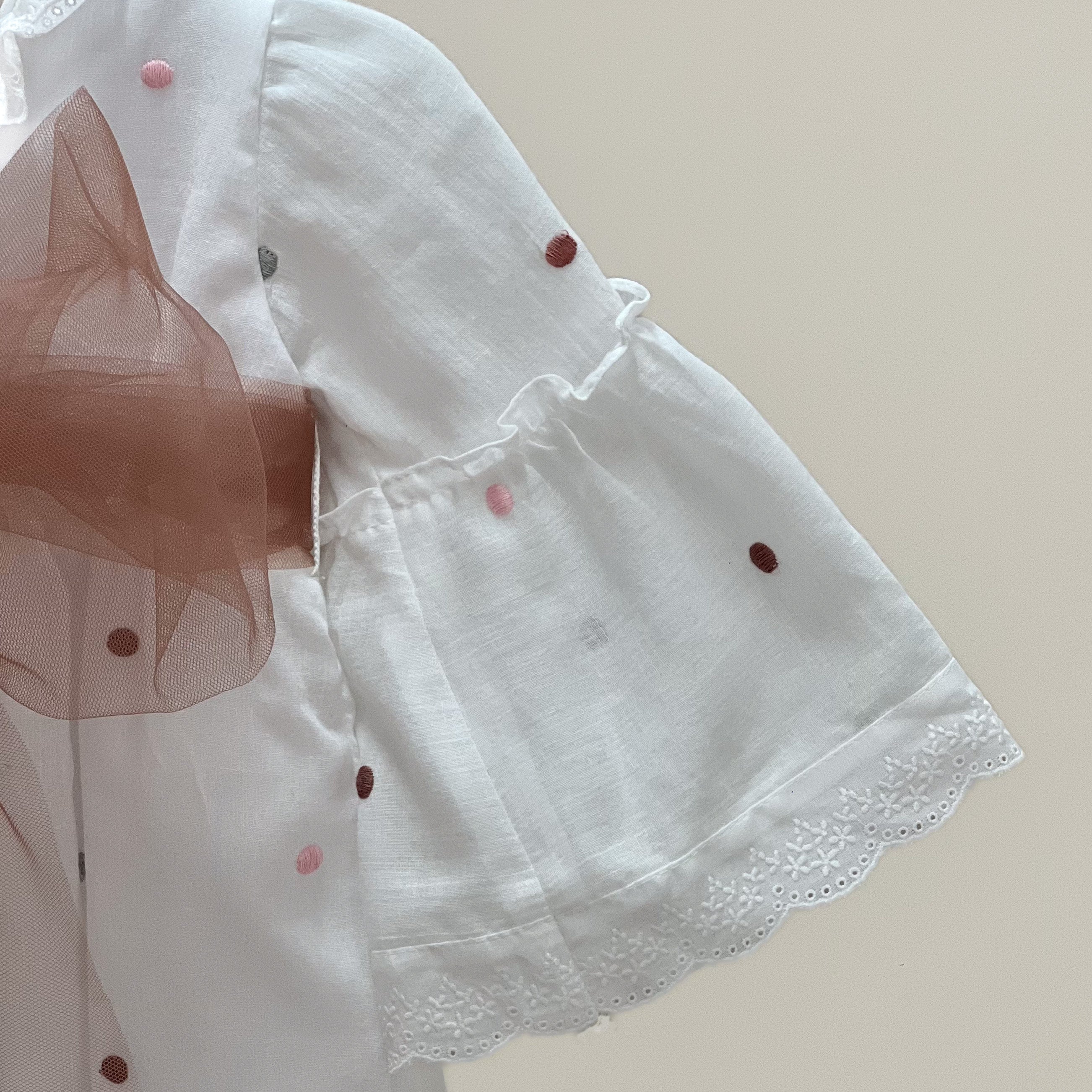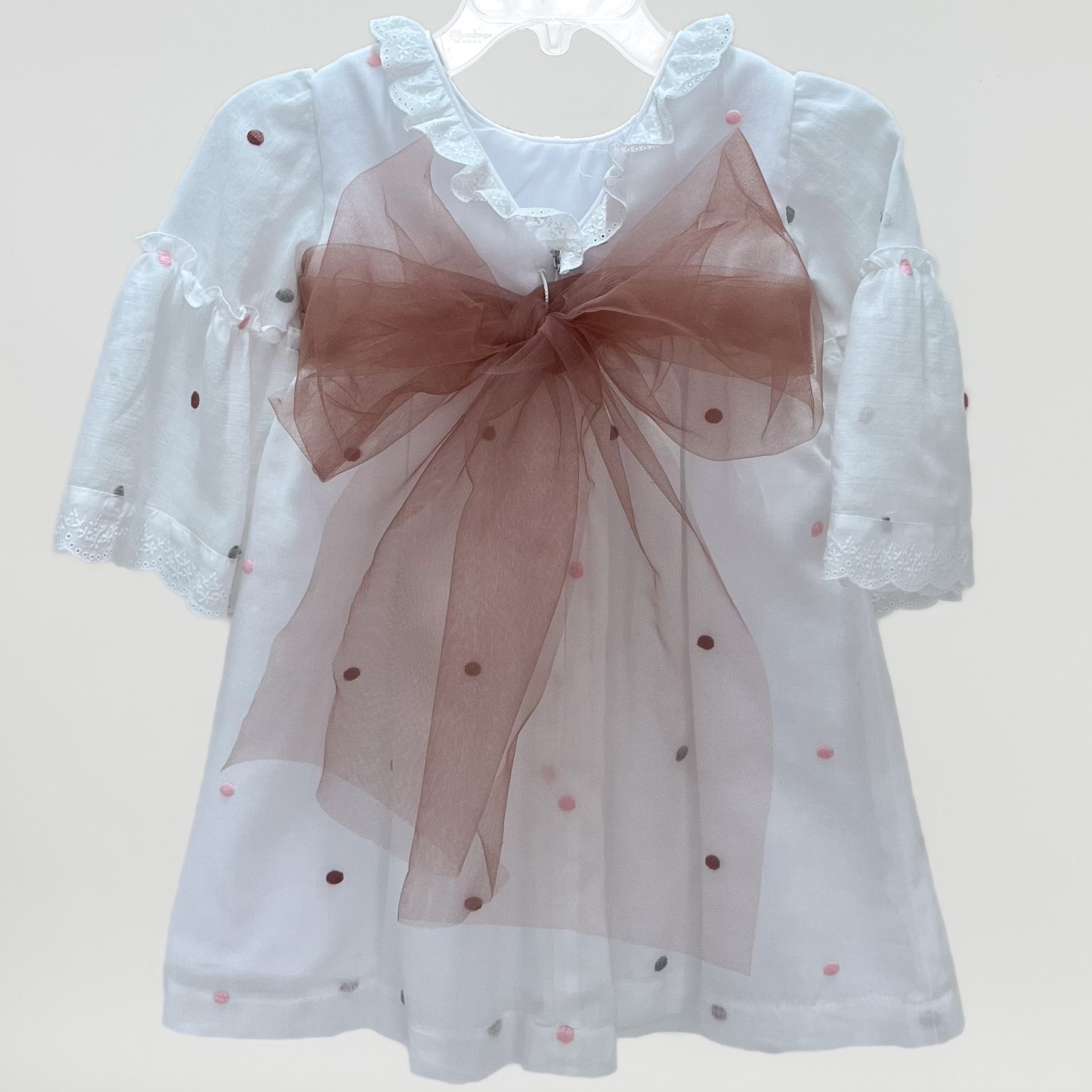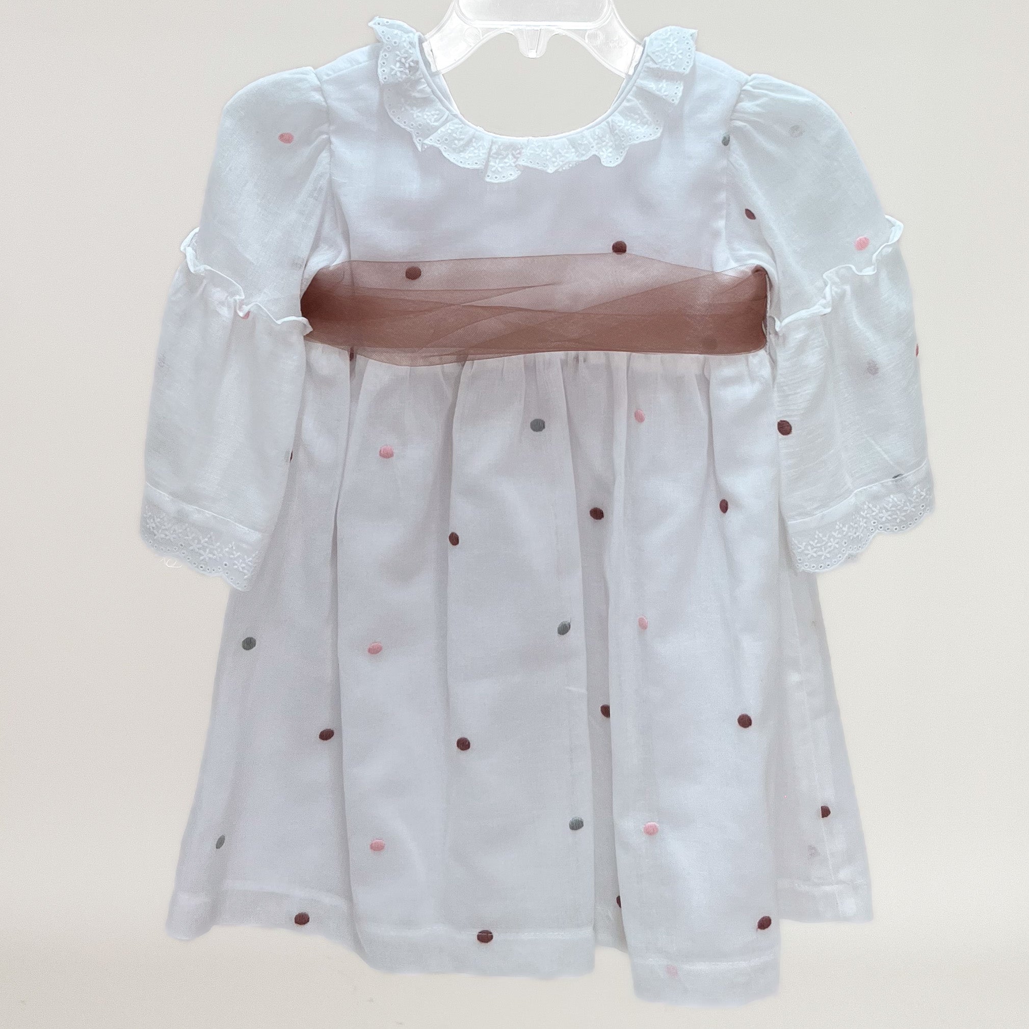 Vestido de algodón blanco bordado de lunares vino, rosa y gris con punta de tira bordada en mangas y cuello, banda de tul liso en color vino formando moño en la parte de atrás.