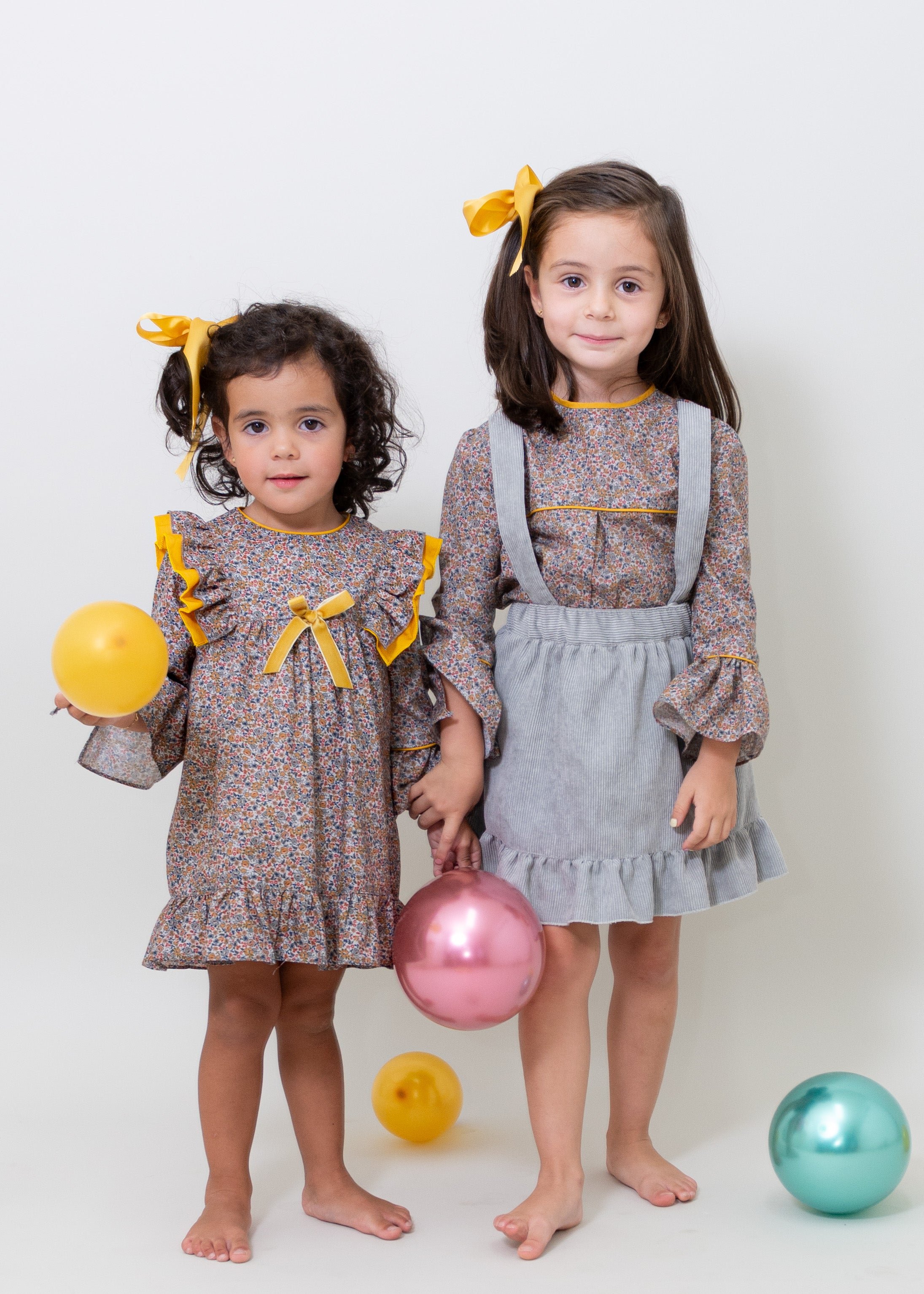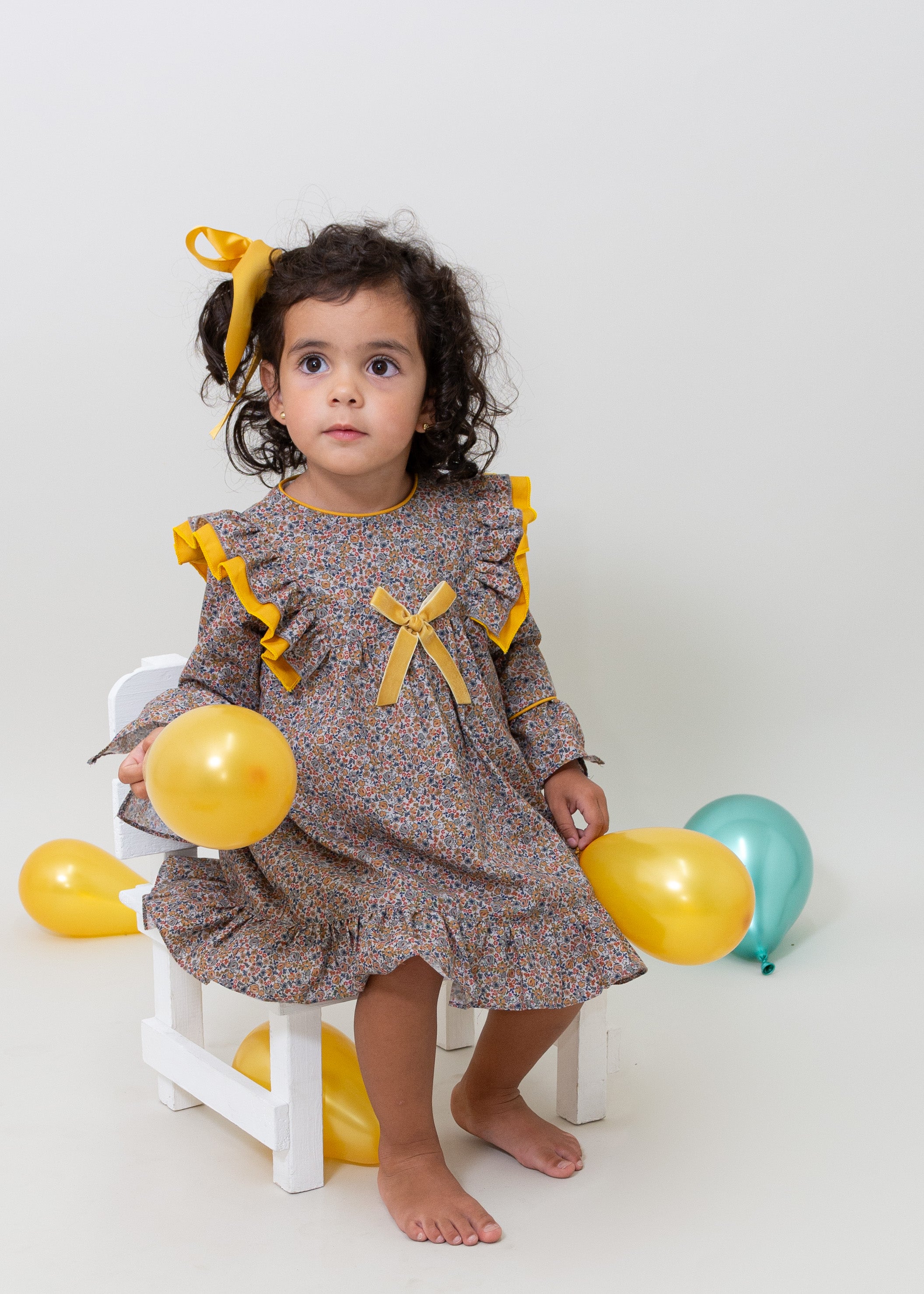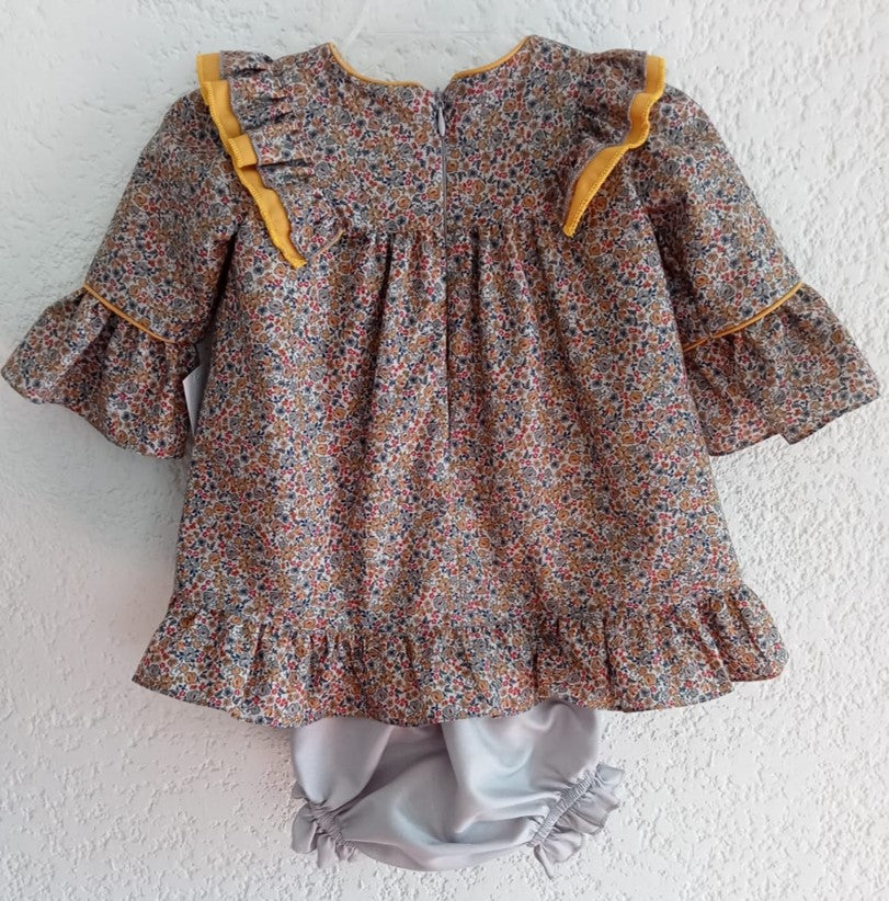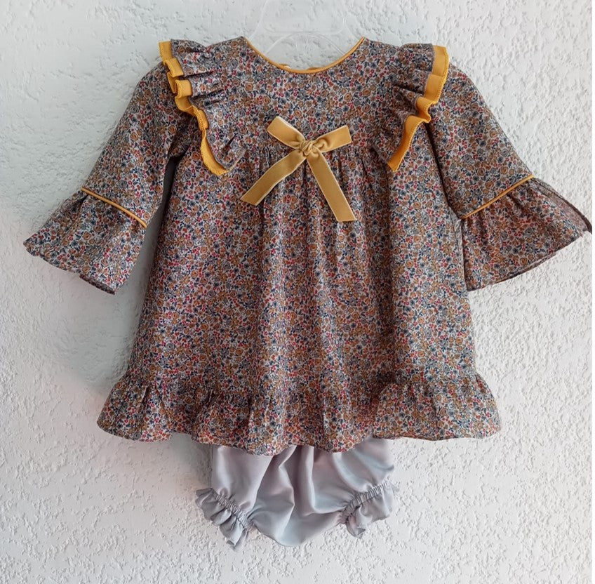 Vestido de algodón estampado de flores gris, con olán plisado en talle de algodón color mostaza. Moño de listón de terciopelo en talle. Cierre en espalda. Lleva calzón de algodón color gris con olan en piernas, de la talla 6 a 24 meses.