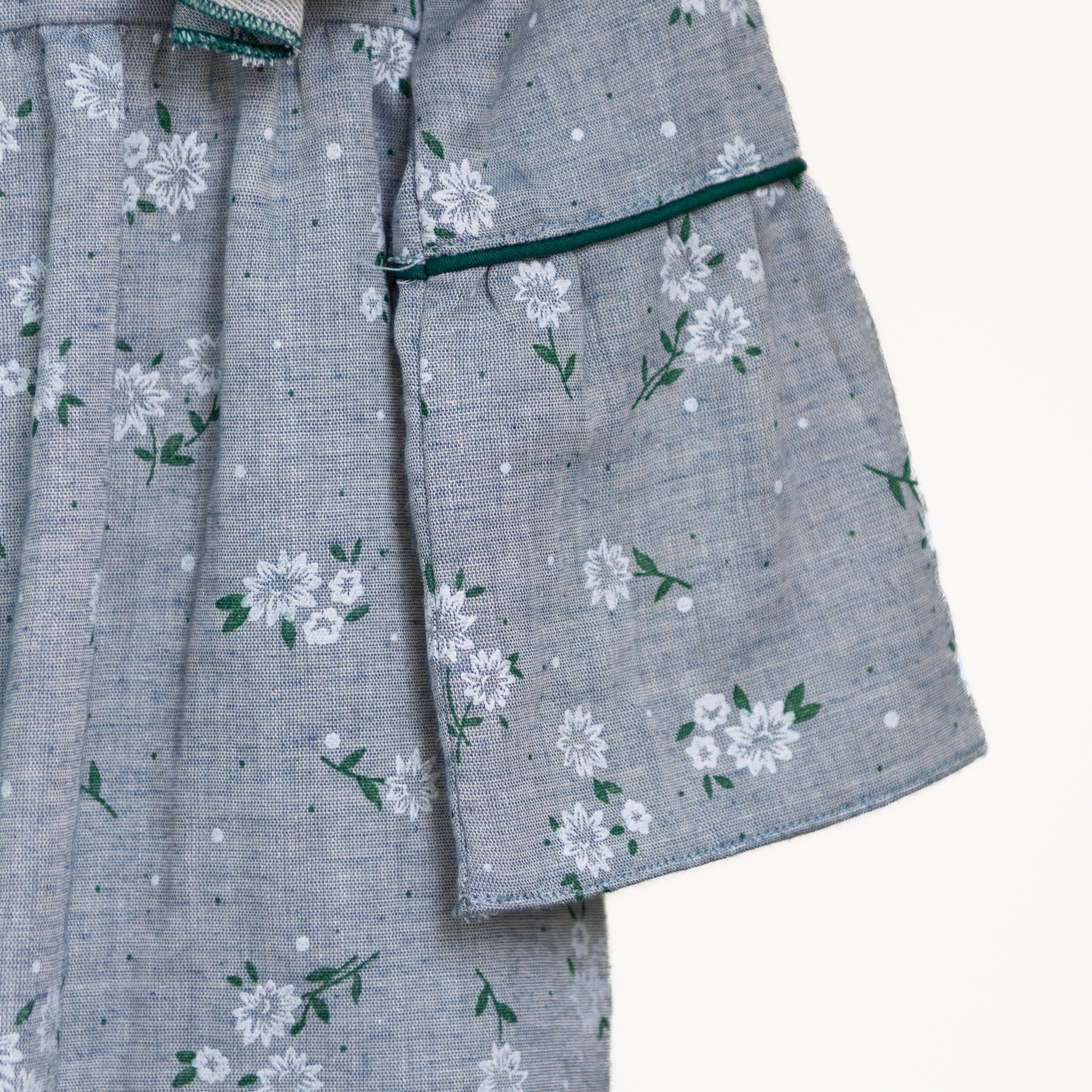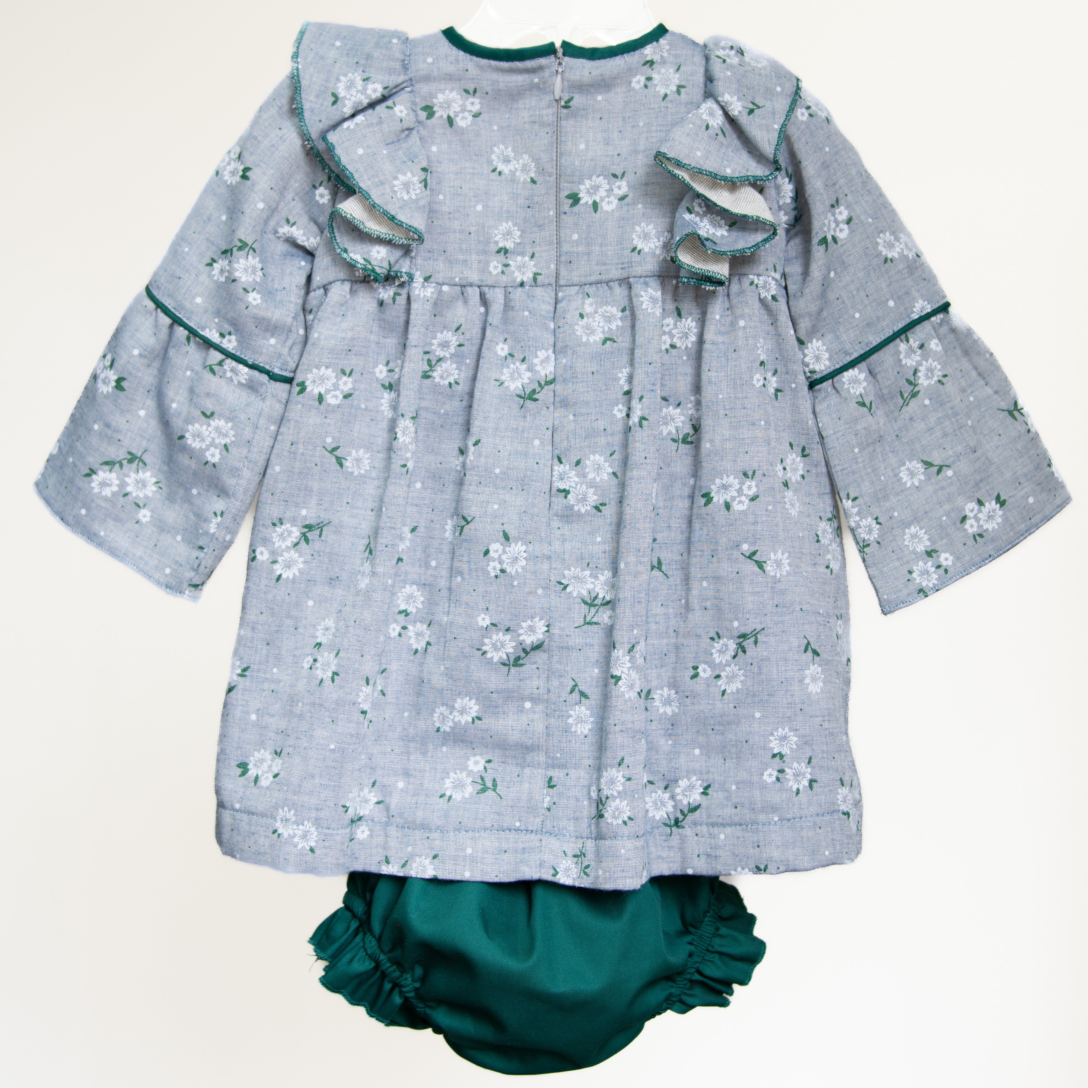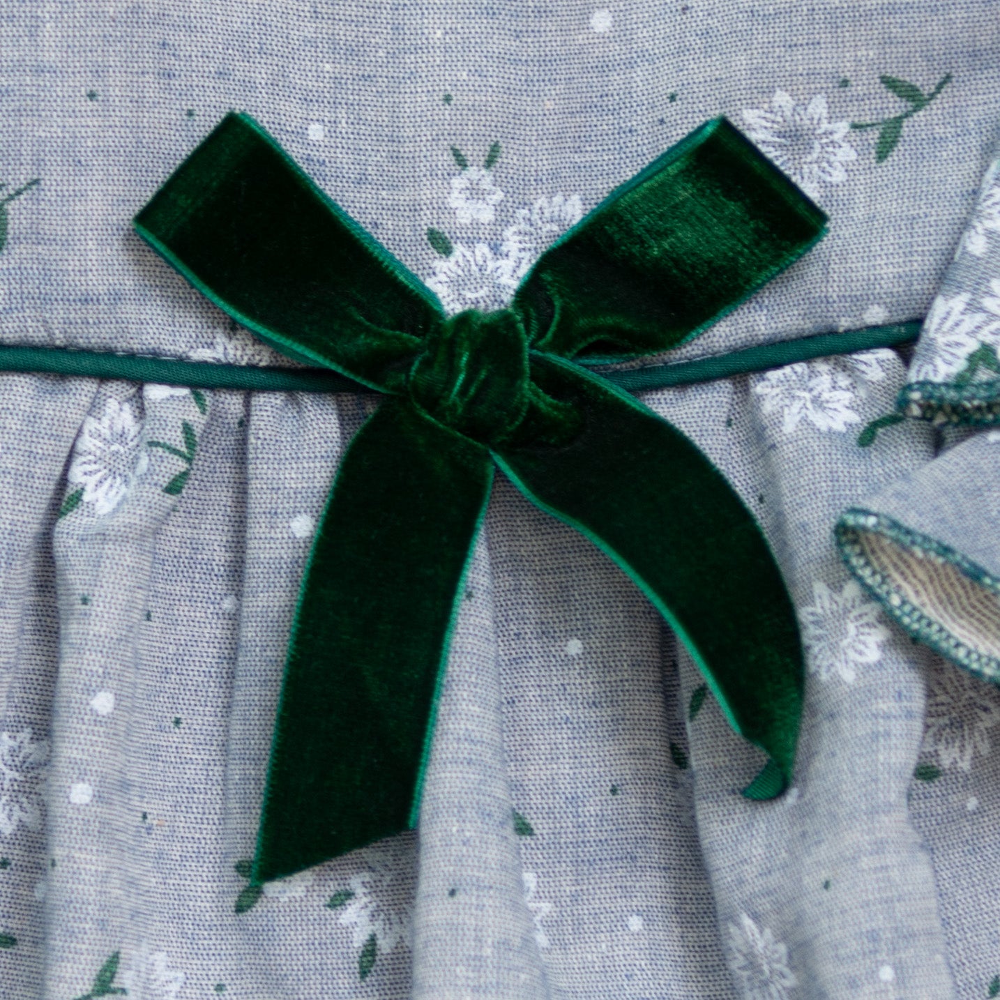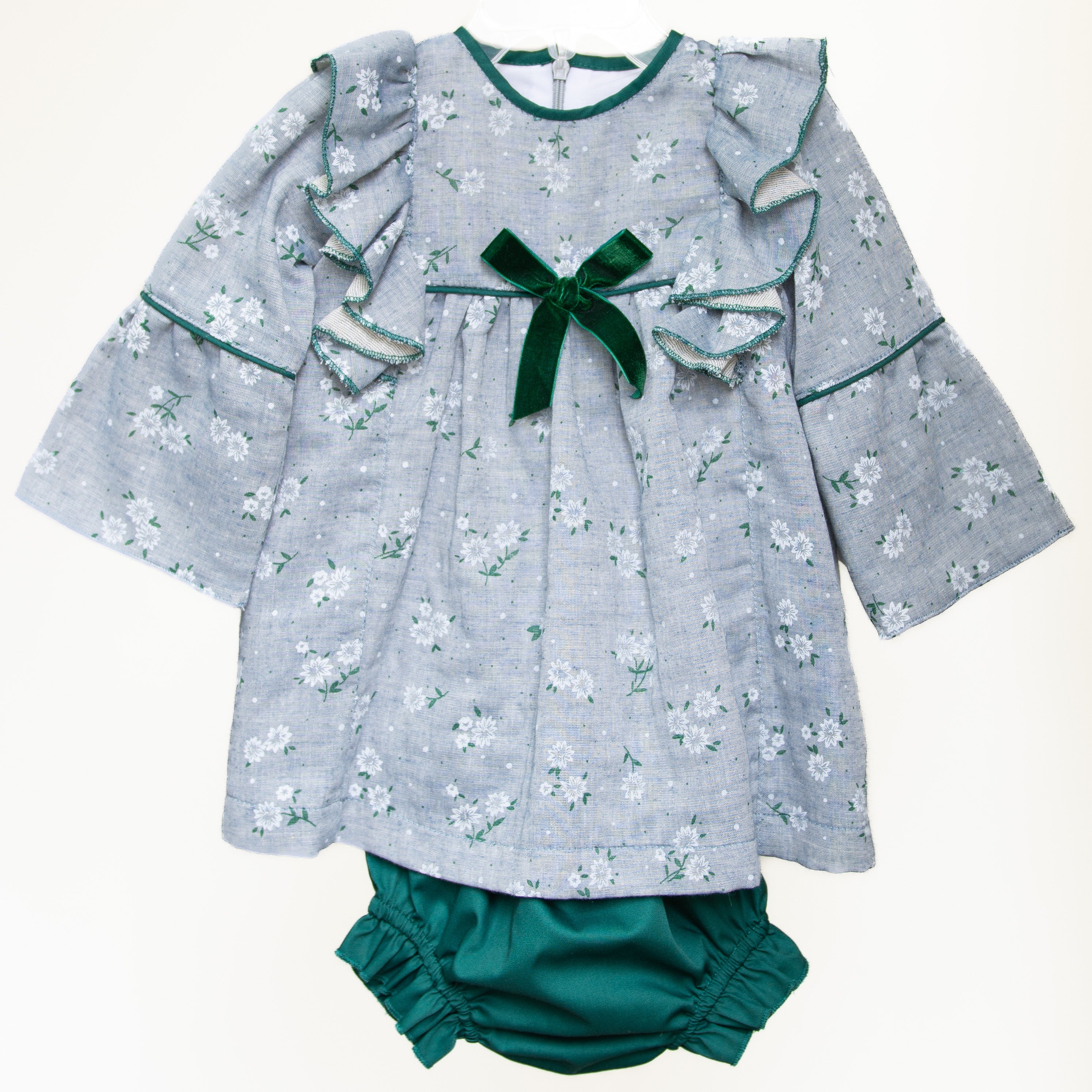 Vestido de algodón estampado de flores verde y blanco con olanes al frente y moño de listón terciopelo verde, con calzón de talla 6 a 24 meses.