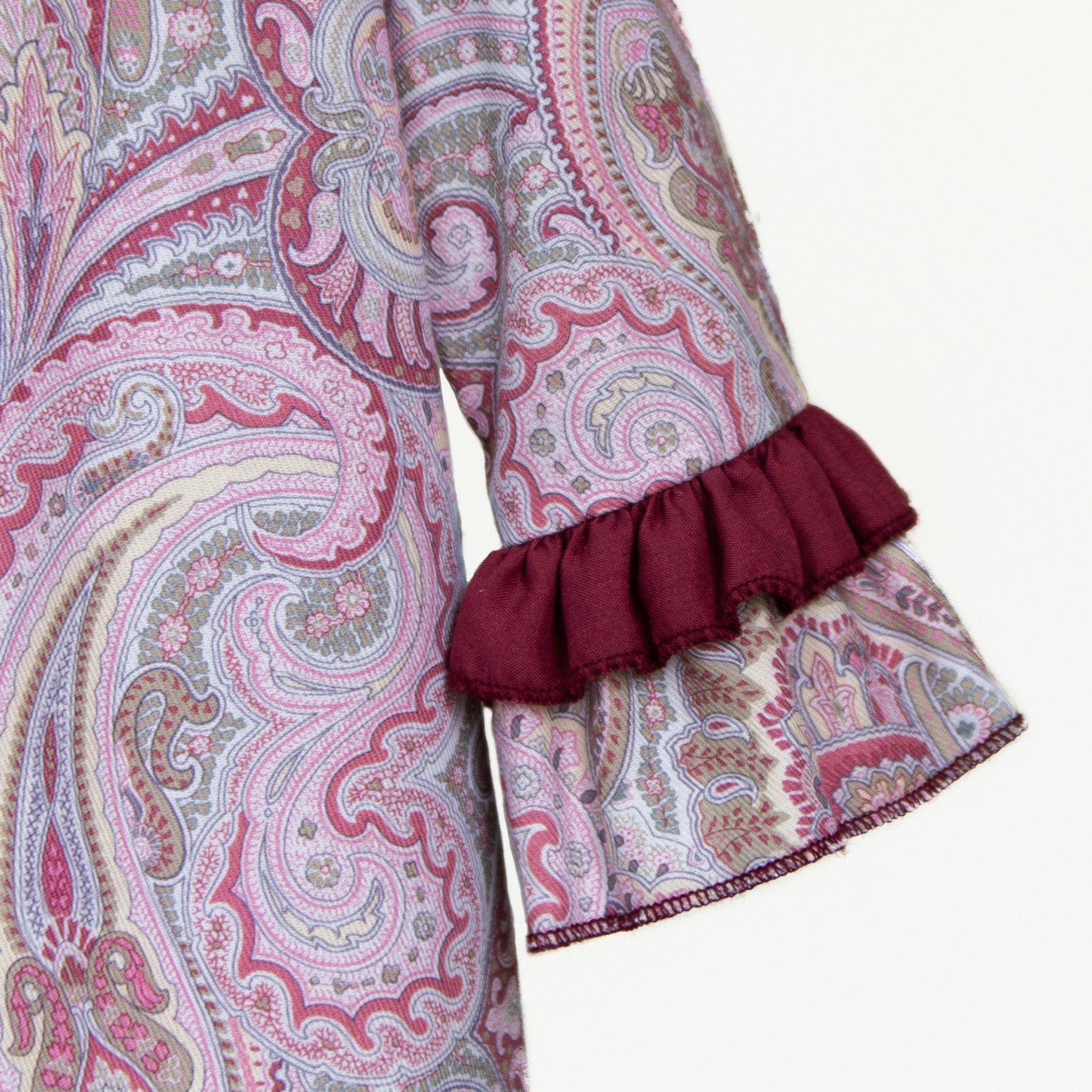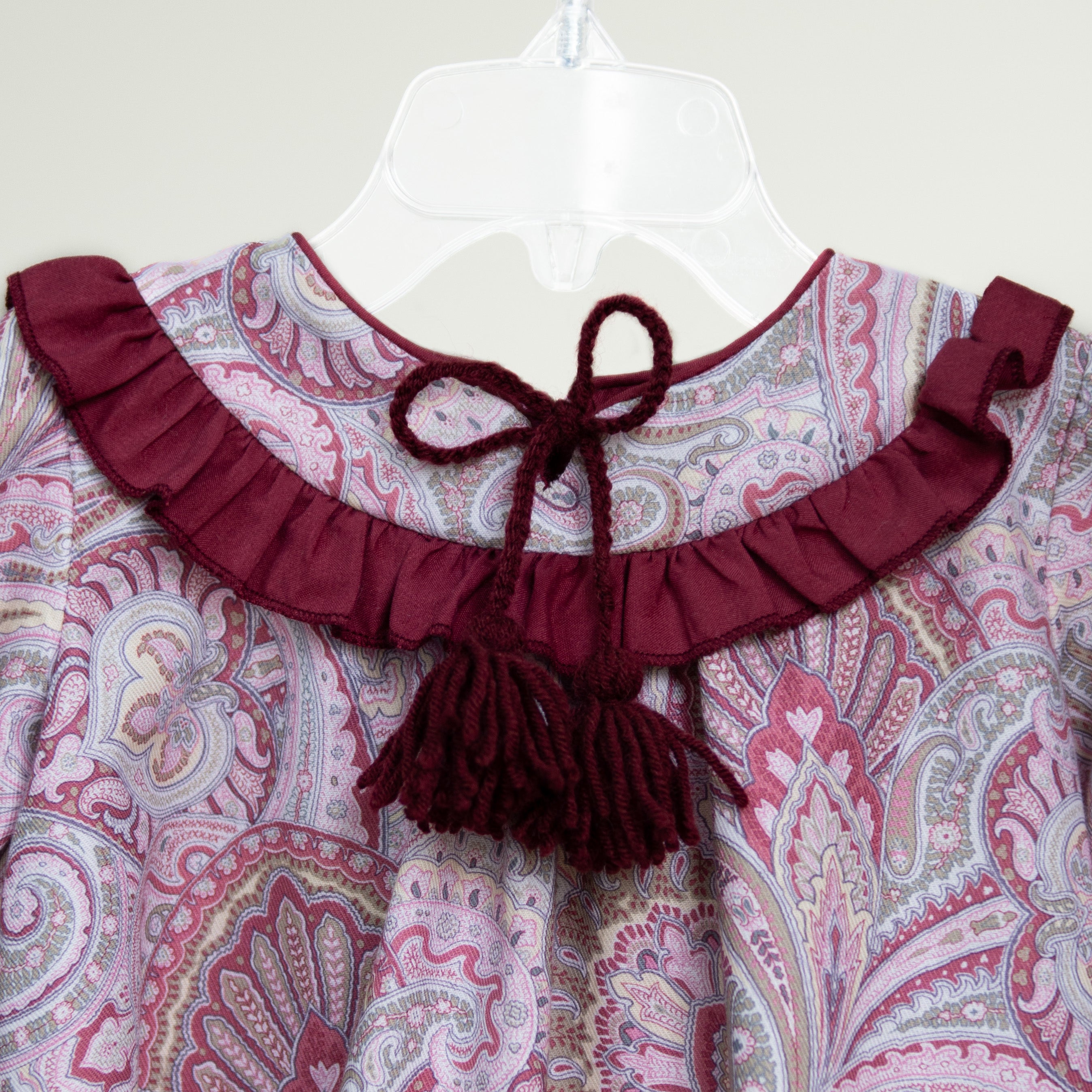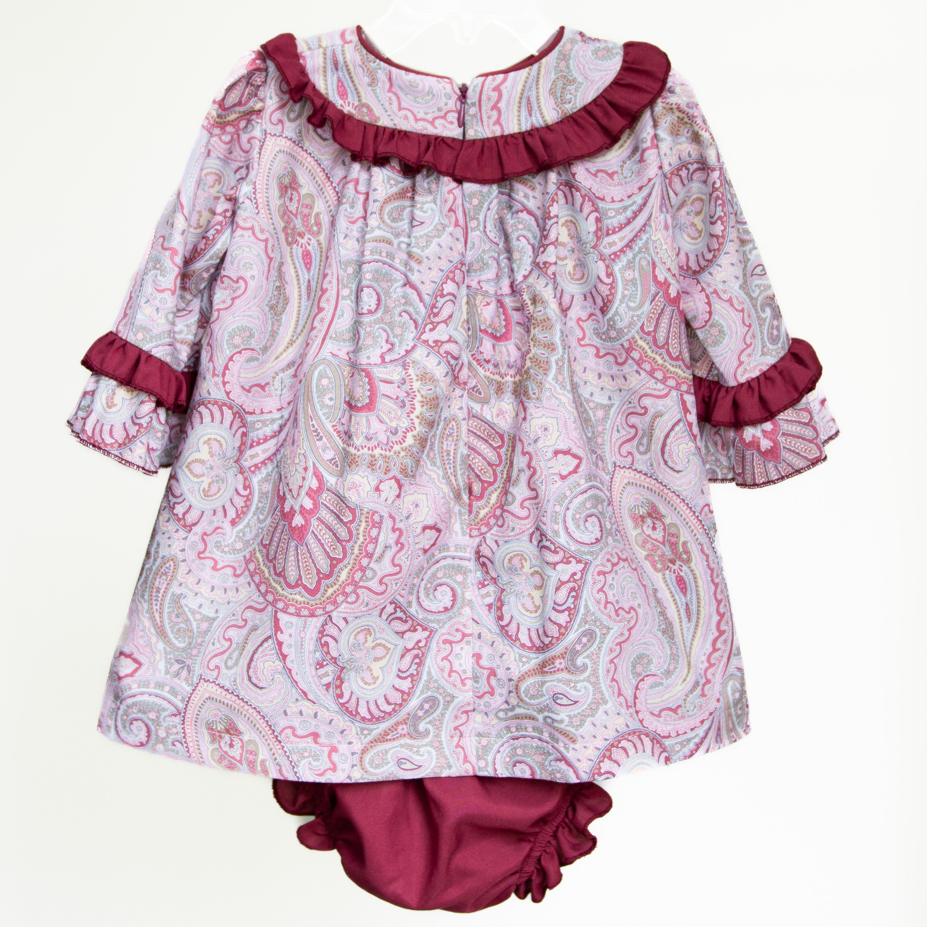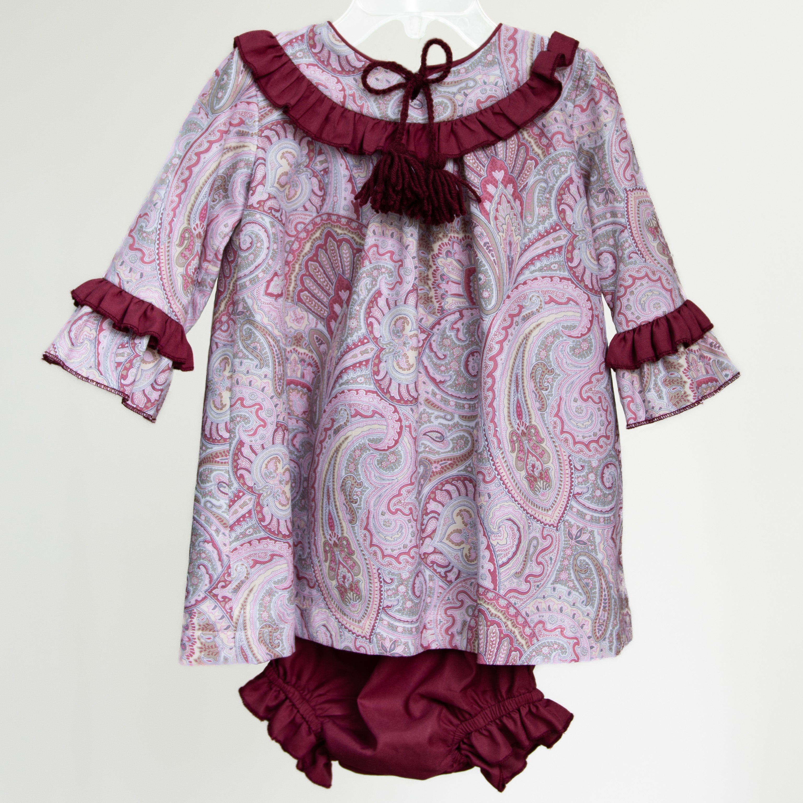 Vestido de algodón estampado de flores vino y rosa, combinado con olanes en vino, con calzón de talla 6 a 24 meses.