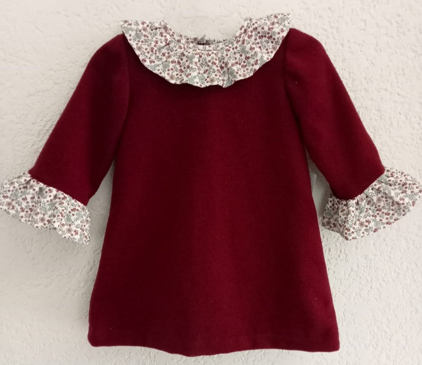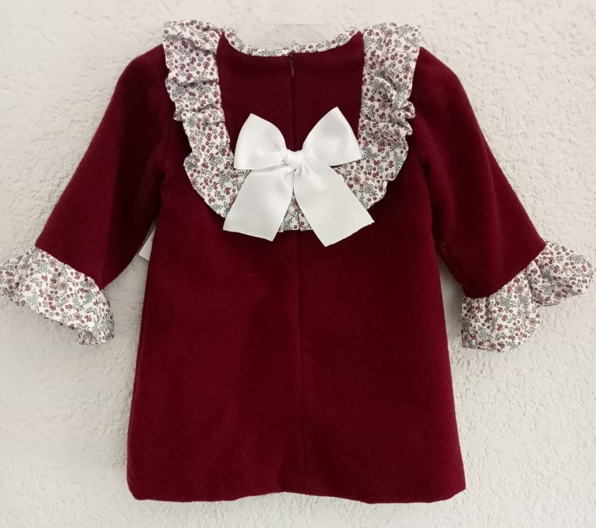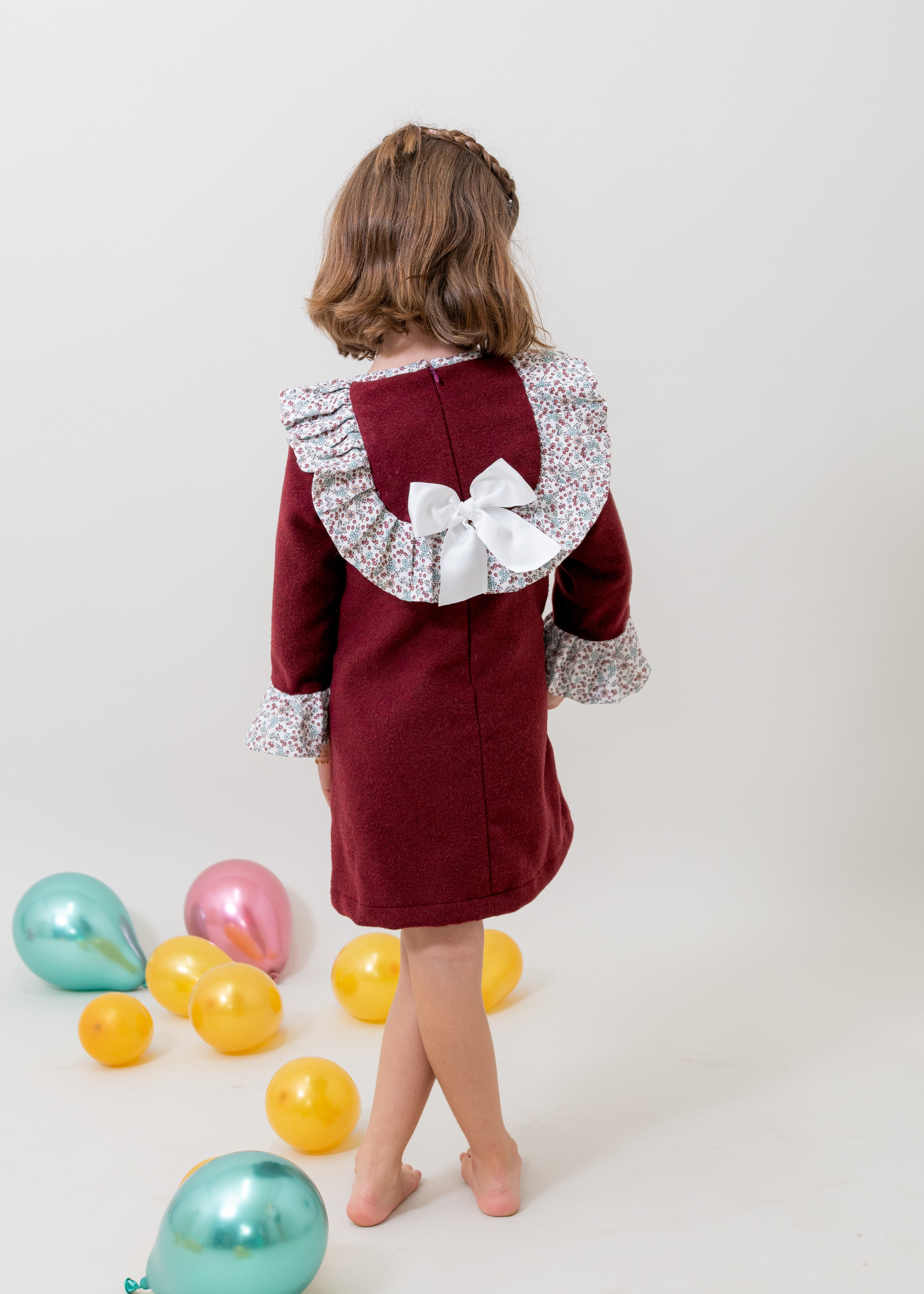 Vestido de lana vino con olán de algodón de flores tableado en mangas y en cuello y hasta espalda. Cierre en espalda, con moño de listón popotillo.