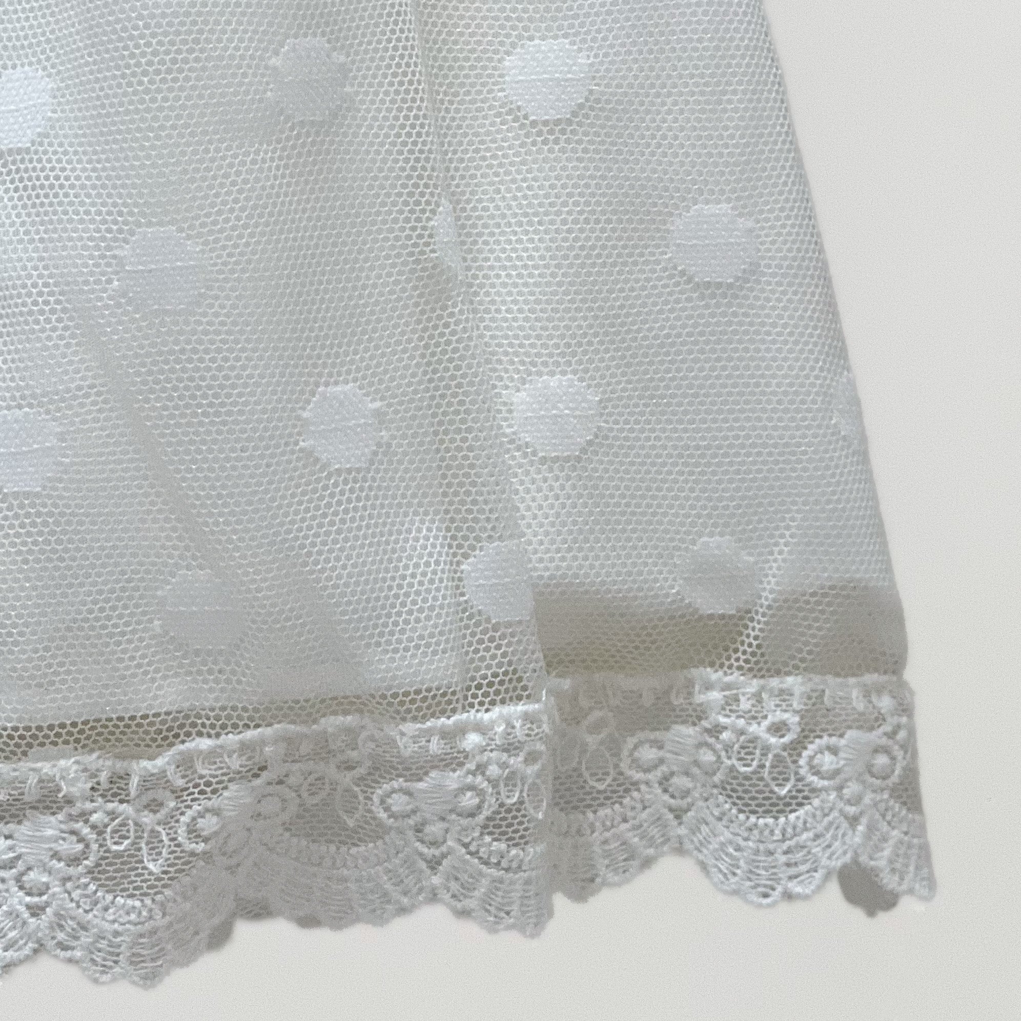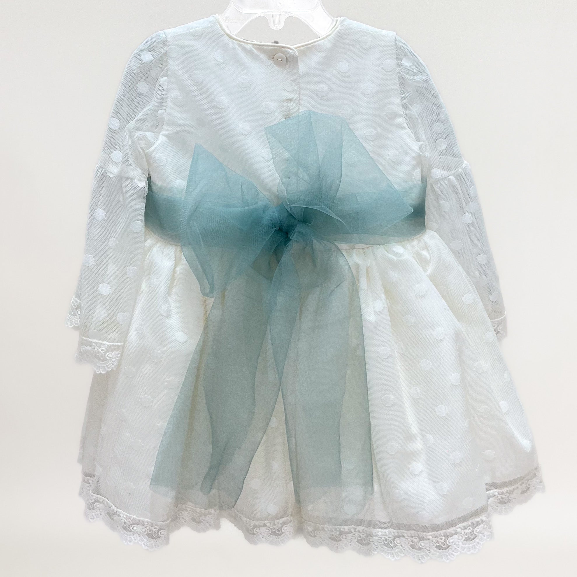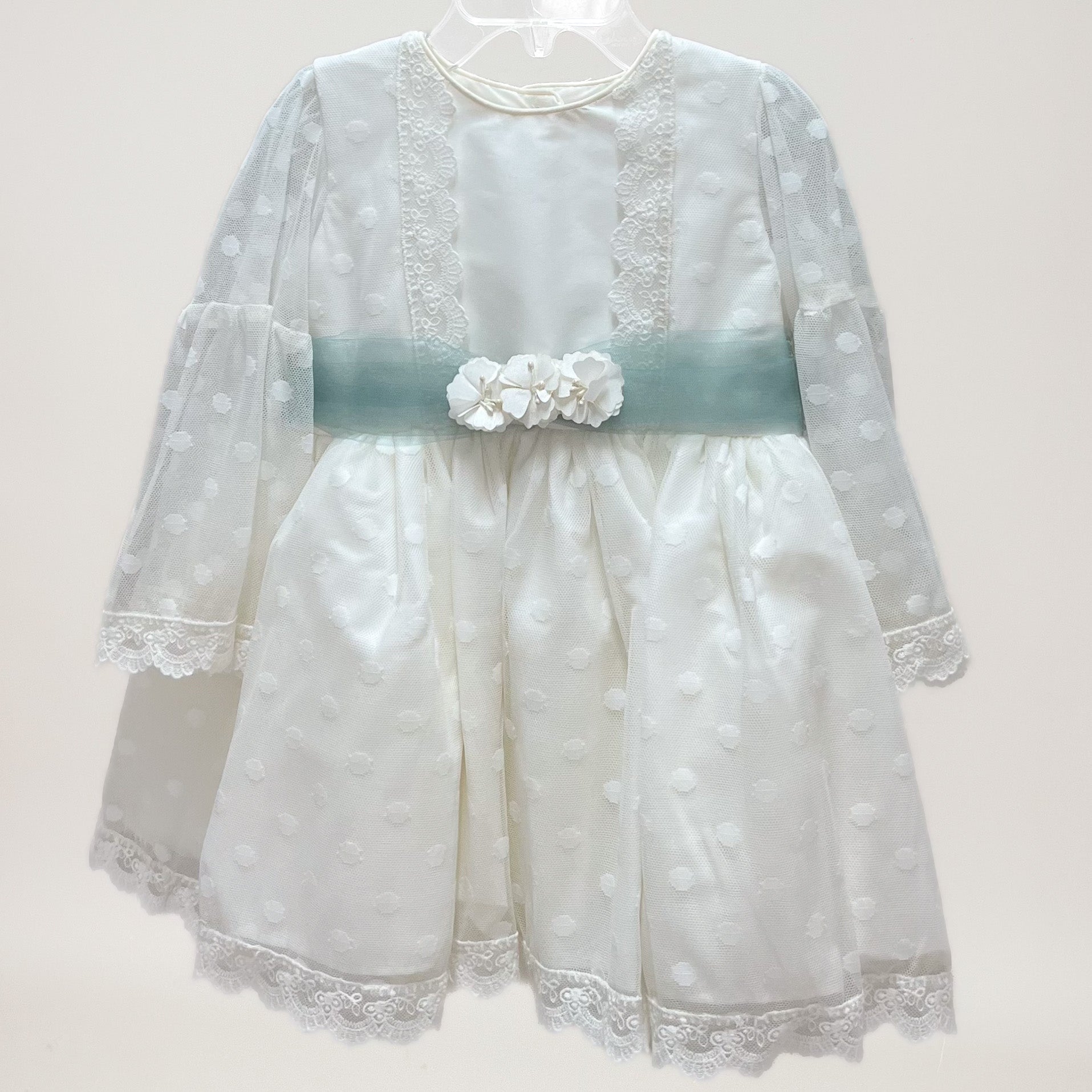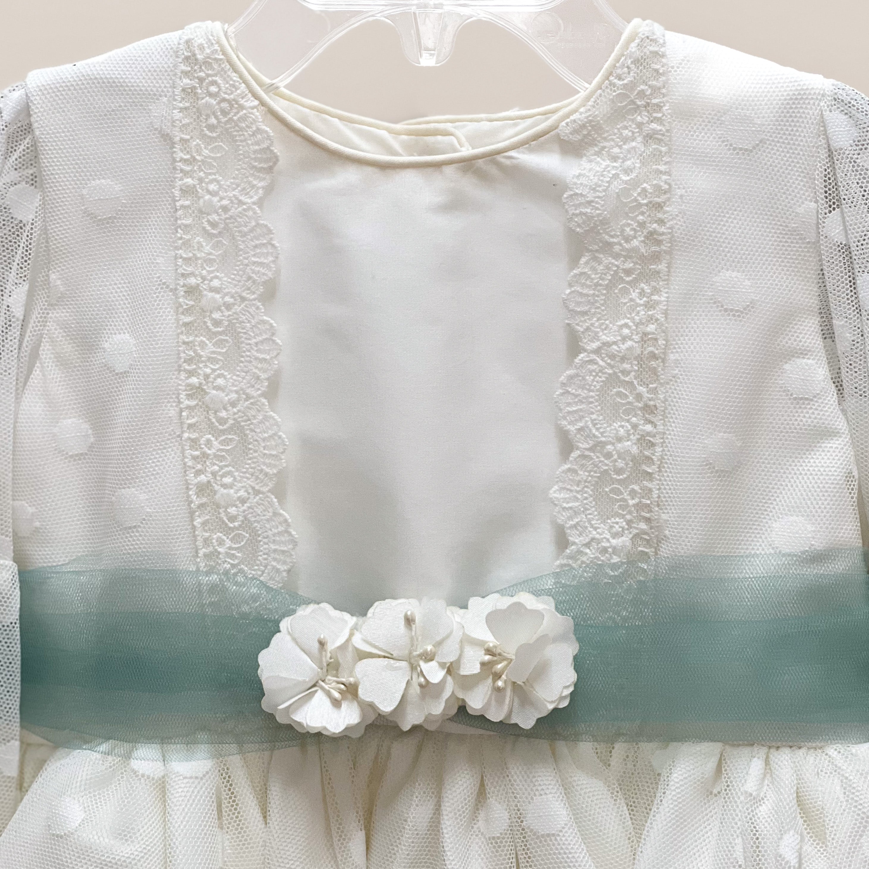 Vestido de tul estampado de lunares con punta de tul bordada de flores en mangas y falda, y banda de tul liso en colores y flor al centro.