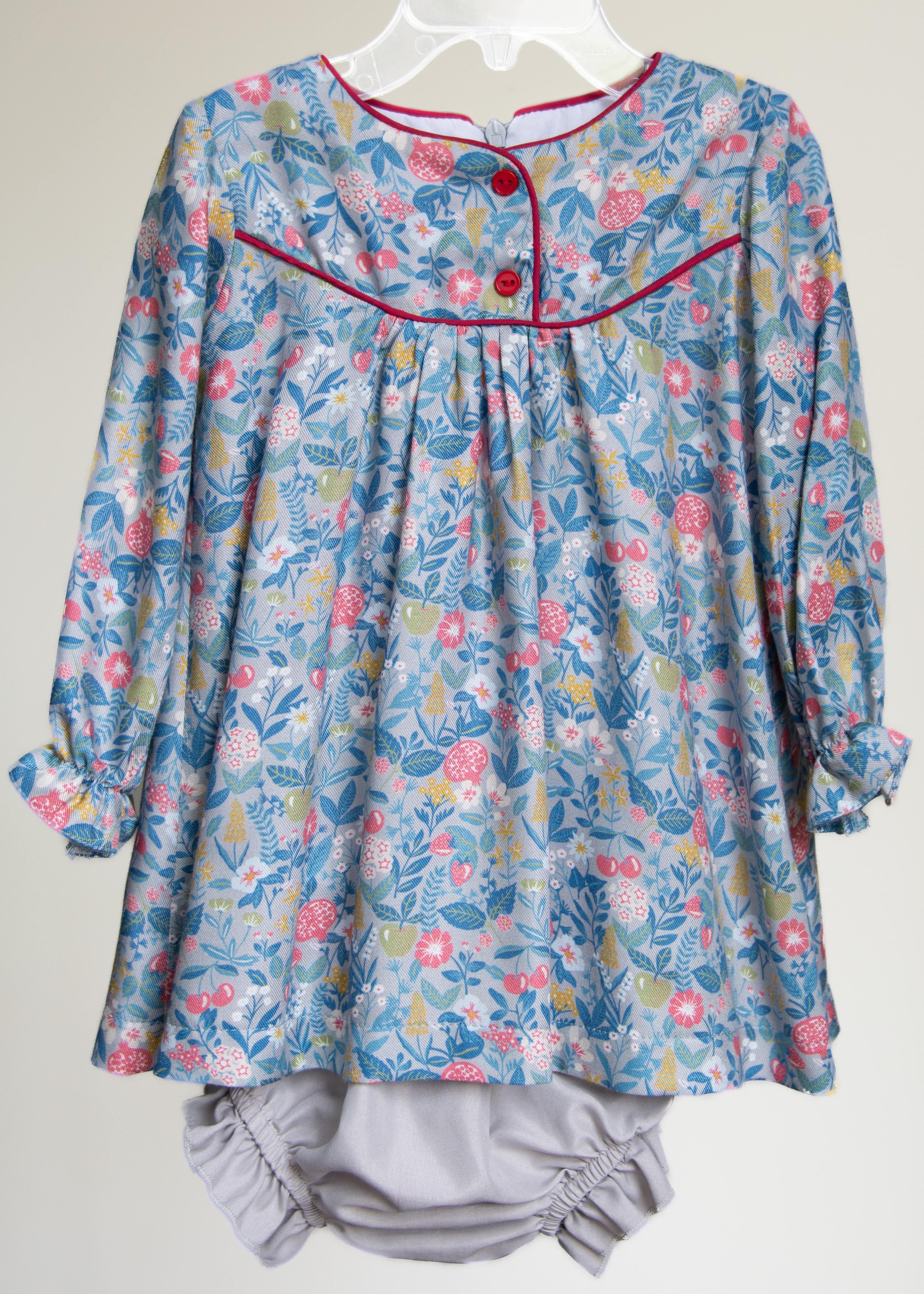 Vestido de viscosa estampada de cerezas, con bises y botones al frente con calzón de talla 6 a 24 meses.