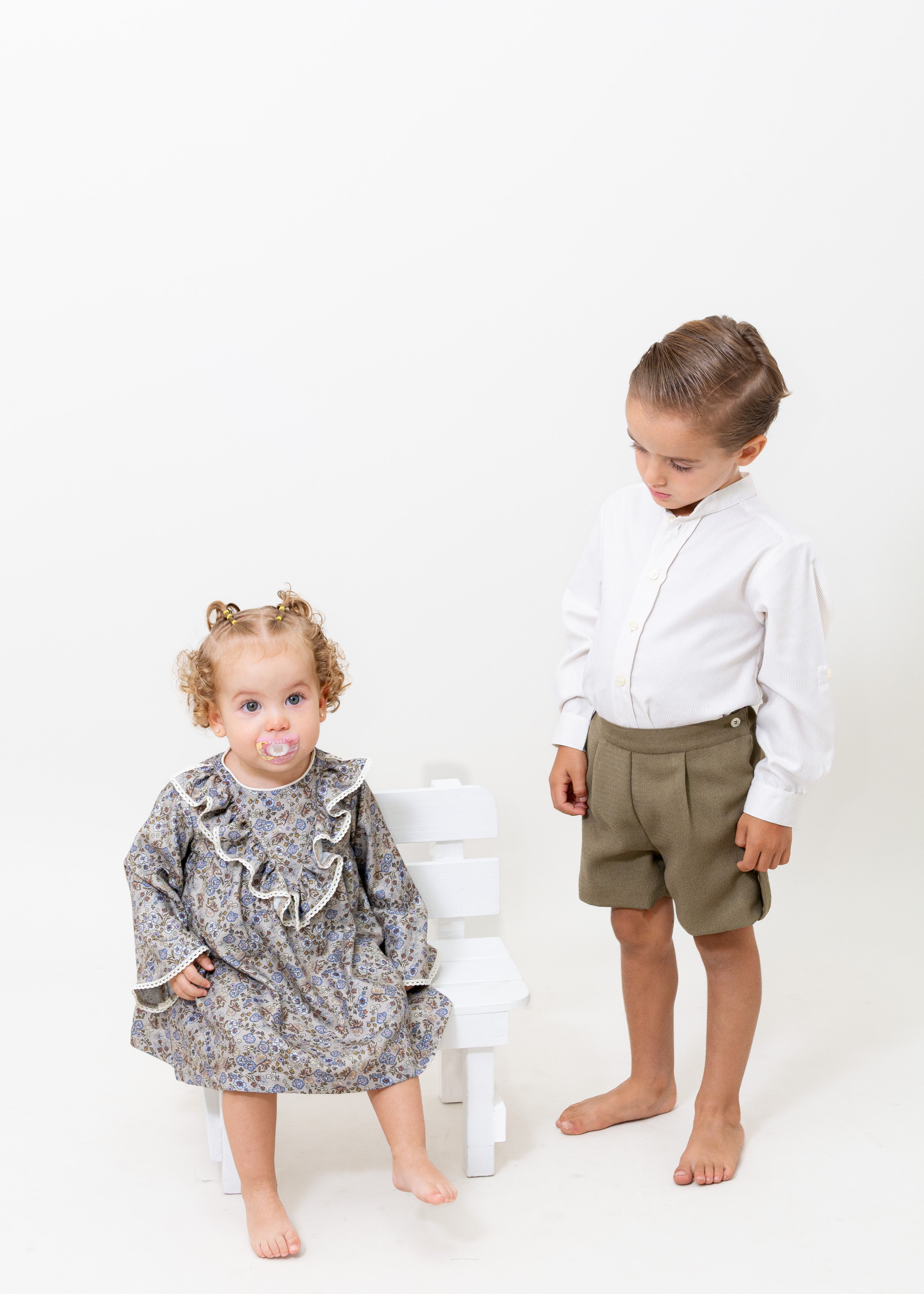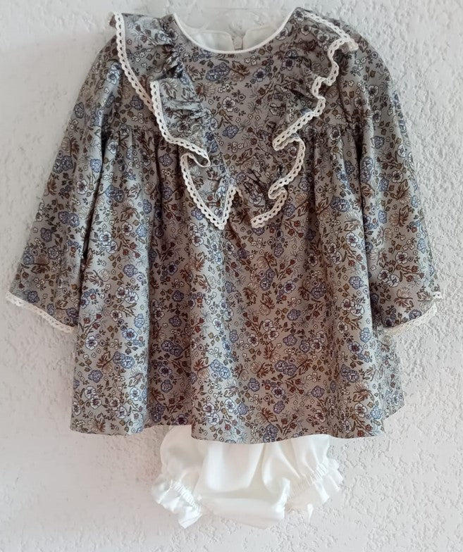 Vestido de viscosa verde estampada de flores con olán plisado de la misma tela rematado con punta de bolillo crudo, mangas rematadas con punta de bolillo. Cierre en espalda. Lleva calzón de algodón color crudo con olan en piernas, de la talla 6 a 24 meses.