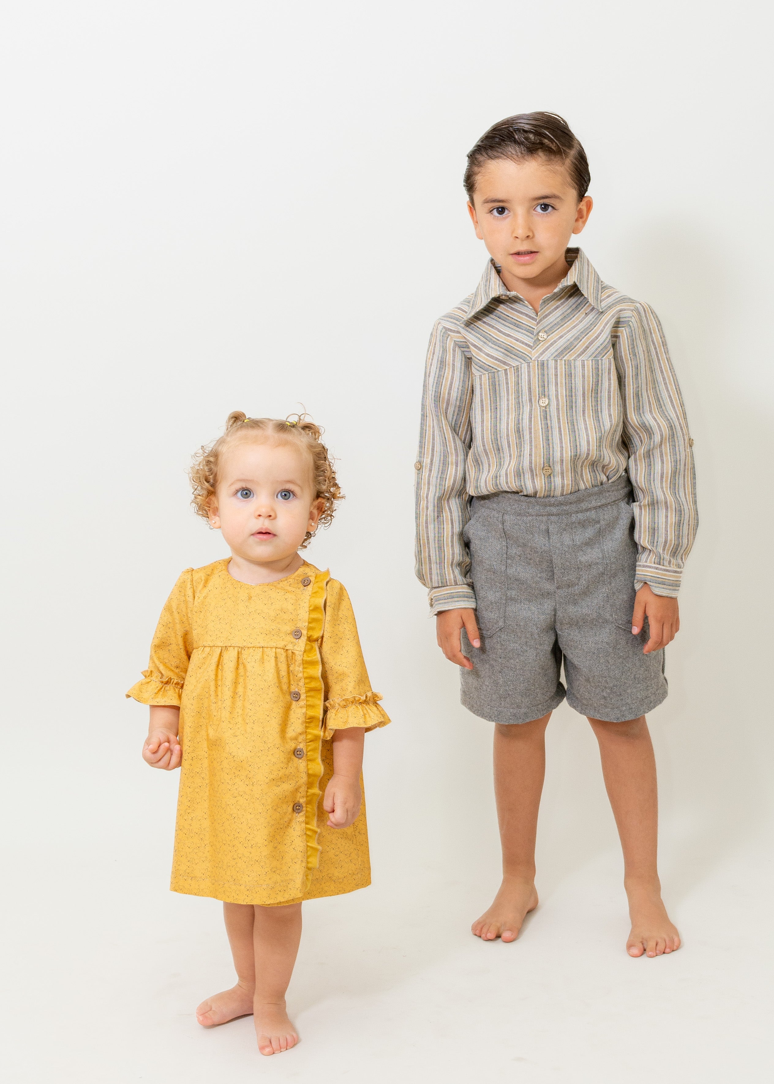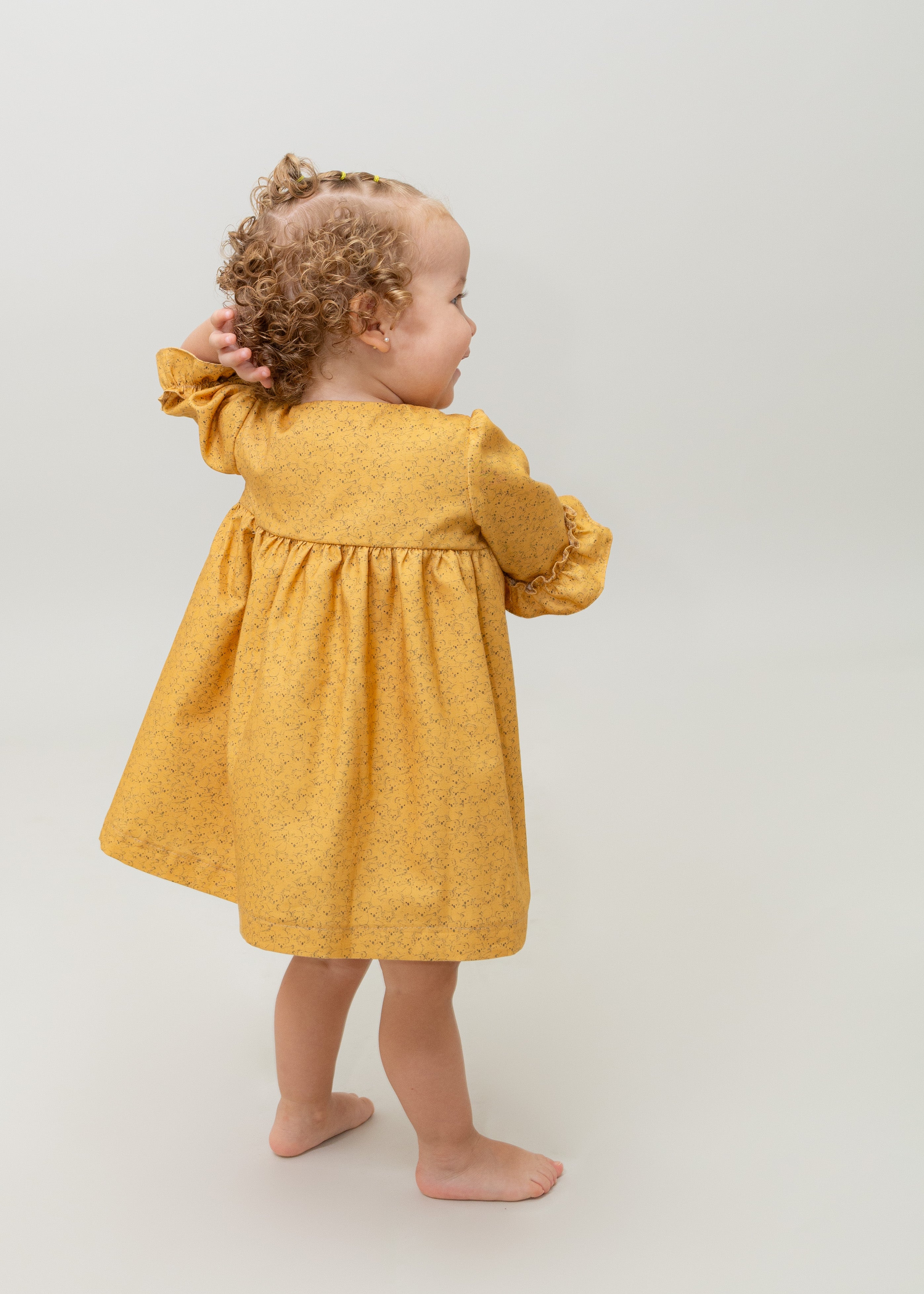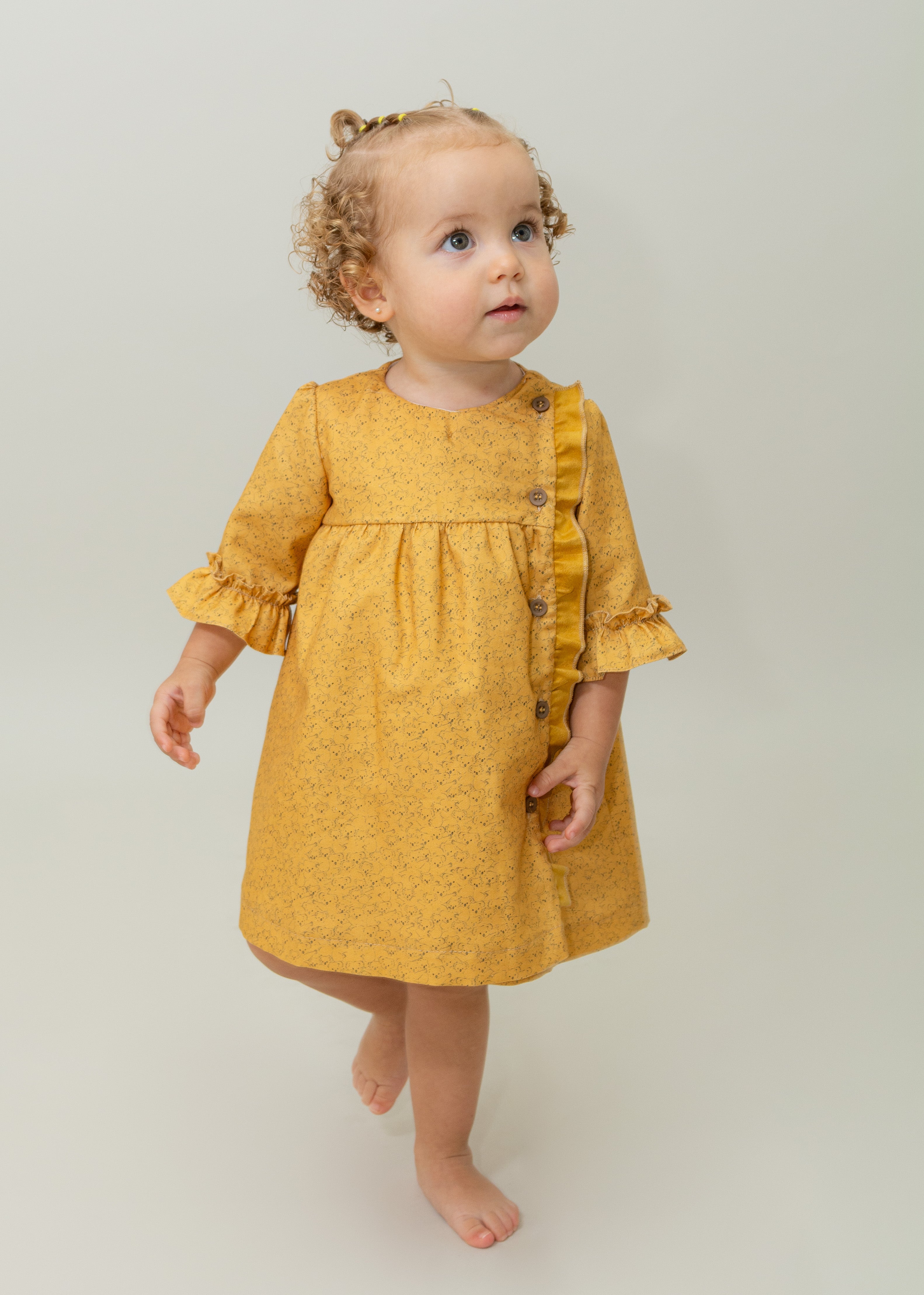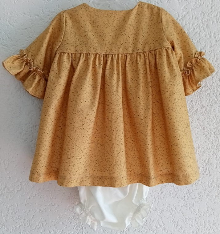 Vestido de viyella estampada de koalas, con olán de suede mostaza plisado a un costado , cruce y abotonadura al frente, manga con olán plisado. Lleva calzón de algodón color crudo con olan en piernas, de la talla 6 a 24 meses.